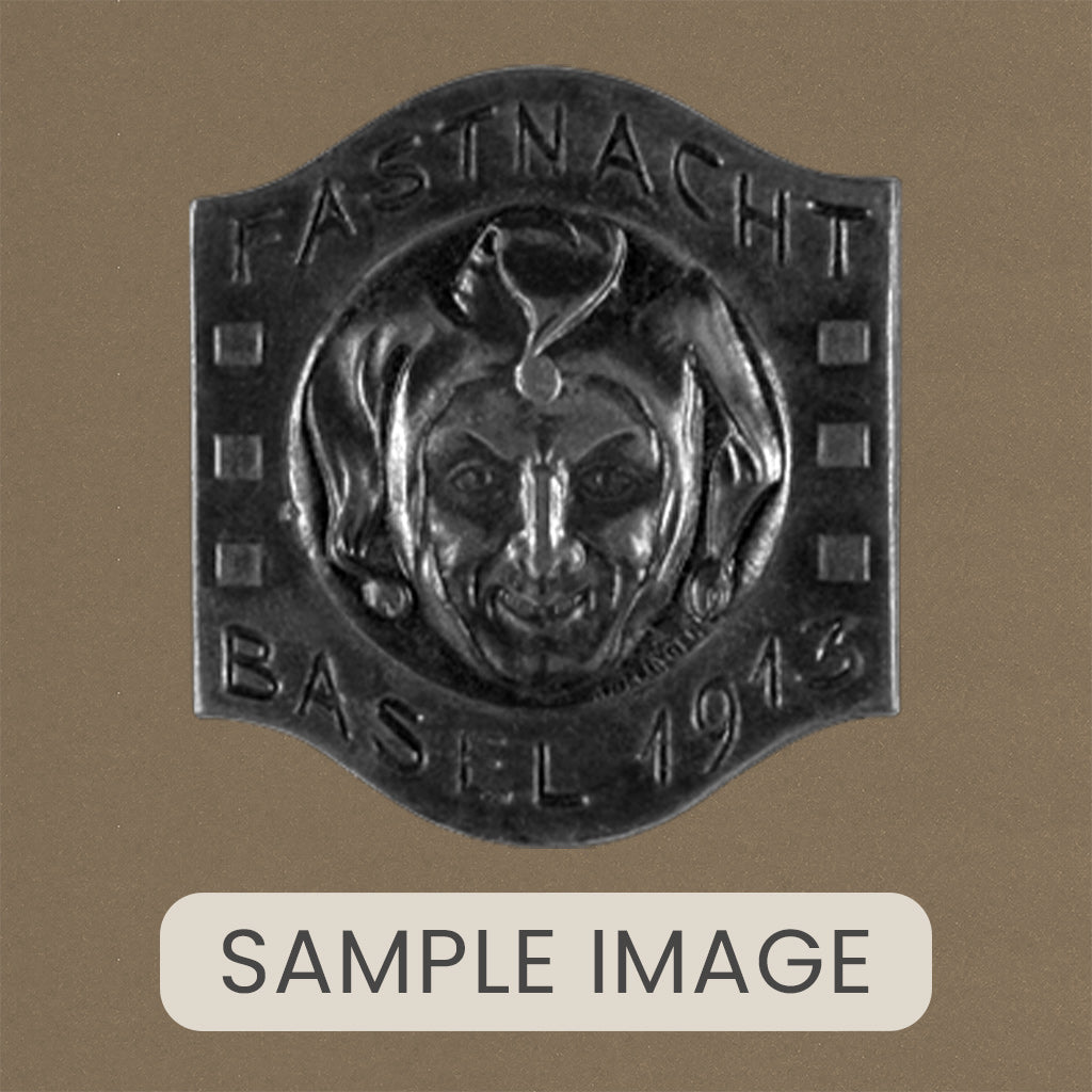 A handcrafted piece featuring a Blaggedde (Basel Fasnacht badge) from 1913. The theme of the year was "Ueli (Narrenkopf)" and the Blaggedde was designed by Wilhelm Dollinger.