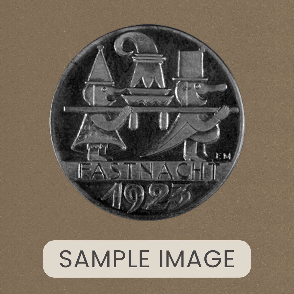 A handcrafted piece featuring a Blaggedde (Basel Fasnacht badge) from 1923. The theme of the year was "Buebezigli (D Ladärneträger)" and the Blaggedde was designed by Ernst Muhmenthaler.