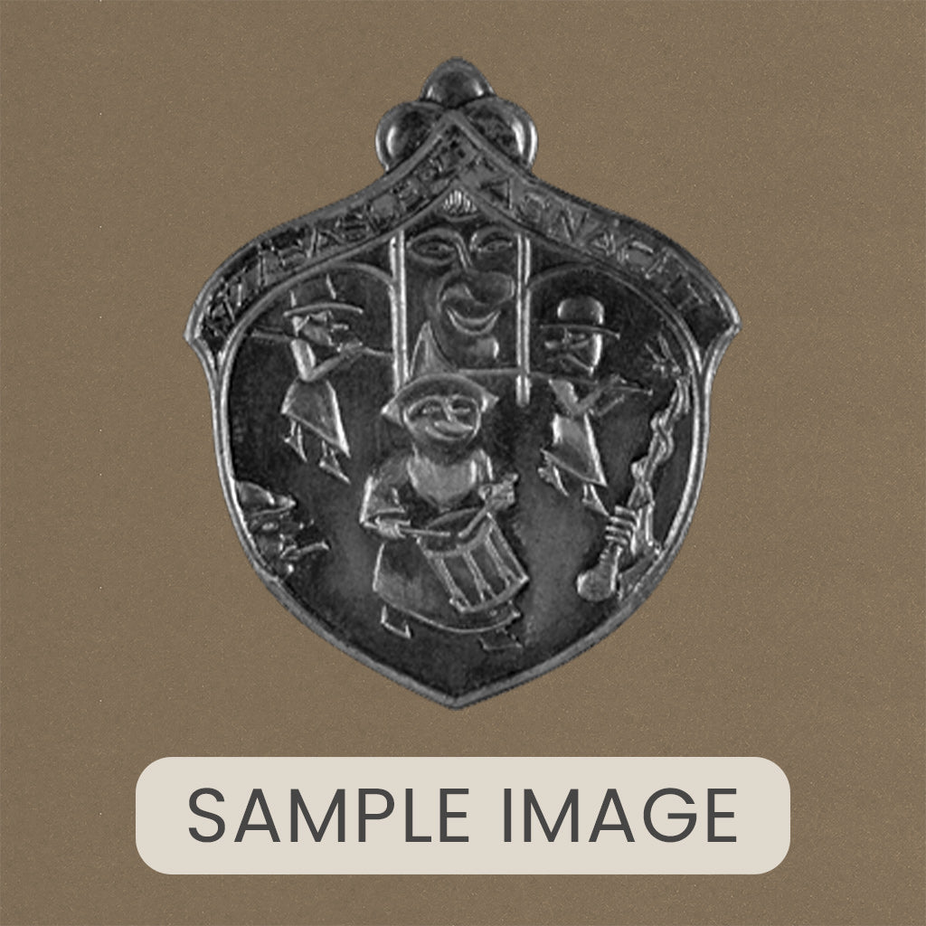 A handcrafted piece featuring a Blaggedde (Basel Fasnacht badge) from 1922. The theme of the year was "D Batzeglemmer" and the Blaggedde was designed by Emil Knöll.