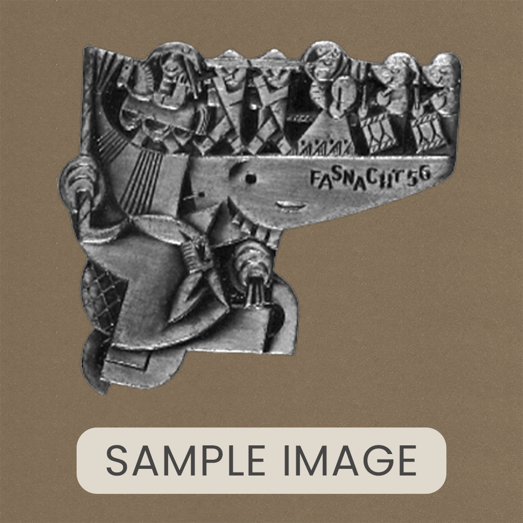 A handcrafted piece featuring a Blaggedde (Basel Fasnacht badge) from 1956. The theme of the year was "S het e Nase" and the Blaggedde was designed by Hanspeter Hort.