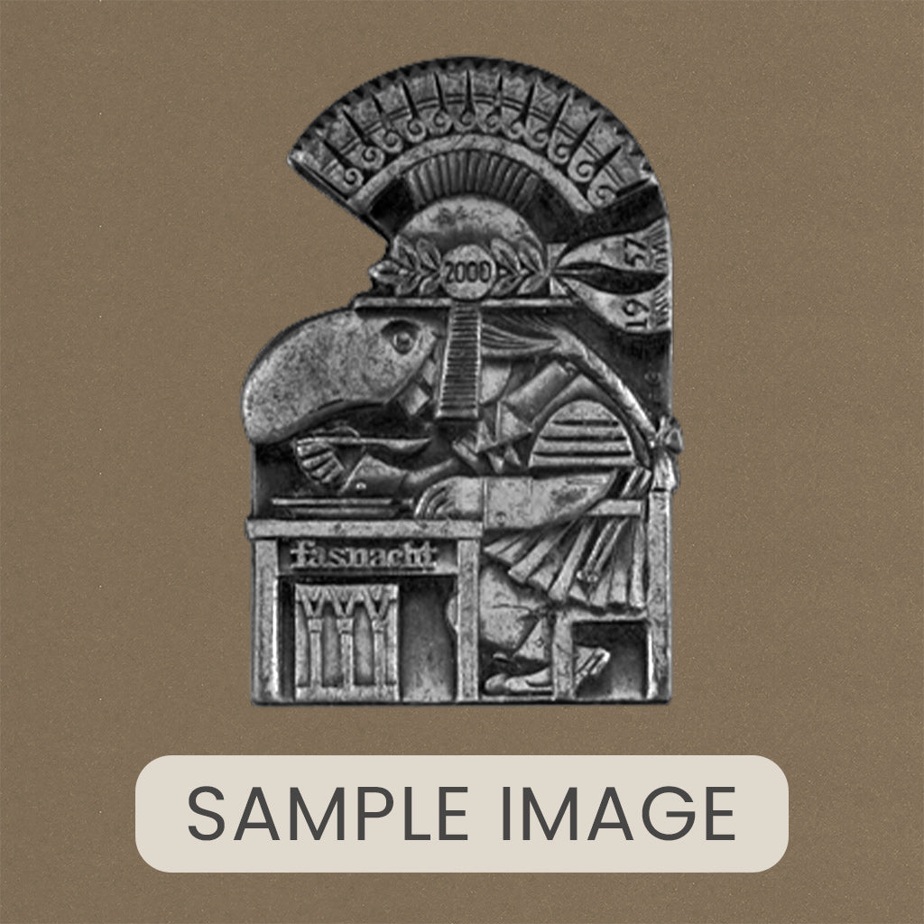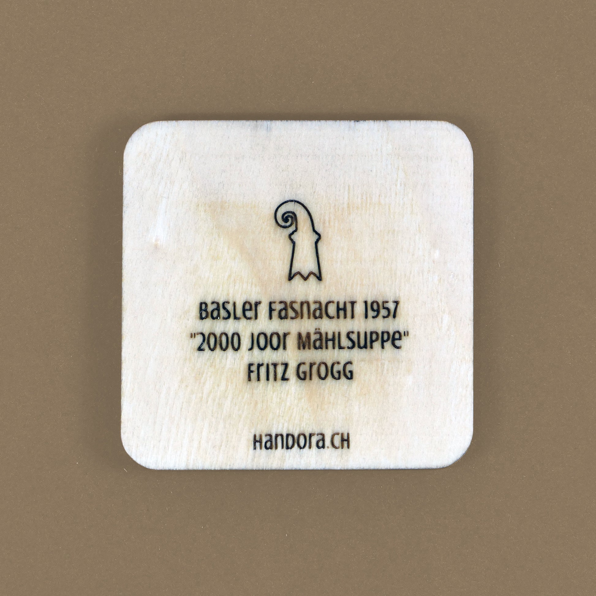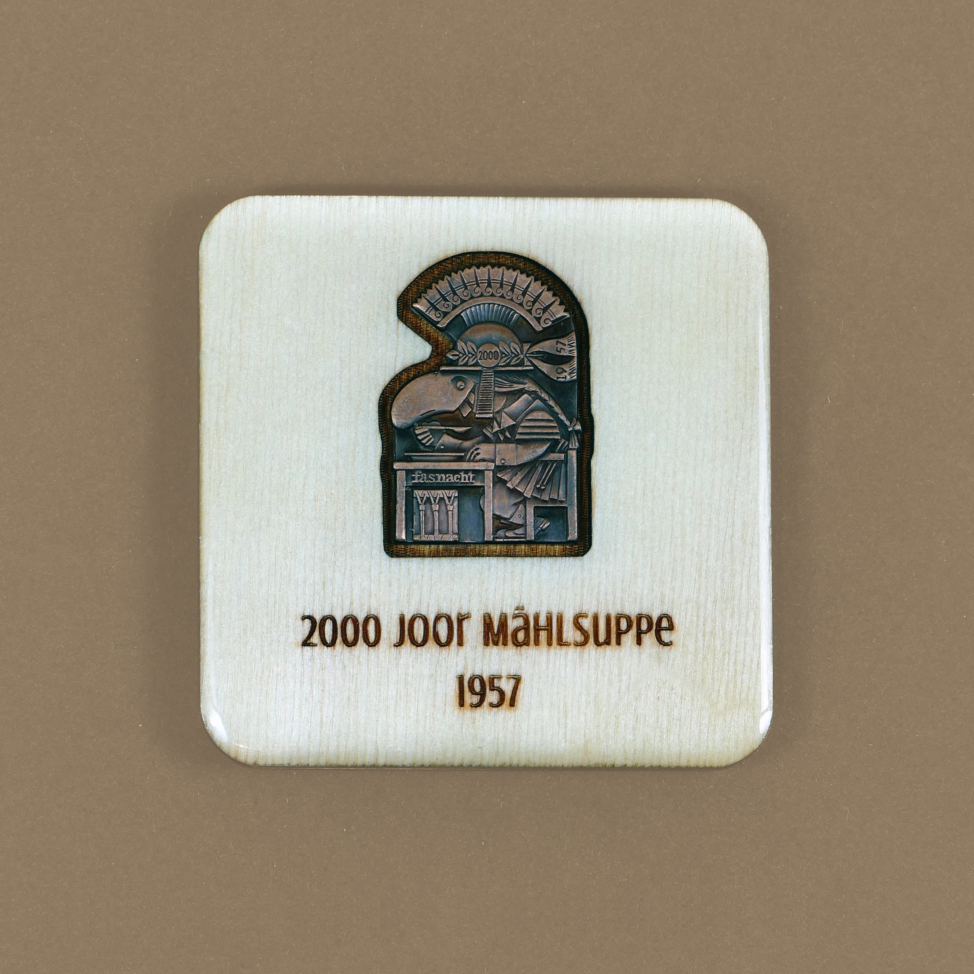 A handcrafted piece featuring a Blaggedde (Basel Fasnacht badge) from 1957. The theme of the year was "2000 Joor Mählsuppe" and the Blaggedde was designed by Fritz Grogg.