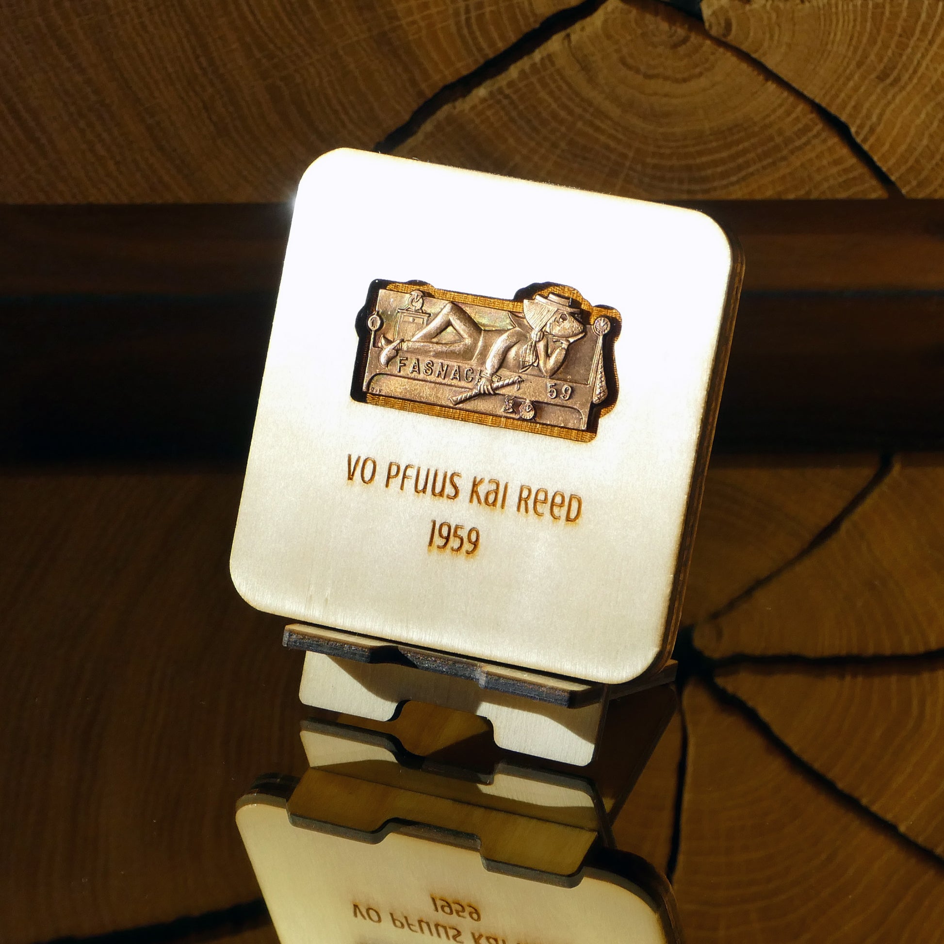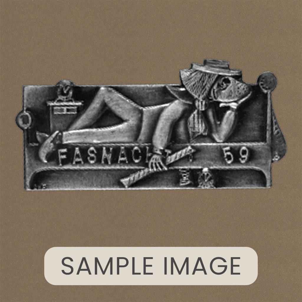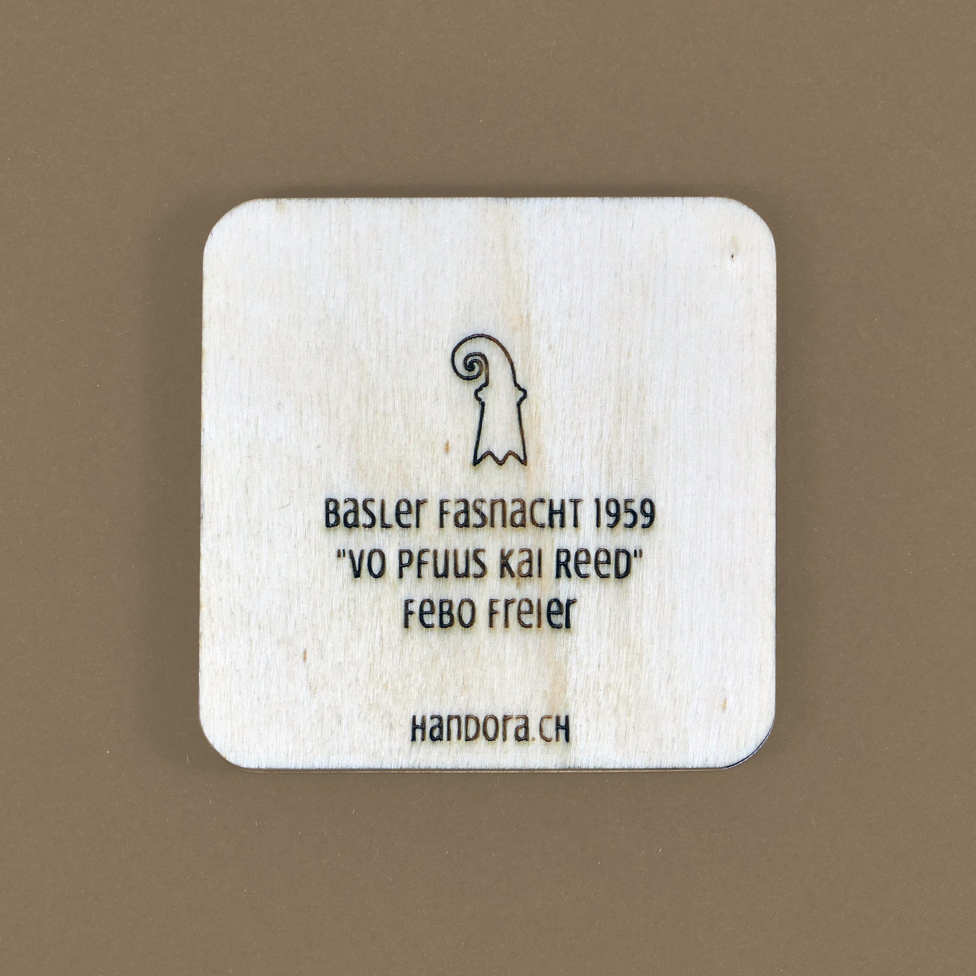 A handcrafted piece featuring a Blaggedde (Basel Fasnacht badge) from 1959. The theme of the year was "Vo Pfuus kai Reed" and the Blaggedde was designed by Febo Freier.