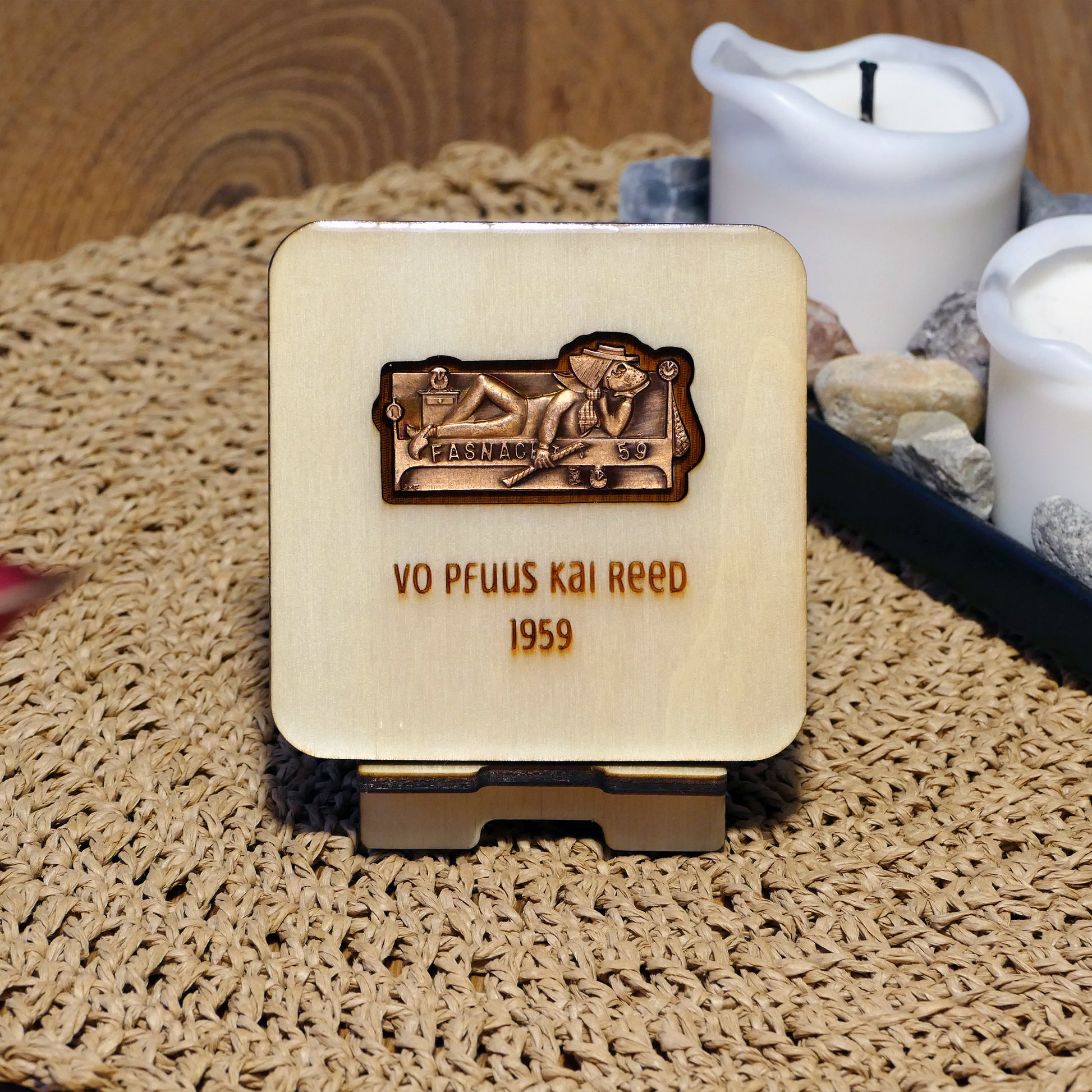 Dieses handgefertigte Stück besteht aus zwei Lagen 4 mm starkem Sperrholz. Die obere Lage ist präzise lasergeschnitten und passt perfekt zum Abzeichen, das auf der unteren Lage befestigt ist. Die Oberfläche ist mit Epoxidharz versiegelt, wodurch sie glatt und wasserabweisend ist und die Details des Abzeichens hervorhebt. Seiten und Unterseite sind mit Hartwachsöl behandelt, um das Holz zu schützen und seine natürliche Maserung zu bewahren.