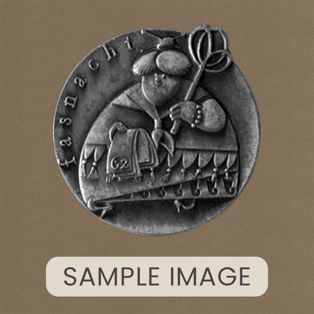 A handcrafted piece featuring a Blaggedde (Basel Fasnacht badge) from 1962. The theme of the year was "S isch diggi Poscht (D Pfläddere)" and the Blaggedde was designed by Ferdi Afflerbach.