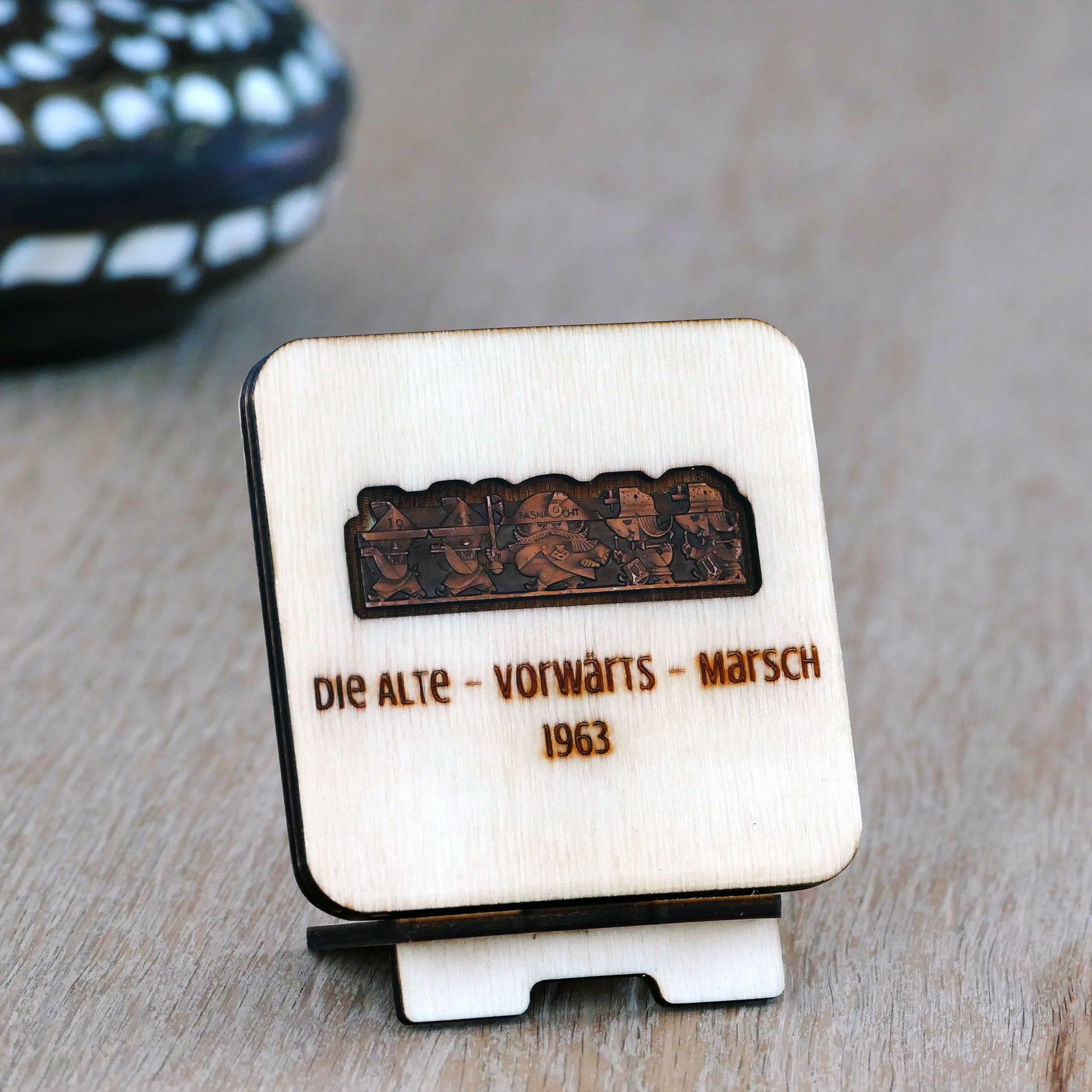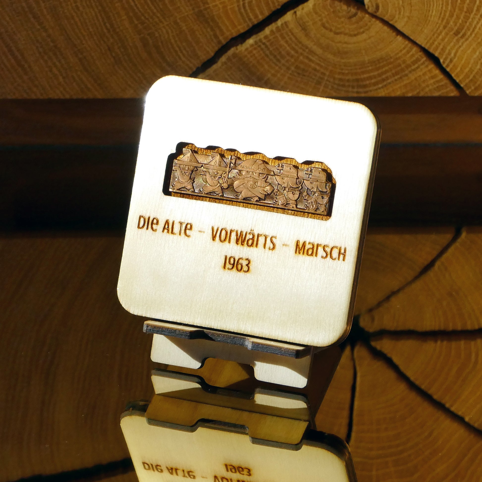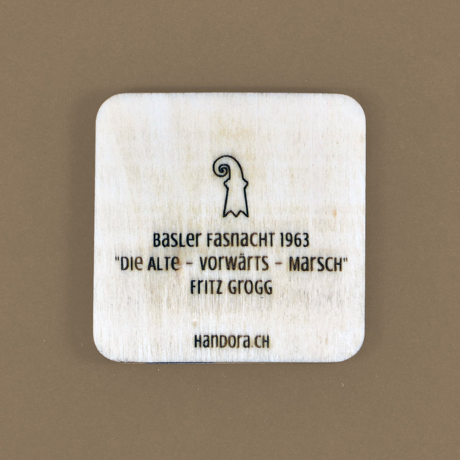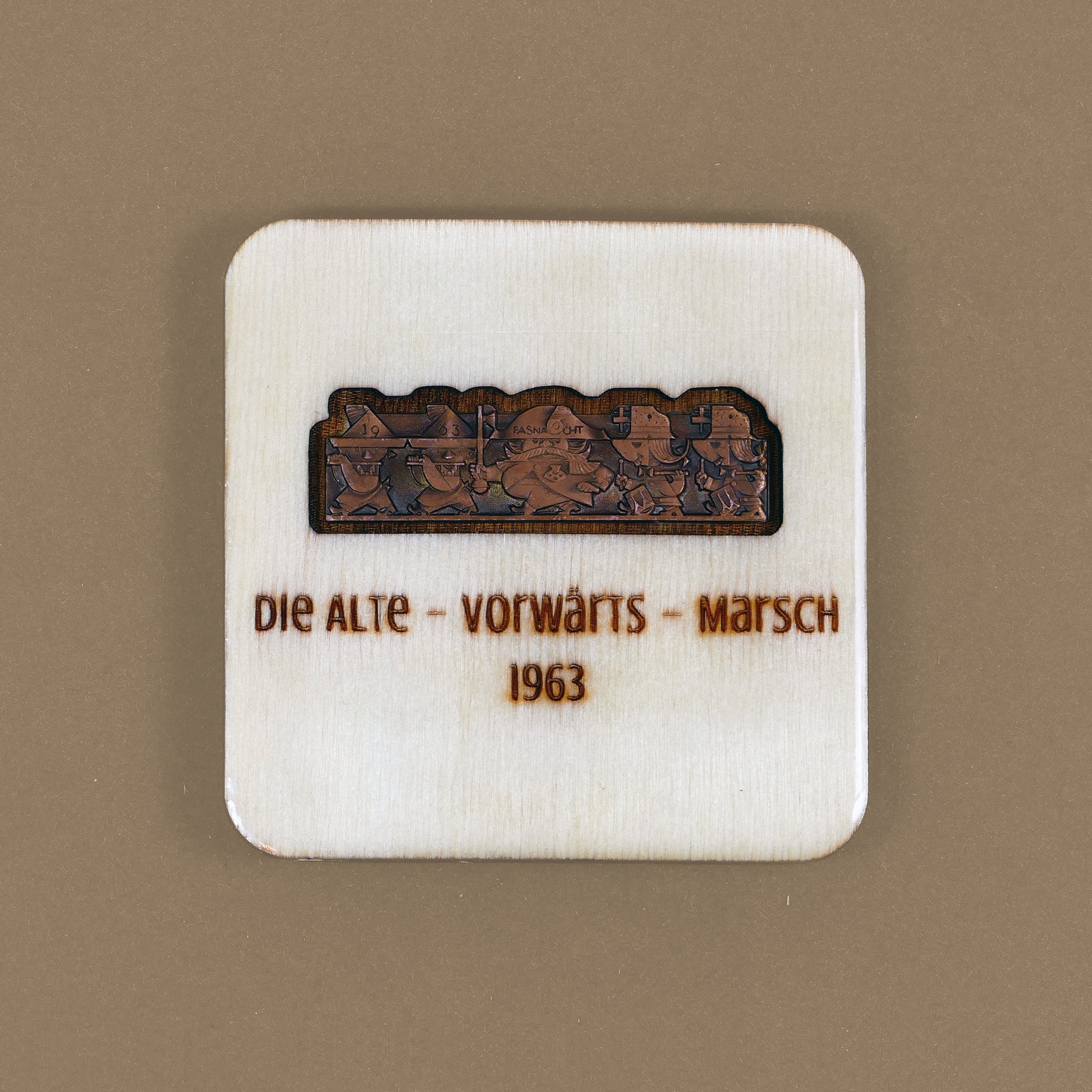 A handcrafted piece featuring a Blaggedde (Basel Fasnacht badge) from 1963. The theme of the year was "Die Alte – vorwärts – Marsch" and the Blaggedde was designed by Fritz Grogg.