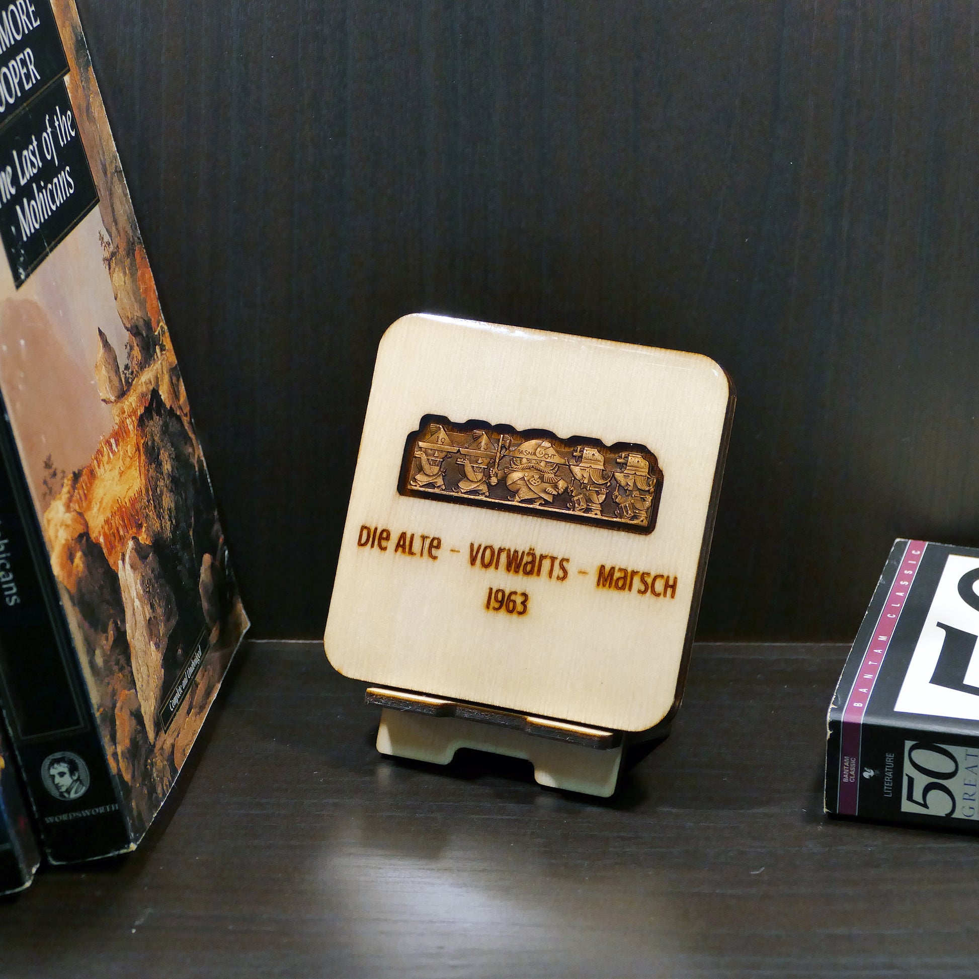 Dieses handgefertigte Stück besteht aus zwei Lagen 4 mm starkem Sperrholz. Die obere Lage ist präzise lasergeschnitten und passt perfekt zum Abzeichen, das auf der unteren Lage befestigt ist. Die Oberfläche ist mit Epoxidharz versiegelt, wodurch sie glatt und wasserabweisend ist und die Details des Abzeichens hervorhebt. Seiten und Unterseite sind mit Hartwachsöl behandelt, um das Holz zu schützen und seine natürliche Maserung zu bewahren.