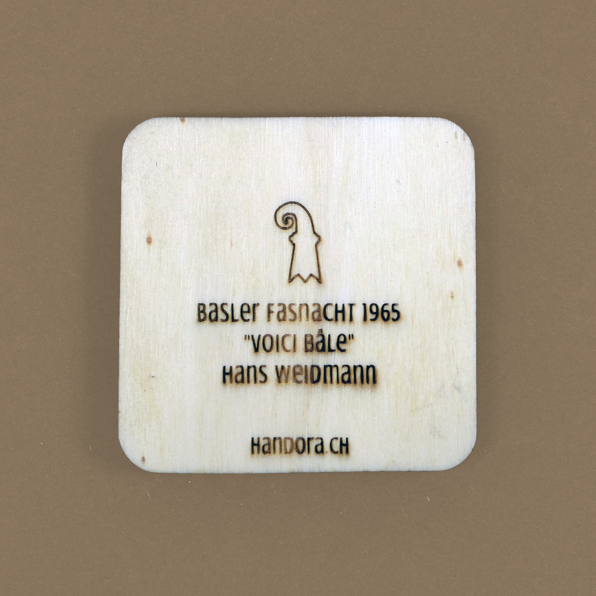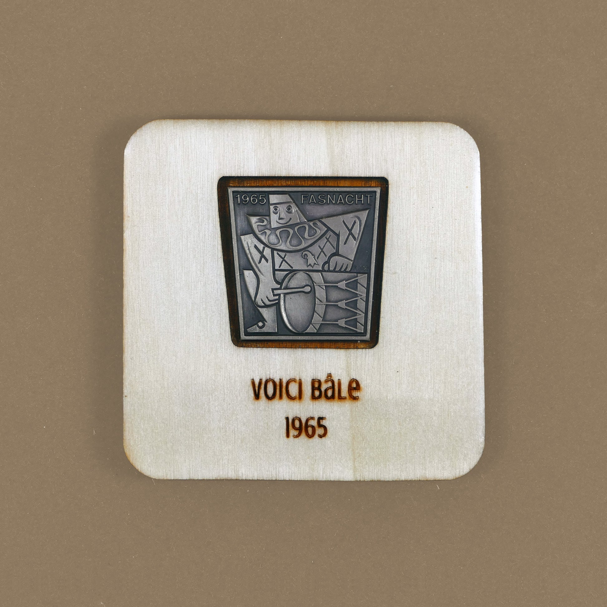 A handcrafted piece featuring a Blaggedde (Basel Fasnacht badge) from 1965. The theme of the year was "Voici Bâle" and the Blaggedde was designed by Hans Weidmann.