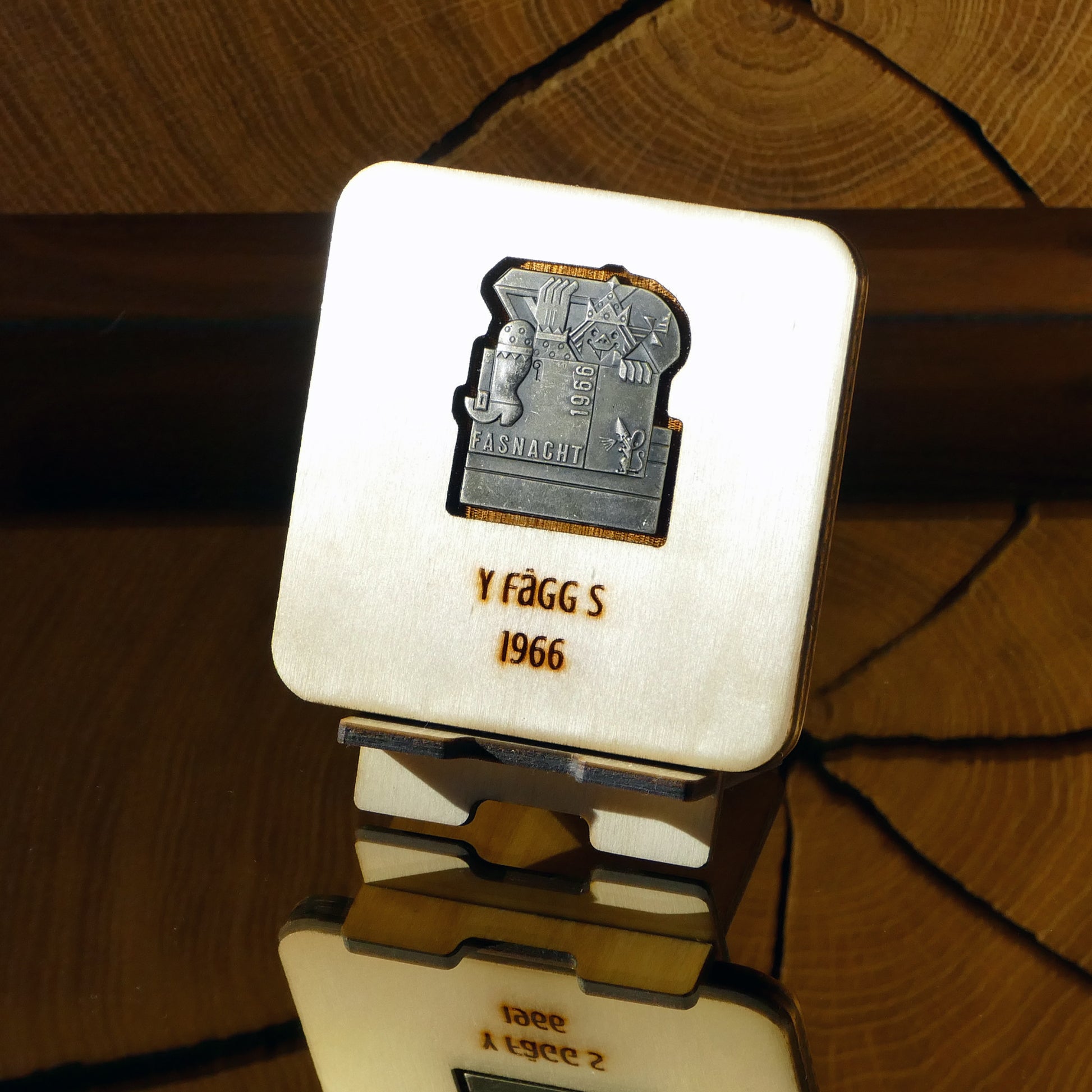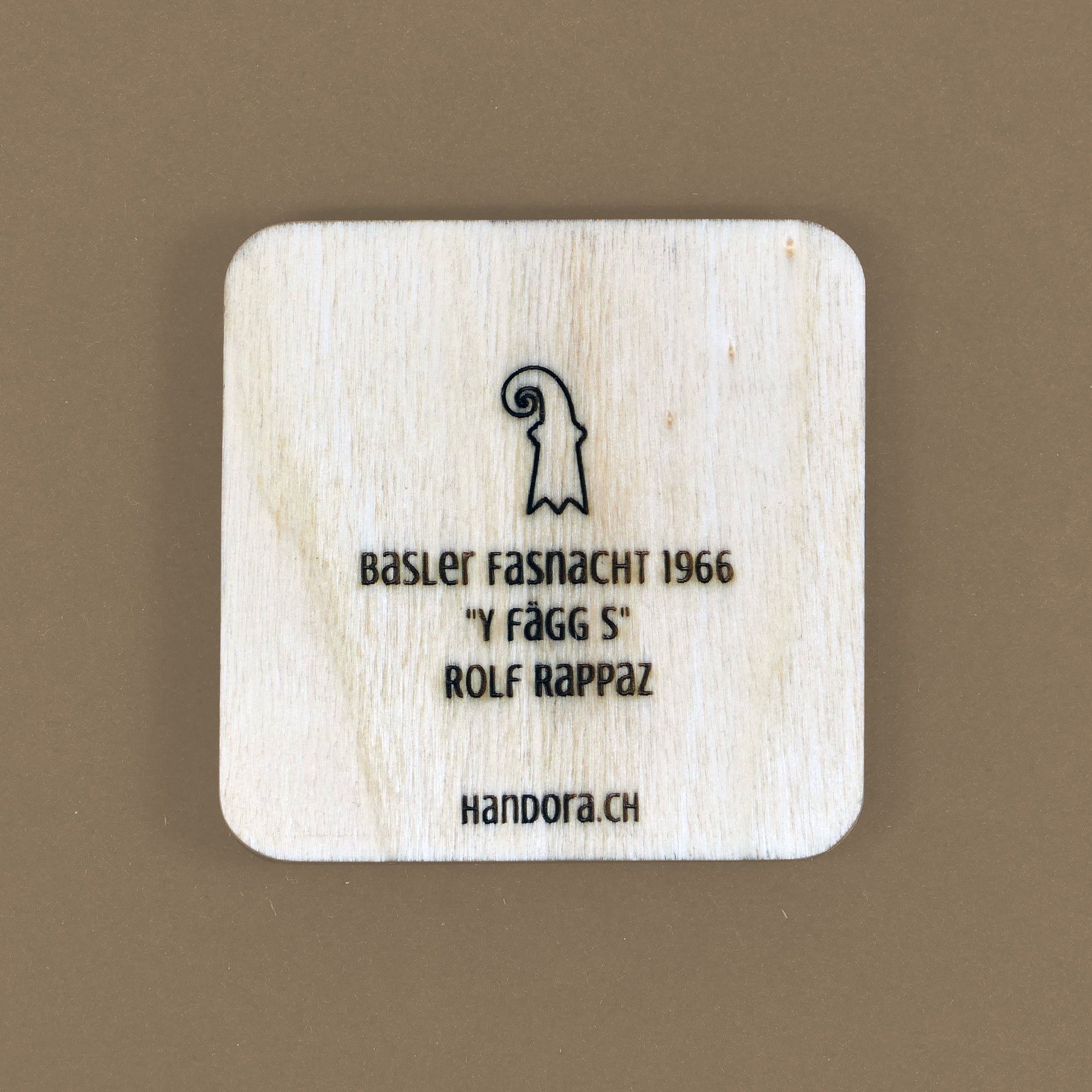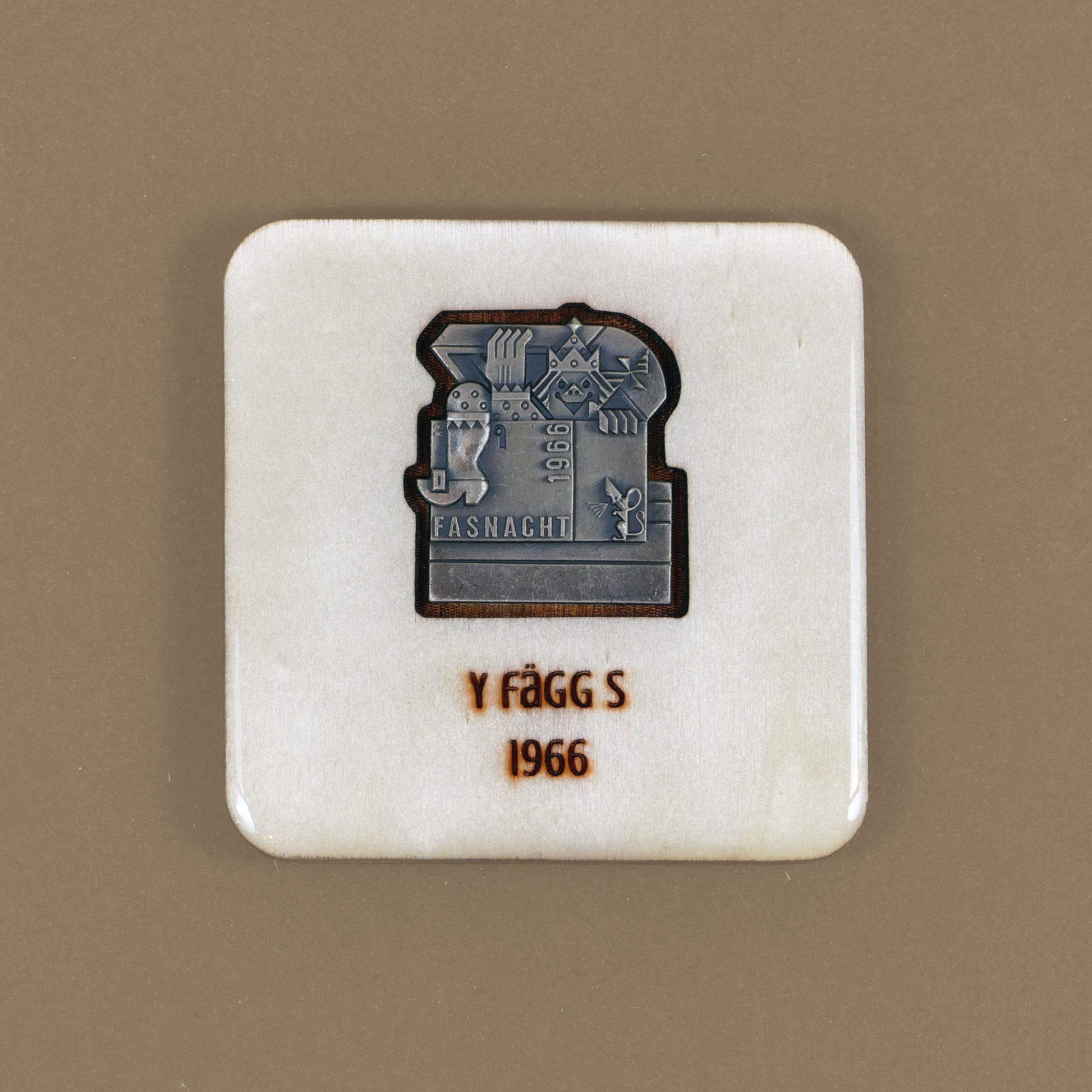 A handcrafted piece featuring a Blaggedde (Basel Fasnacht badge) from 1966. The theme of the year was "Y fägg s" and the Blaggedde was designed by Rolf Rappaz.