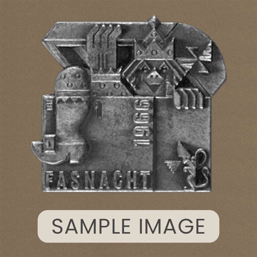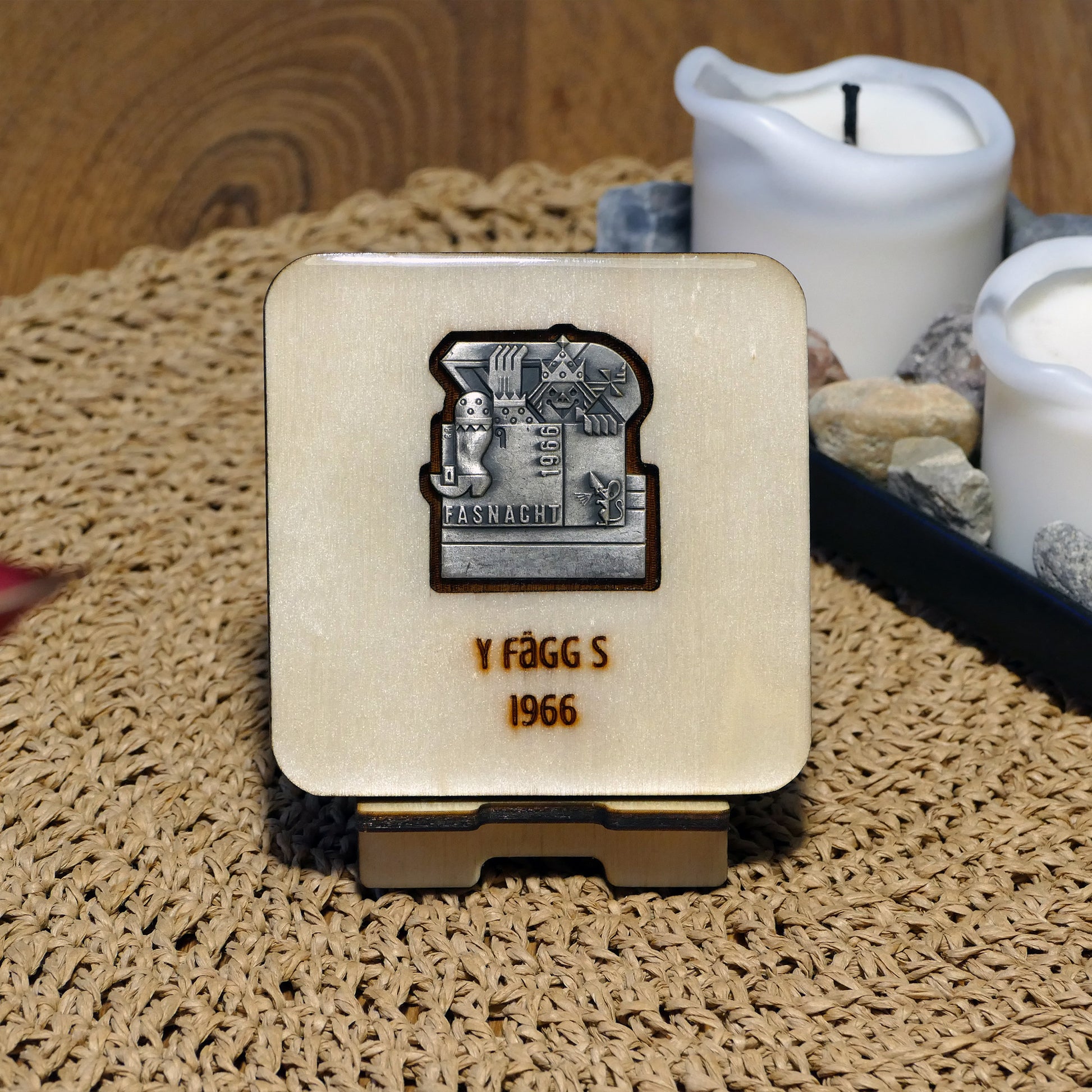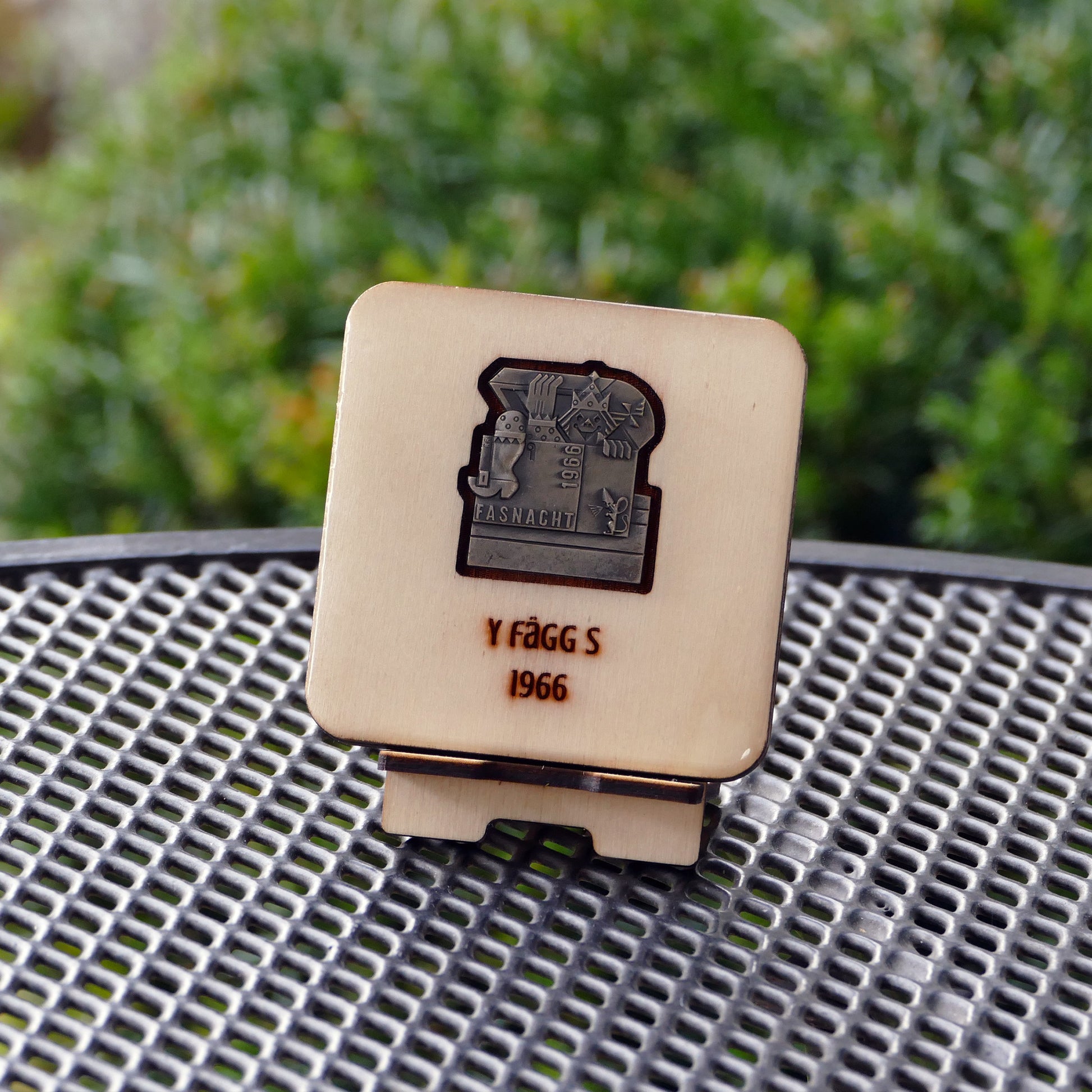 A handcrafted piece featuring a Blaggedde (Basel Fasnacht badge) from 1966. The theme of the year was "Y fägg s" and the Blaggedde was designed by Rolf Rappaz.
