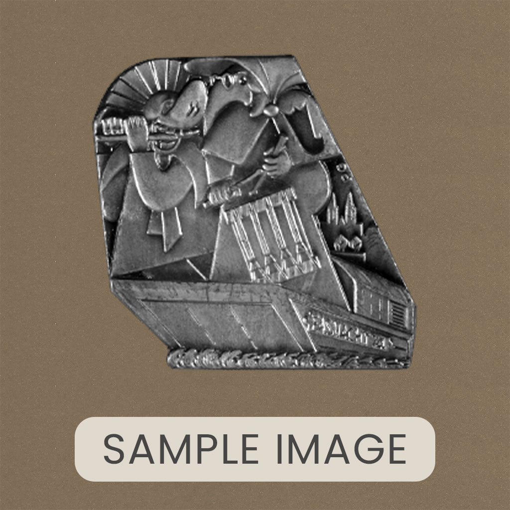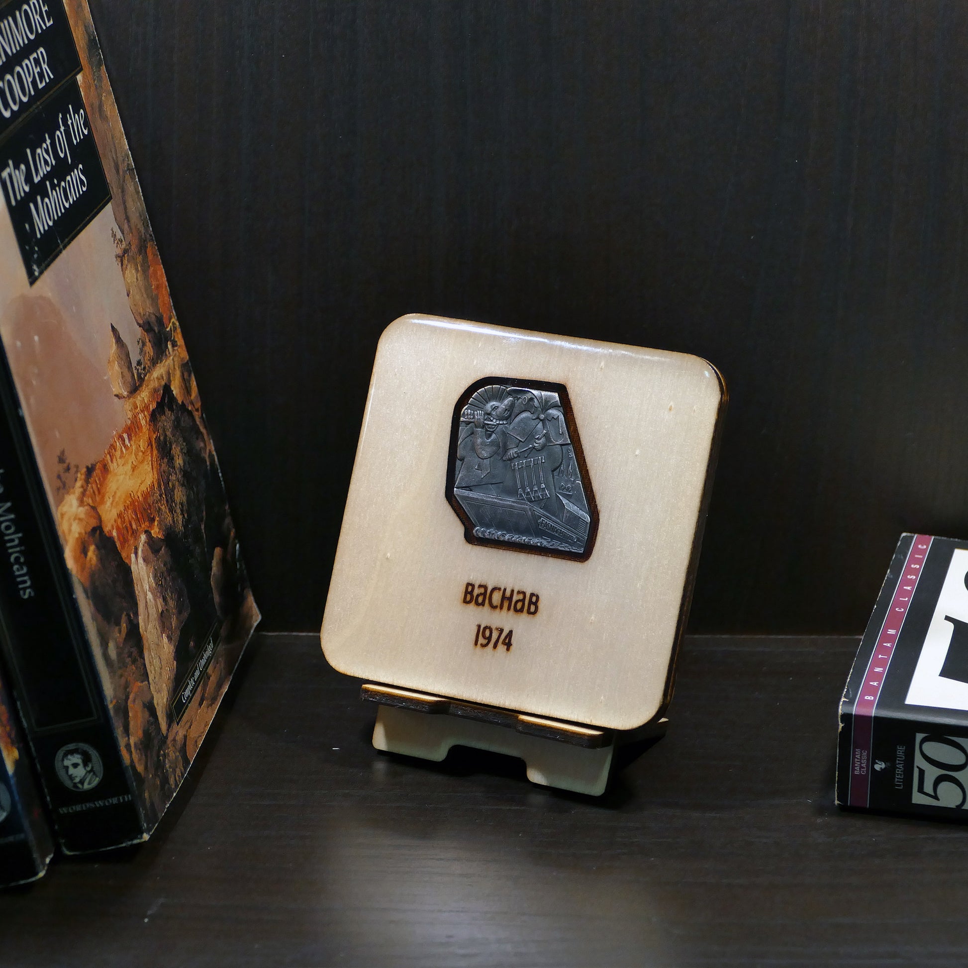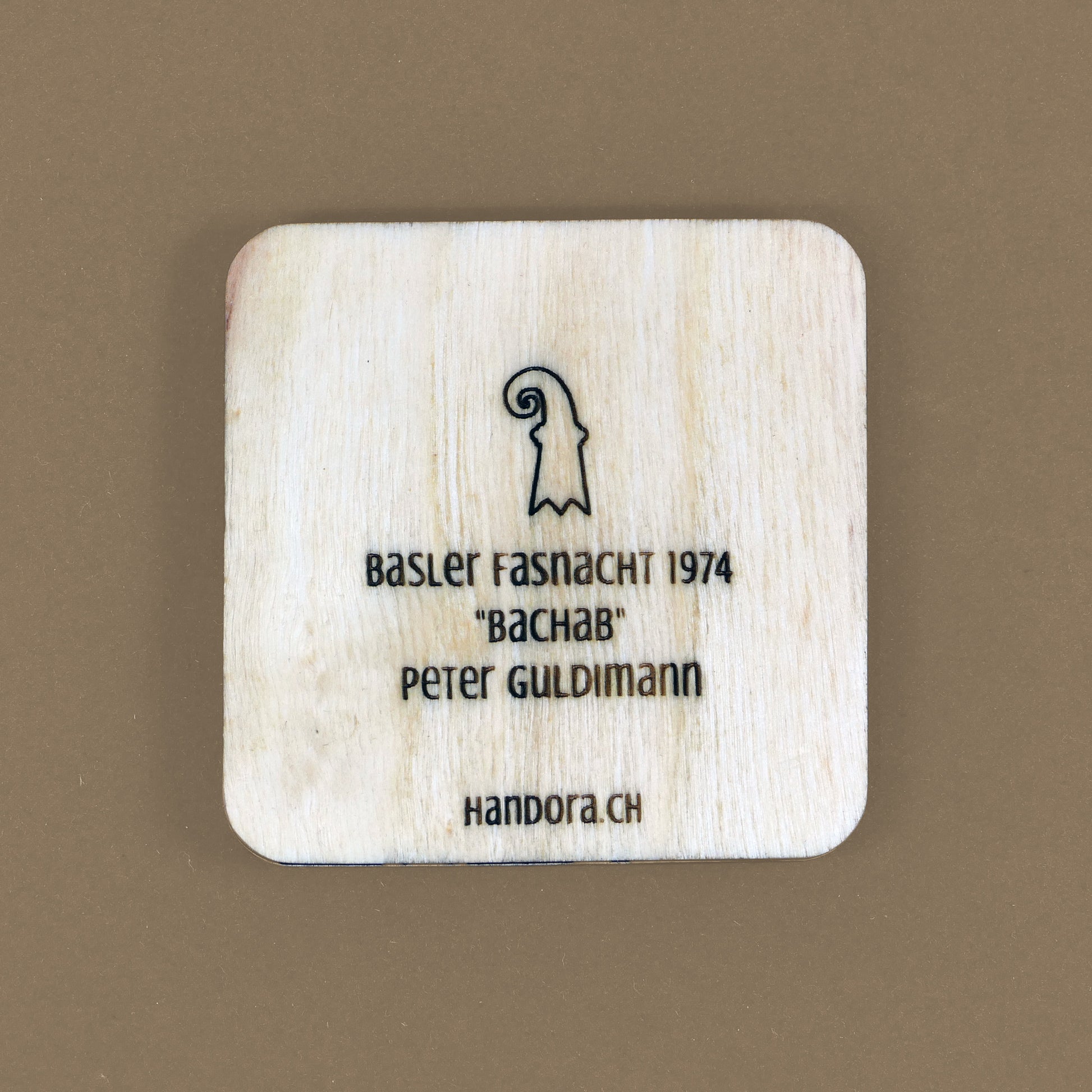 A handcrafted piece featuring a Blaggedde (Basel Fasnacht badge) from 1974. The theme of the year was "Bachab" and the Blaggedde was designed by Peter Guldimann.