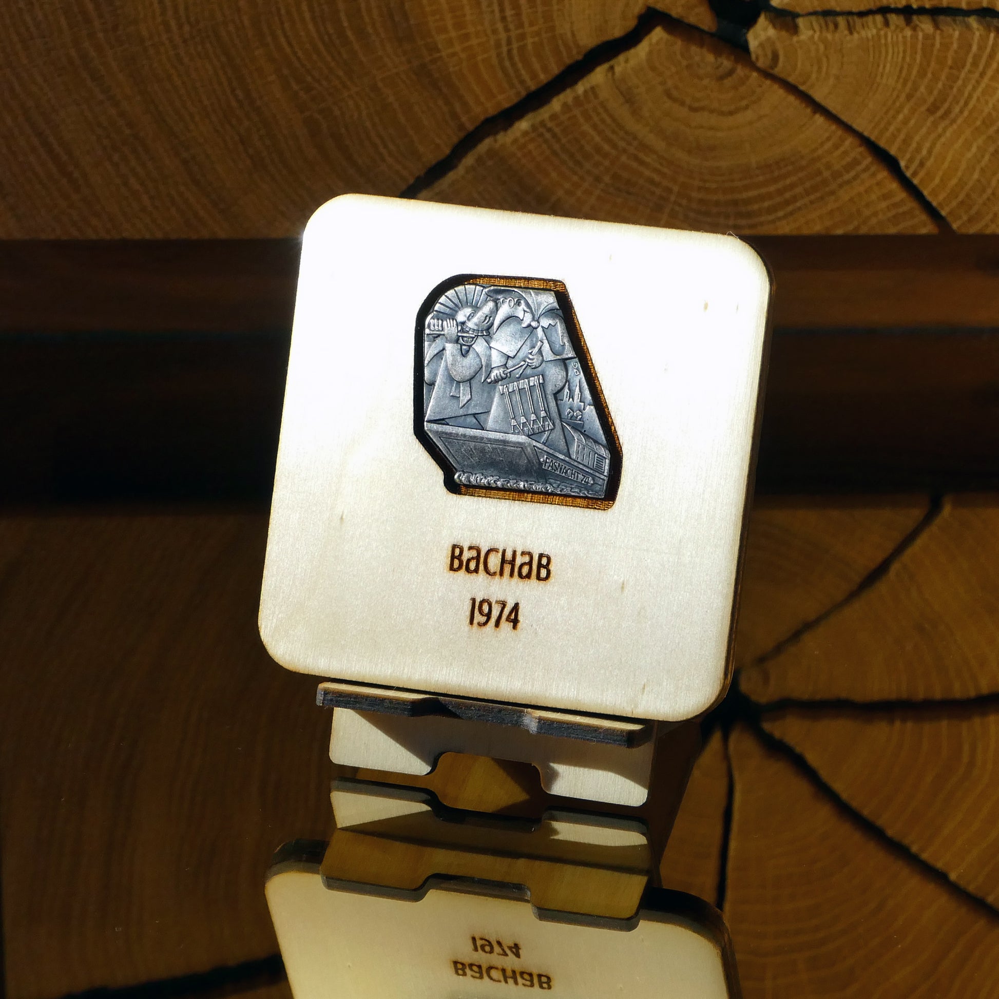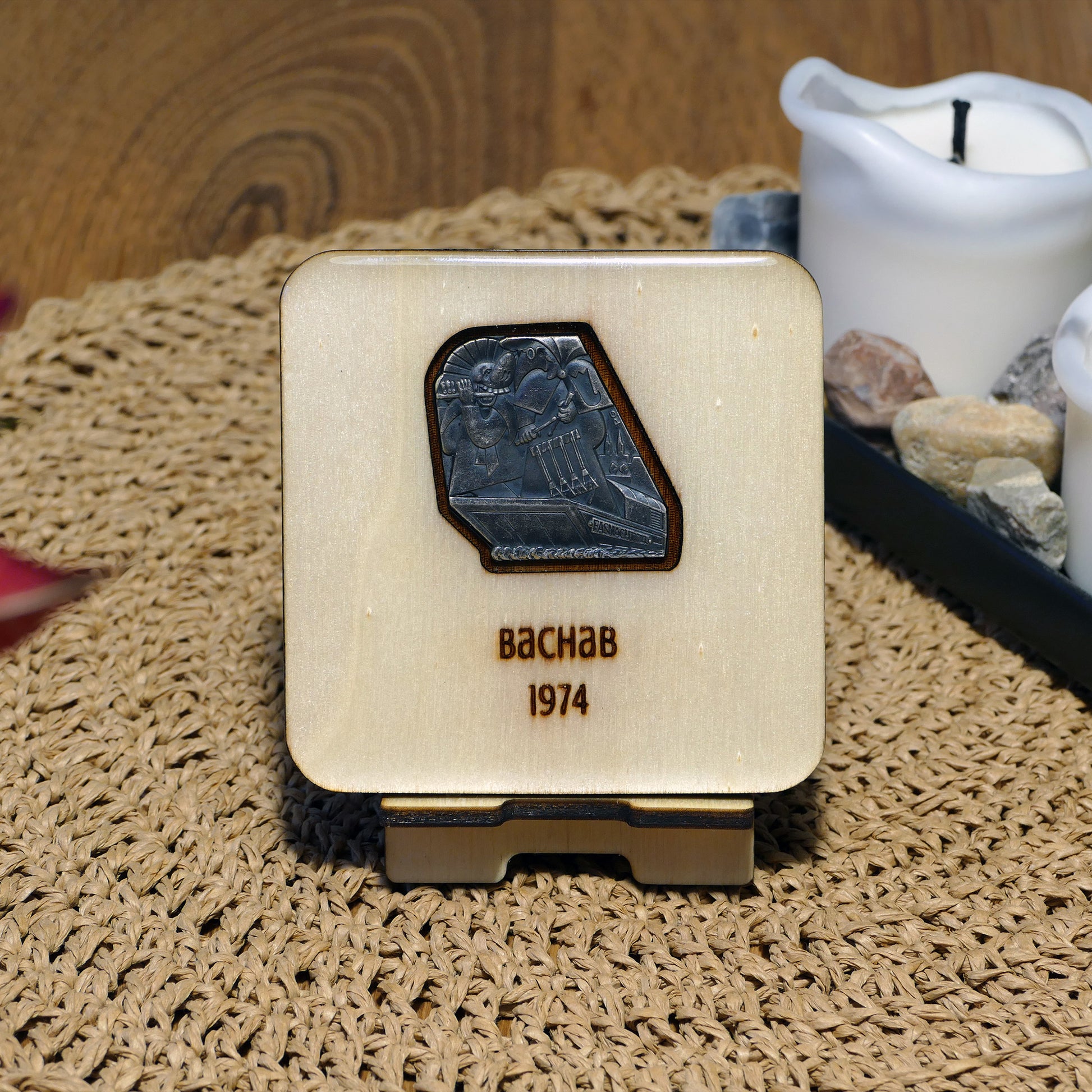 Dieses handgefertigte Stück besteht aus zwei Lagen 4 mm starkem Sperrholz. Die obere Lage ist präzise lasergeschnitten und passt perfekt zum Abzeichen, das auf der unteren Lage befestigt ist. Die Oberfläche ist mit Epoxidharz versiegelt, wodurch sie glatt und wasserabweisend ist und die Details des Abzeichens hervorhebt. Seiten und Unterseite sind mit Hartwachsöl behandelt, um das Holz zu schützen und seine natürliche Maserung zu bewahren.