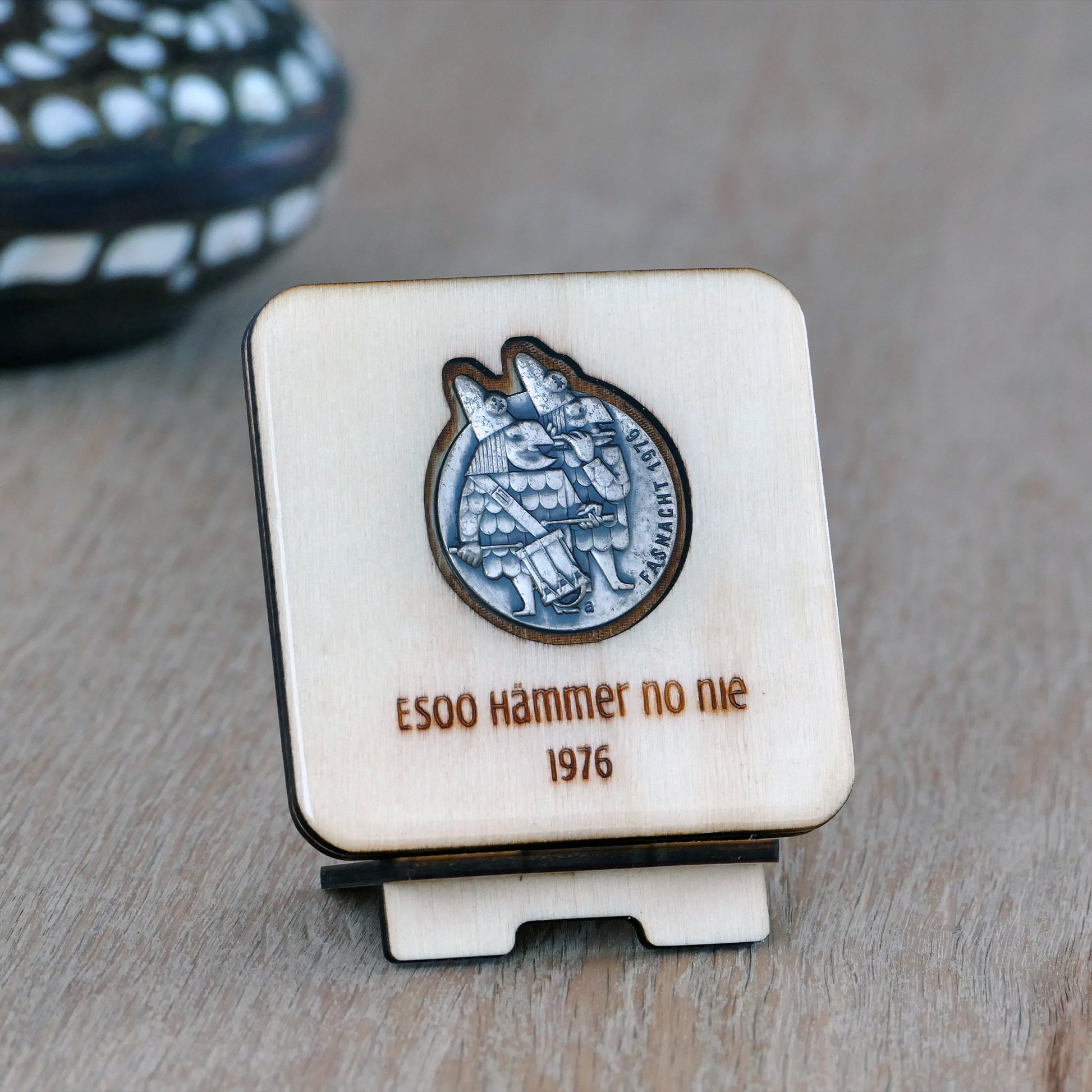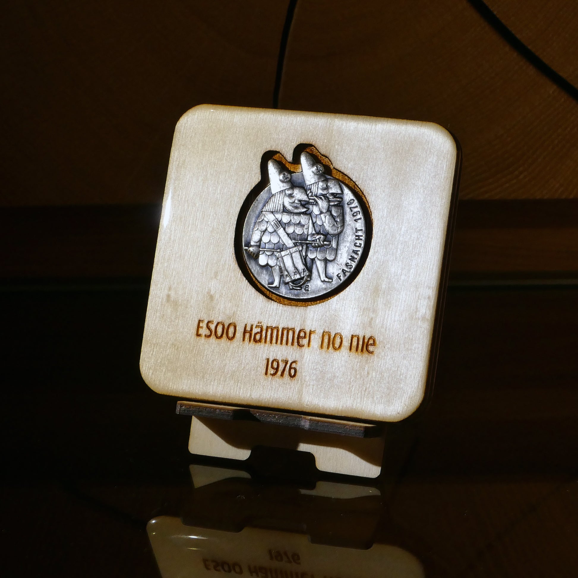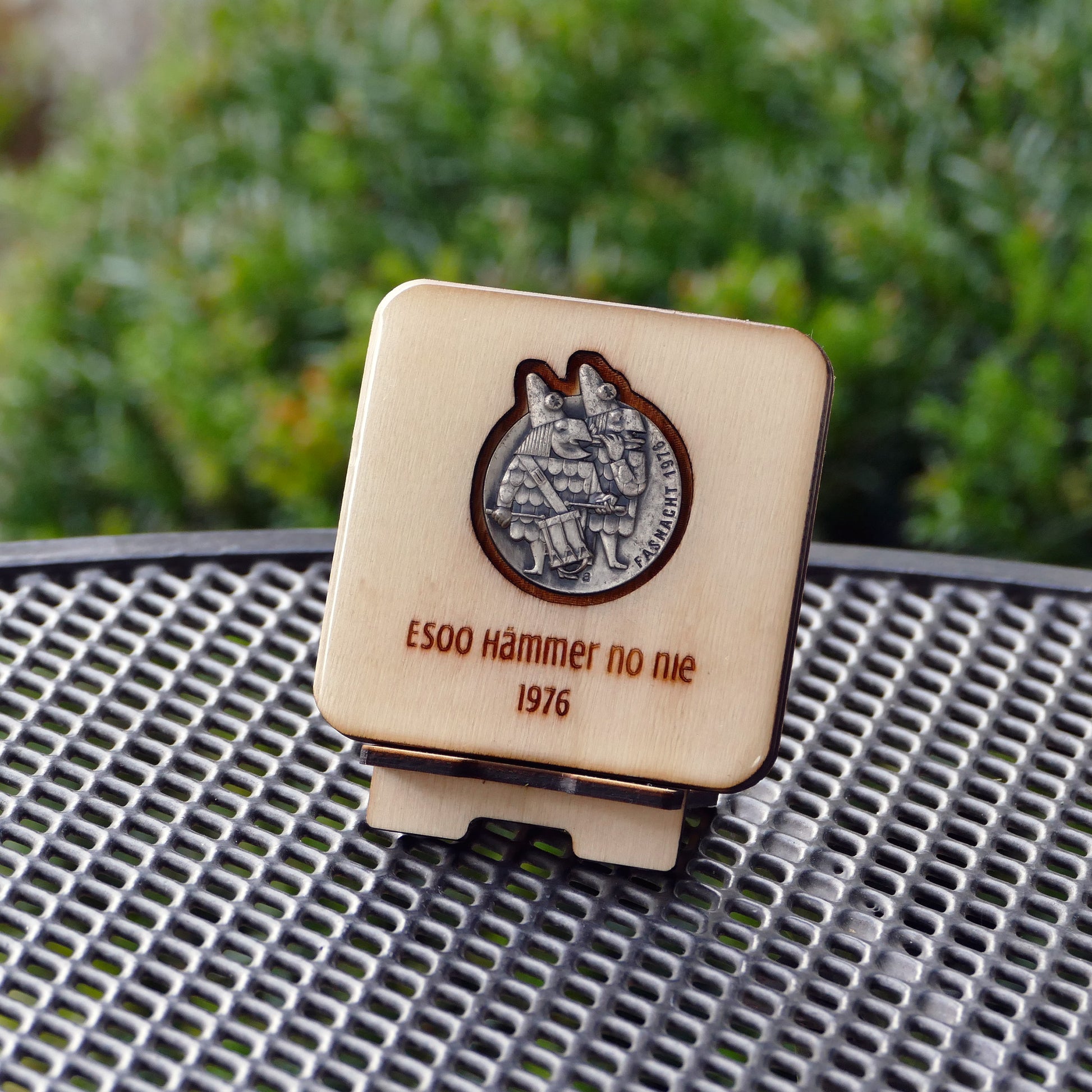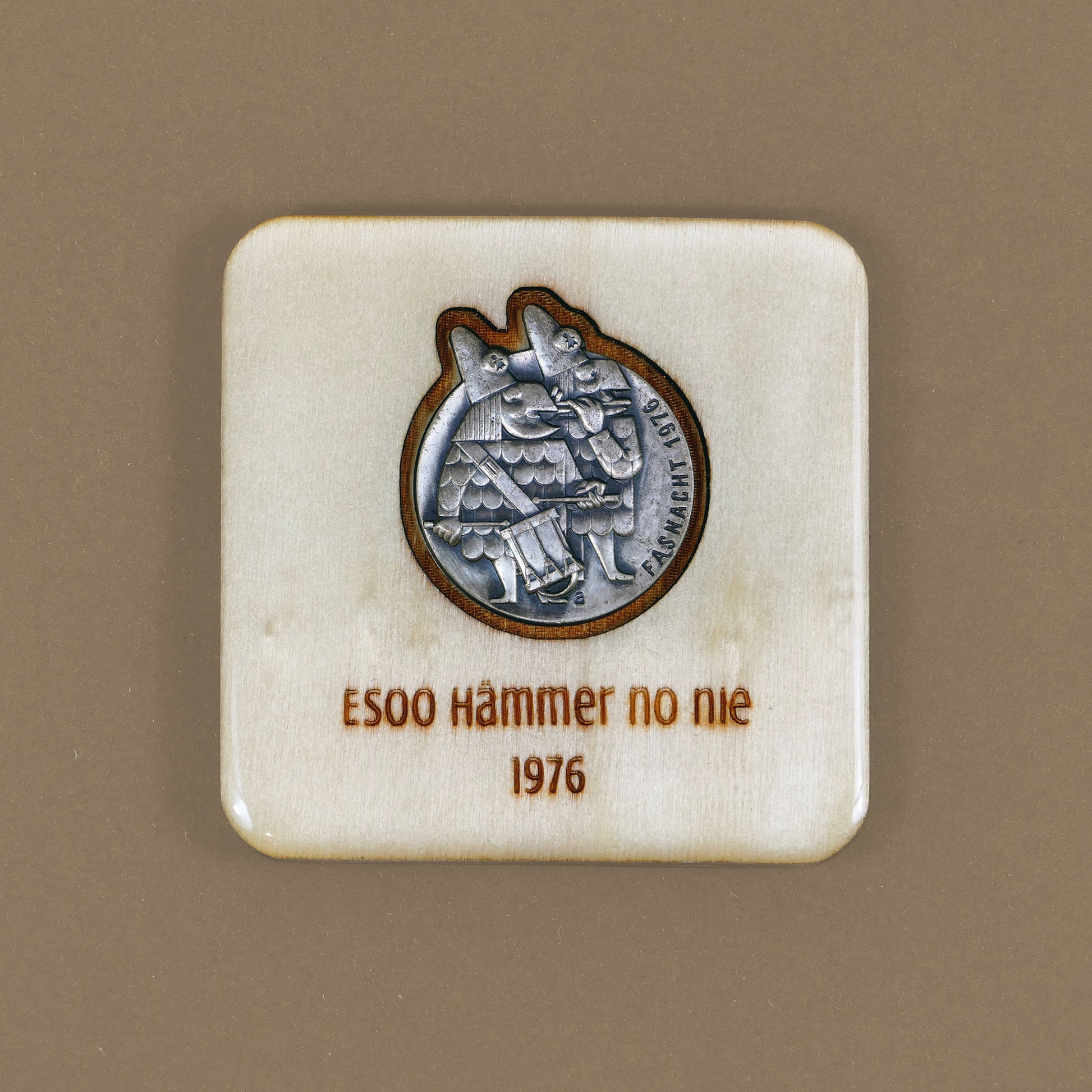A handcrafted piece featuring a Blaggedde (Basel Fasnacht badge) from 1976. The theme of the year was "Esoo hämmer no nie" and the Blaggedde was designed by Peter Affolter.