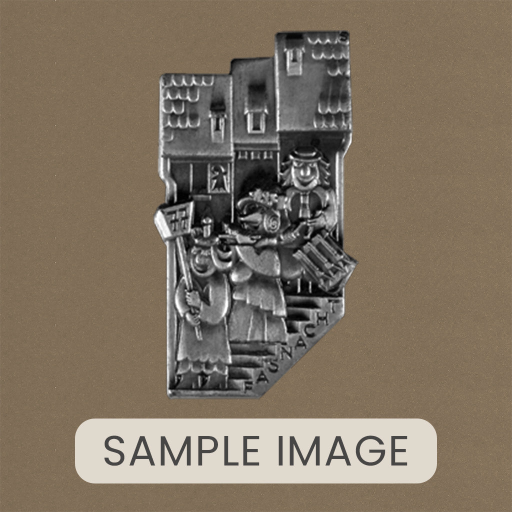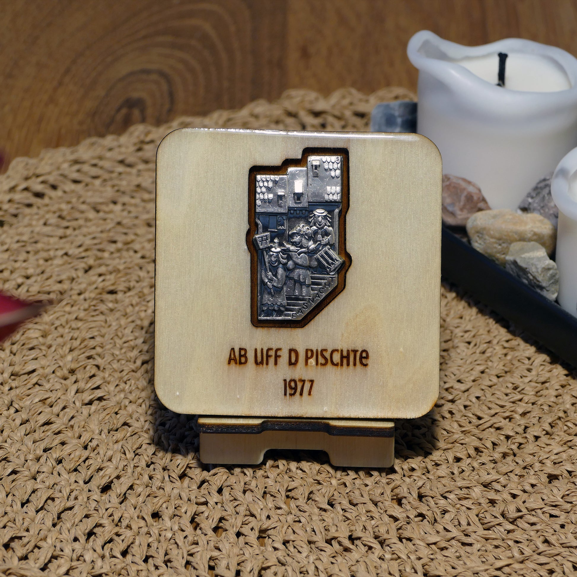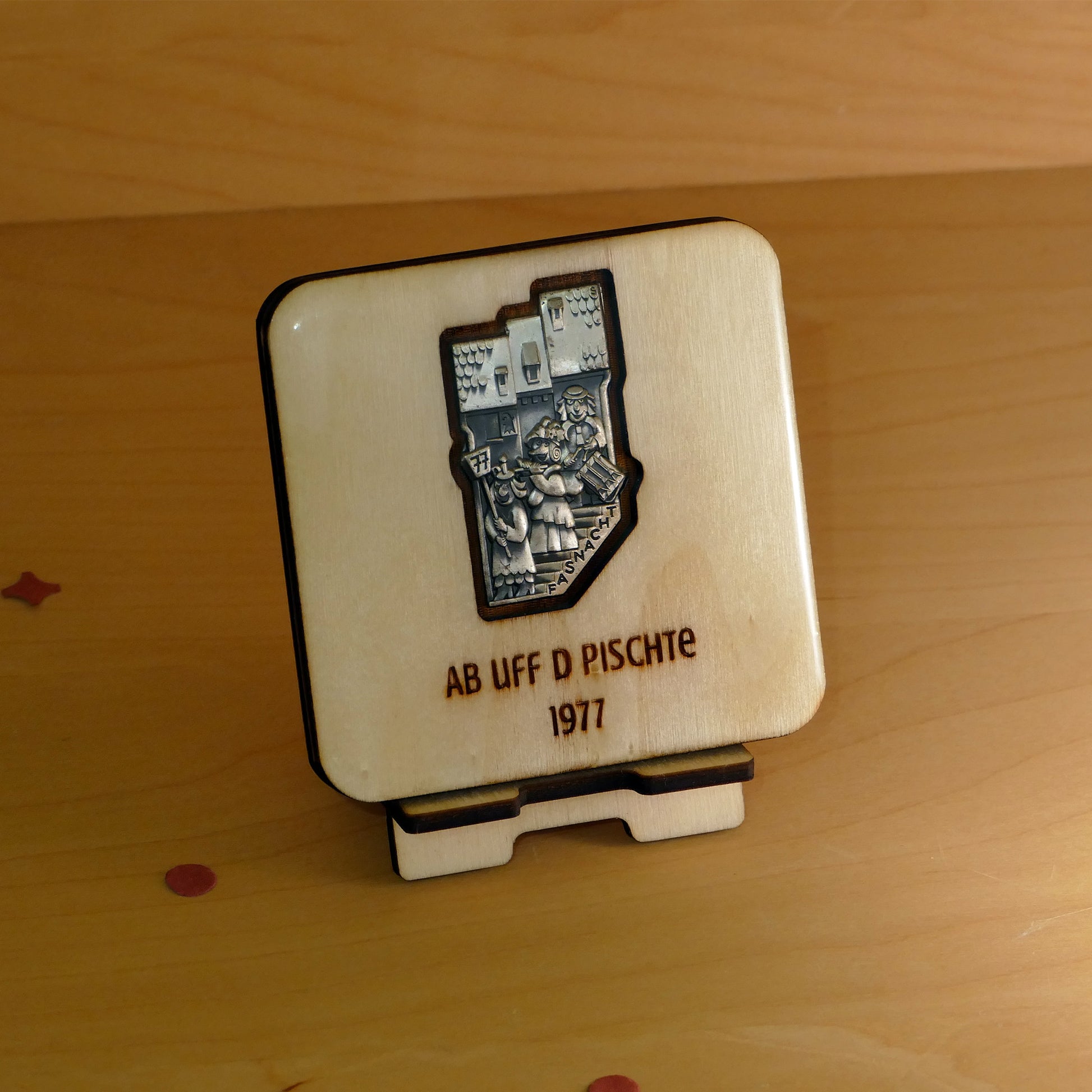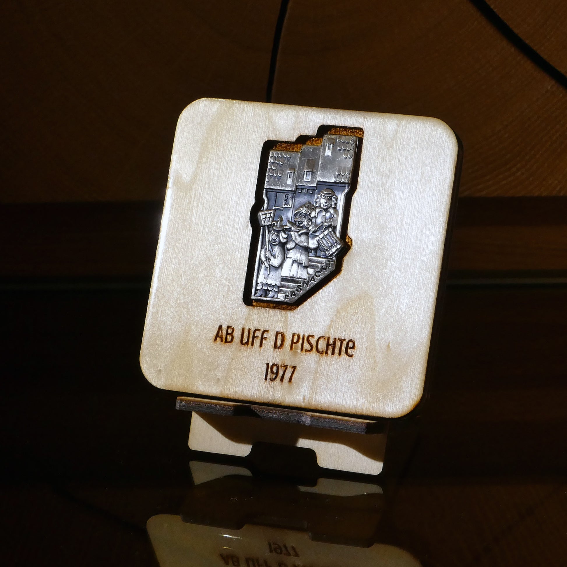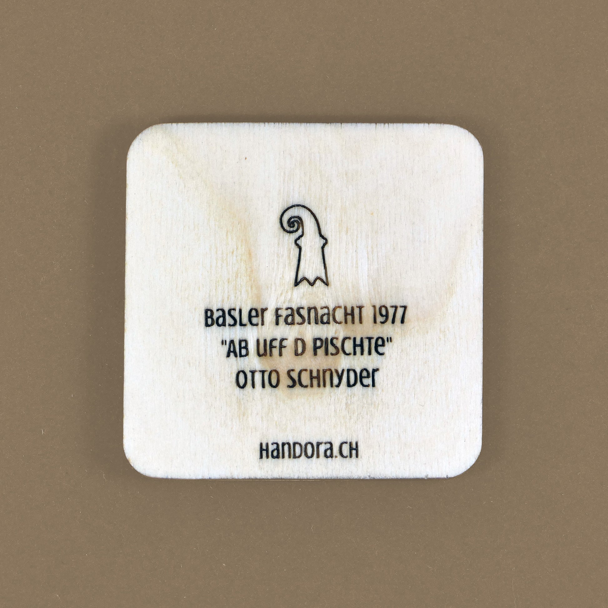 A handcrafted piece featuring a Blaggedde (Basel Fasnacht badge) from 1977. The theme of the year was "Ab uff d Pischte" and the Blaggedde was designed by Otto Schnyder.