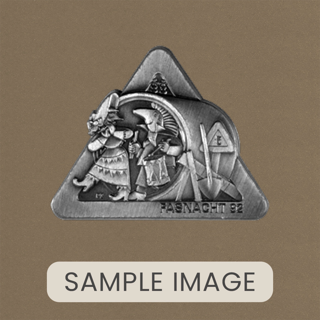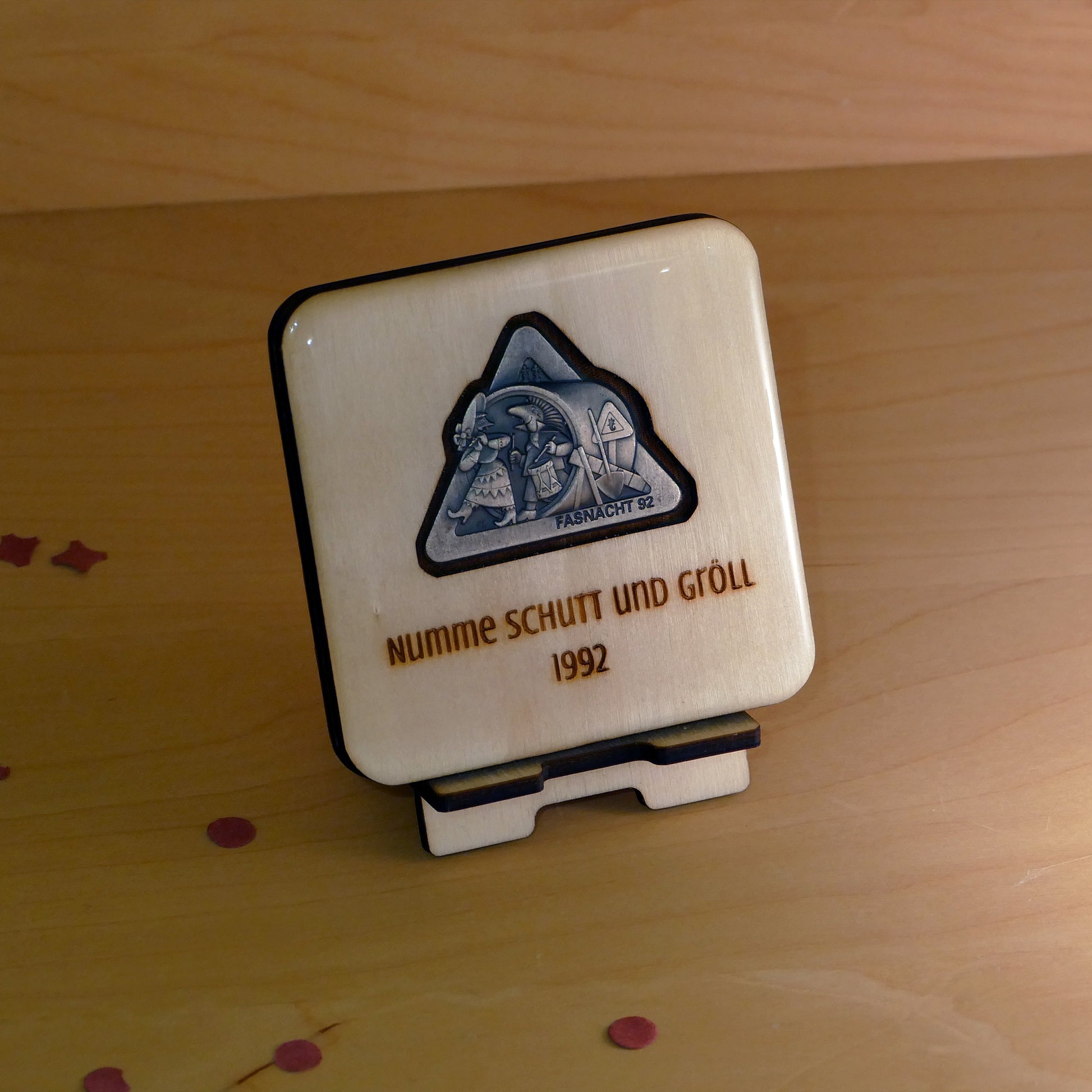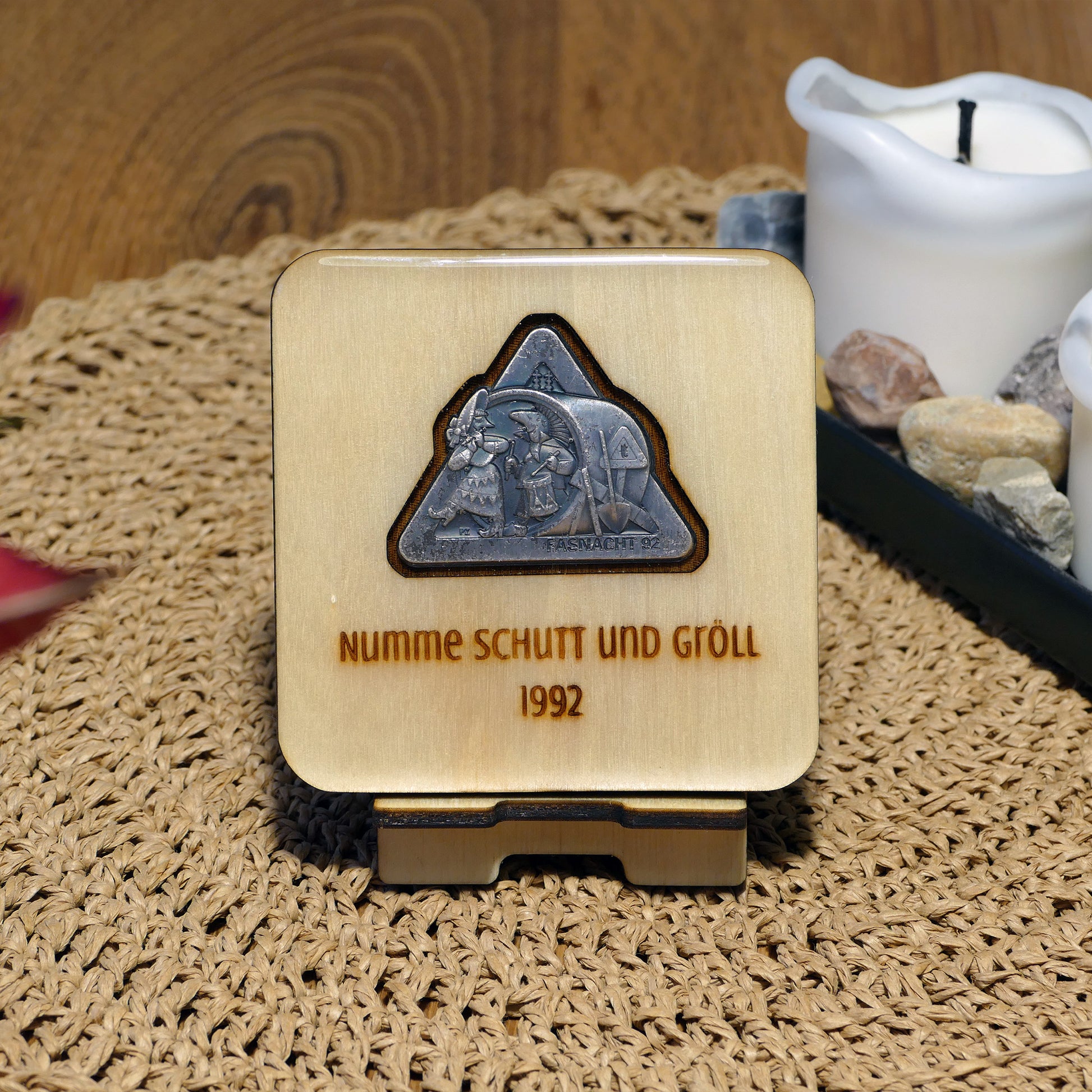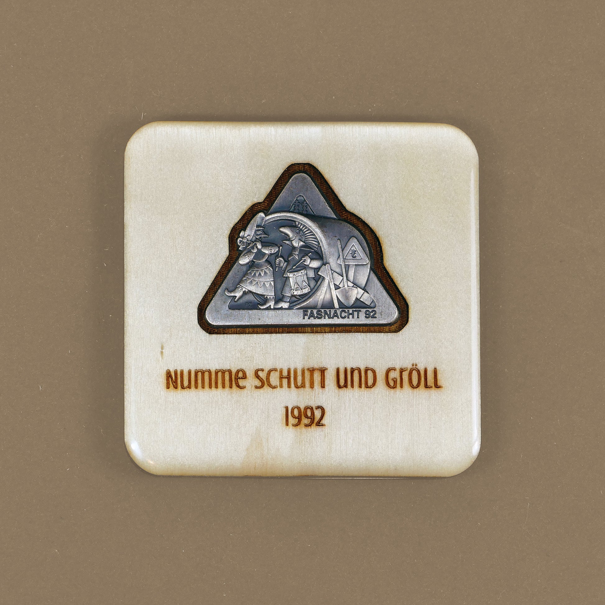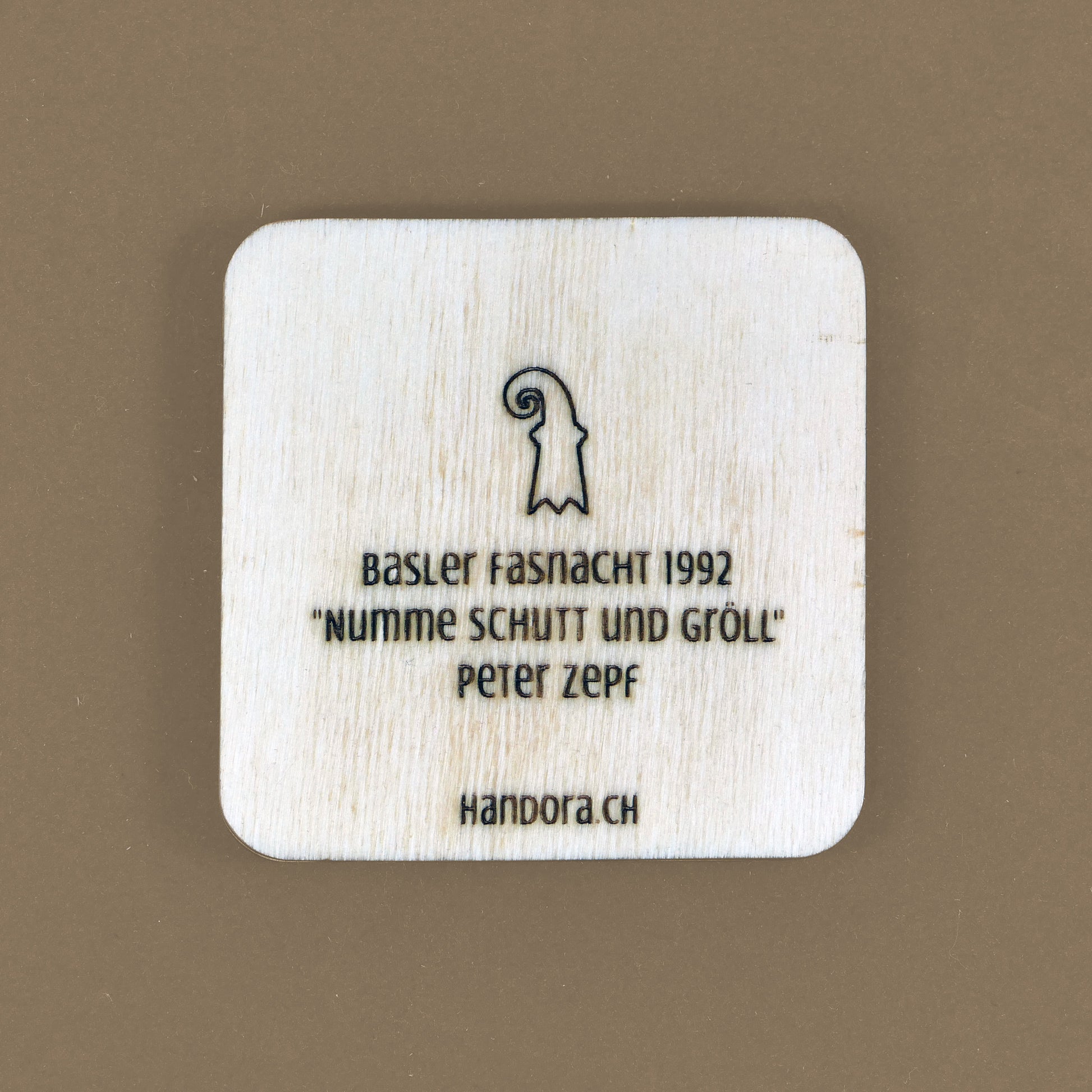 A handcrafted piece featuring a Blaggedde (Basel Fasnacht badge) from 1992. The theme of the year was "Numme Schutt und Gröll" and the Blaggedde was designed by Peter Zepf.