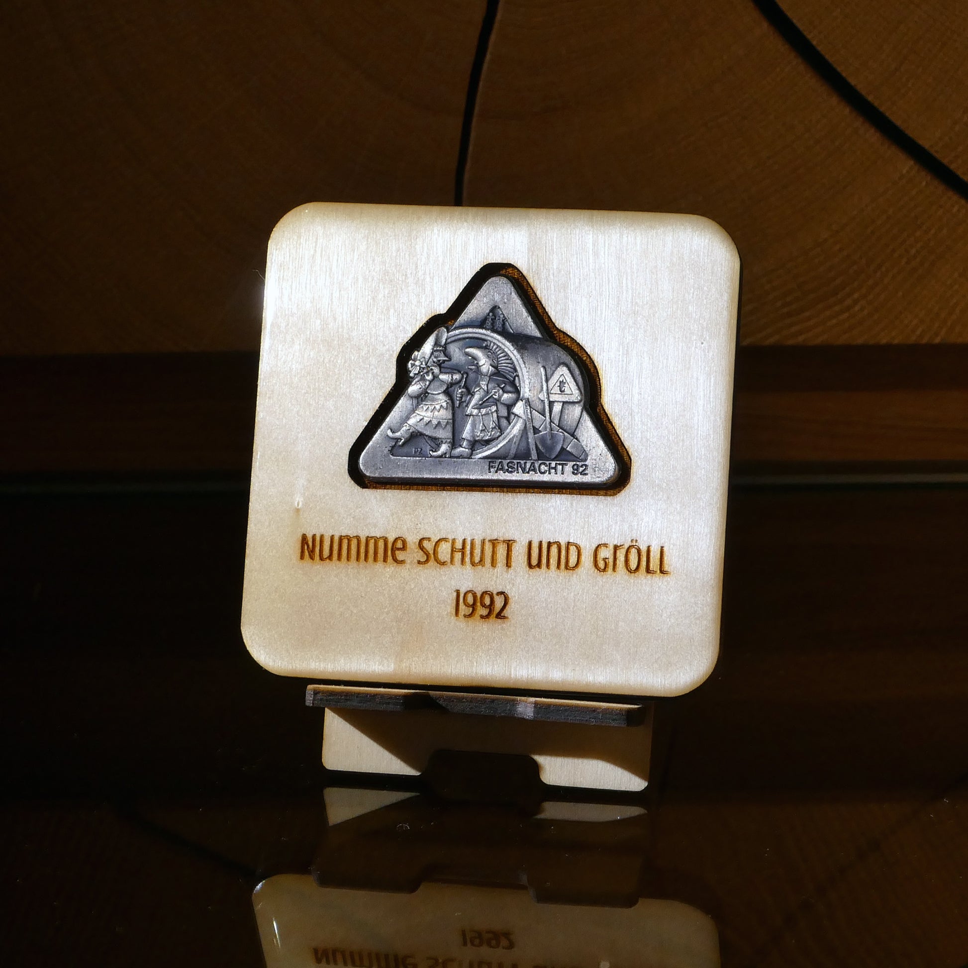 Dieses handgefertigte Stück besteht aus zwei Lagen 4 mm starkem Sperrholz. Die obere Lage ist präzise lasergeschnitten und passt perfekt zum Abzeichen, das auf der unteren Lage befestigt ist. Die Oberfläche ist mit Epoxidharz versiegelt, wodurch sie glatt und wasserabweisend ist und die Details des Abzeichens hervorhebt. Seiten und Unterseite sind mit Hartwachsöl behandelt, um das Holz zu schützen und seine natürliche Maserung zu bewahren.