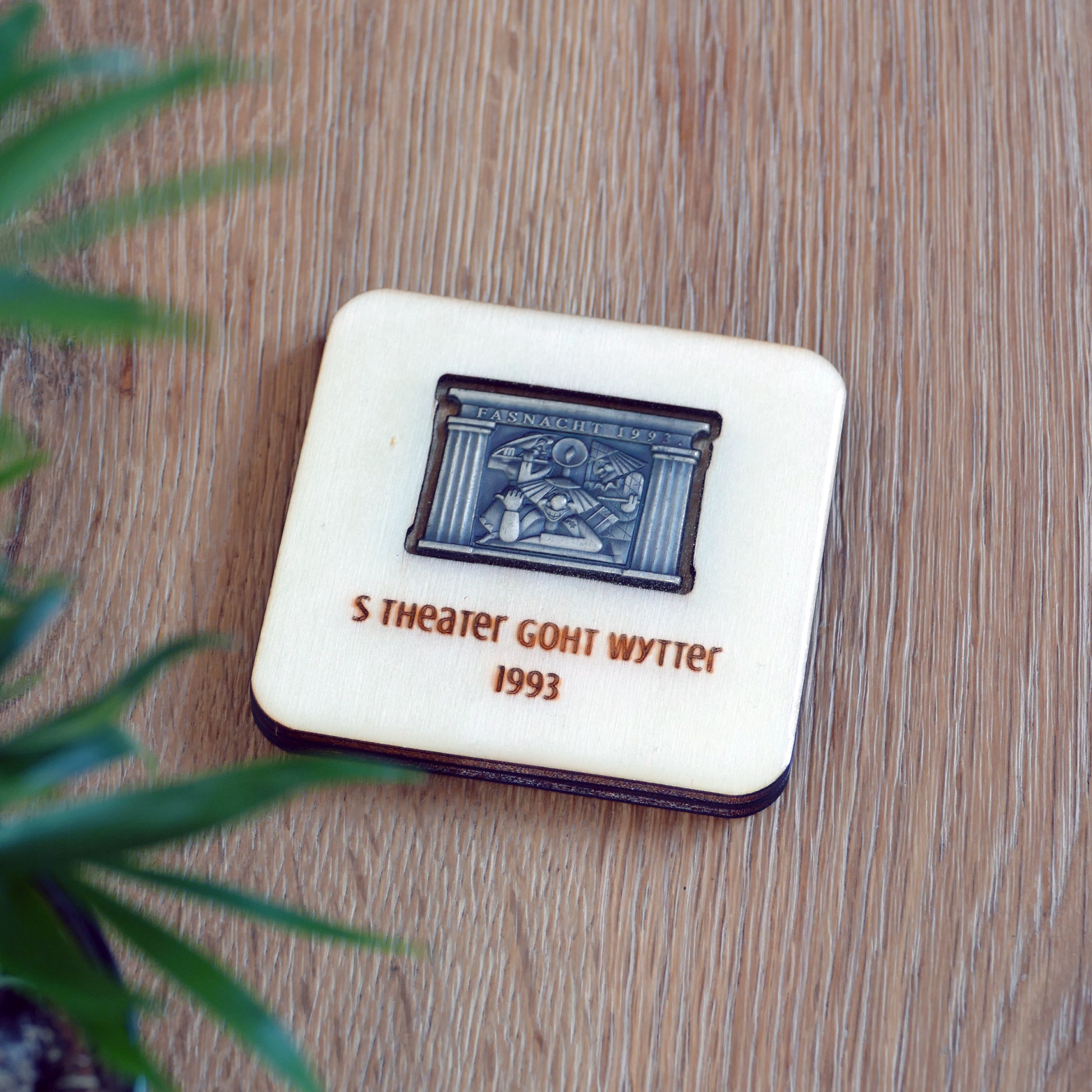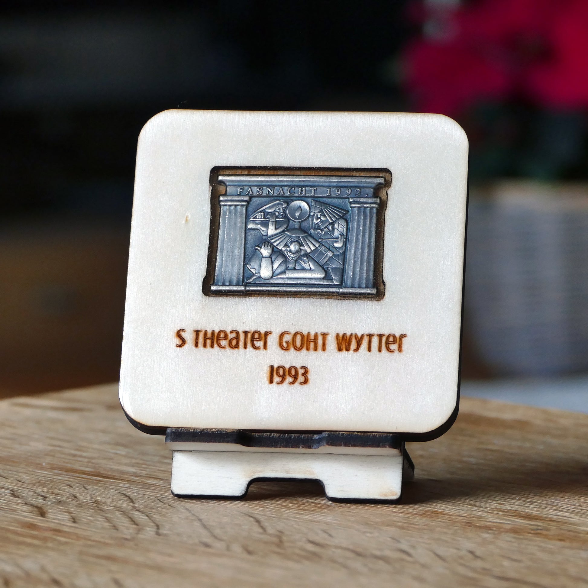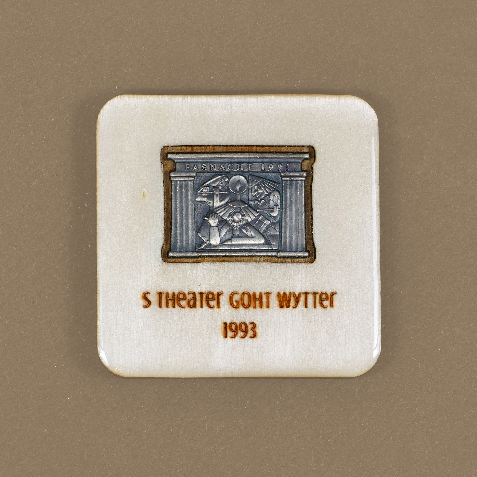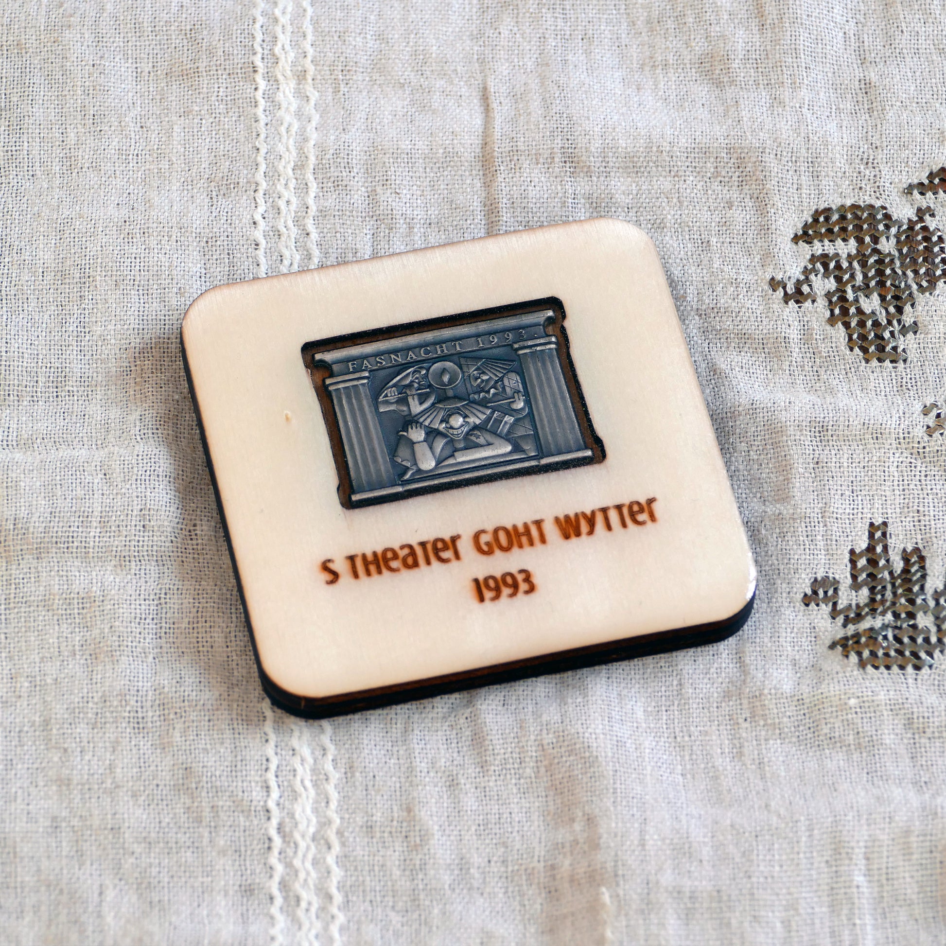 A handcrafted piece featuring a Blaggedde (Basel Fasnacht badge) from 1993. The theme of the year was "S Theater goht wytter" and the Blaggedde was designed by Mirjam Pierig.