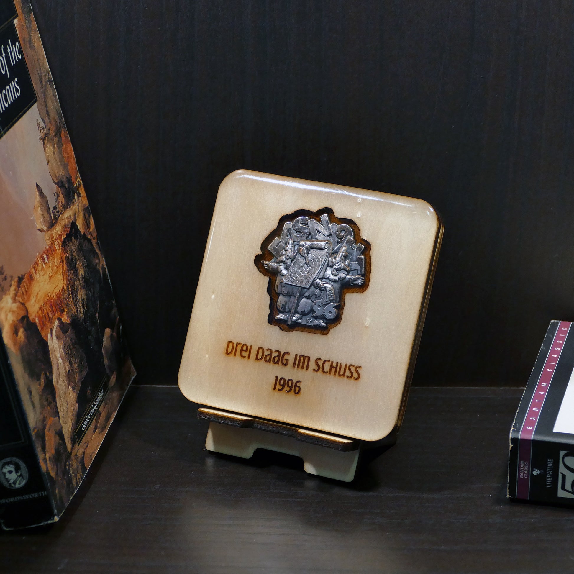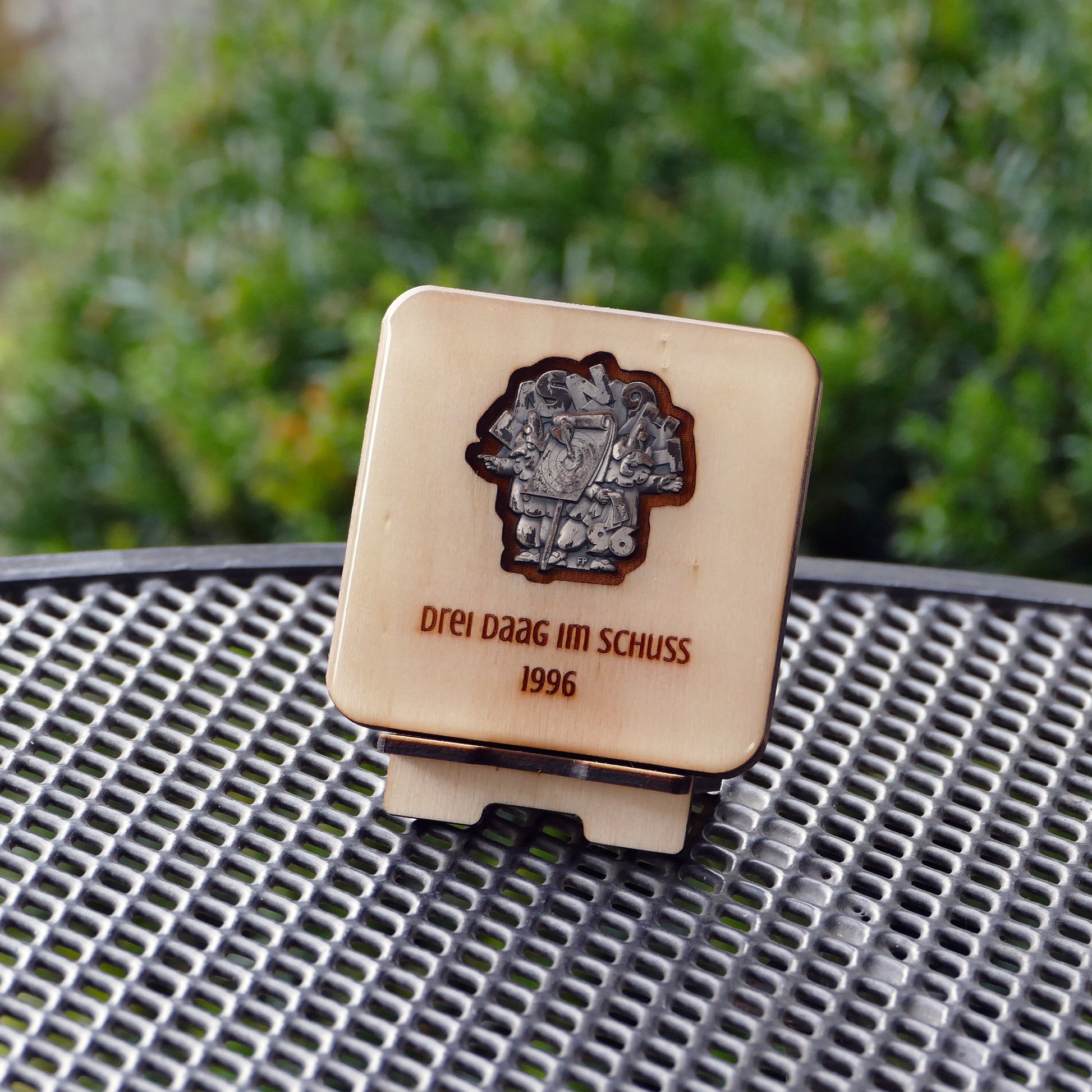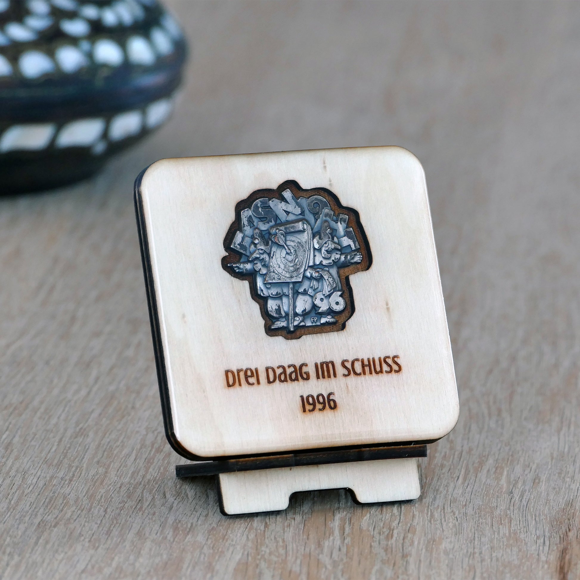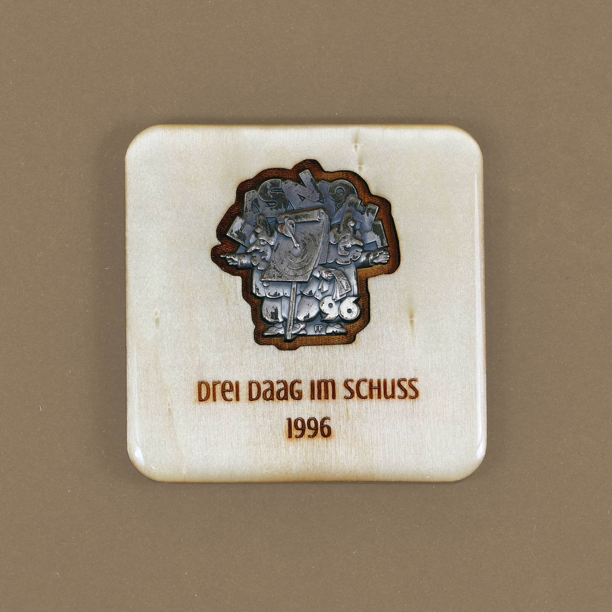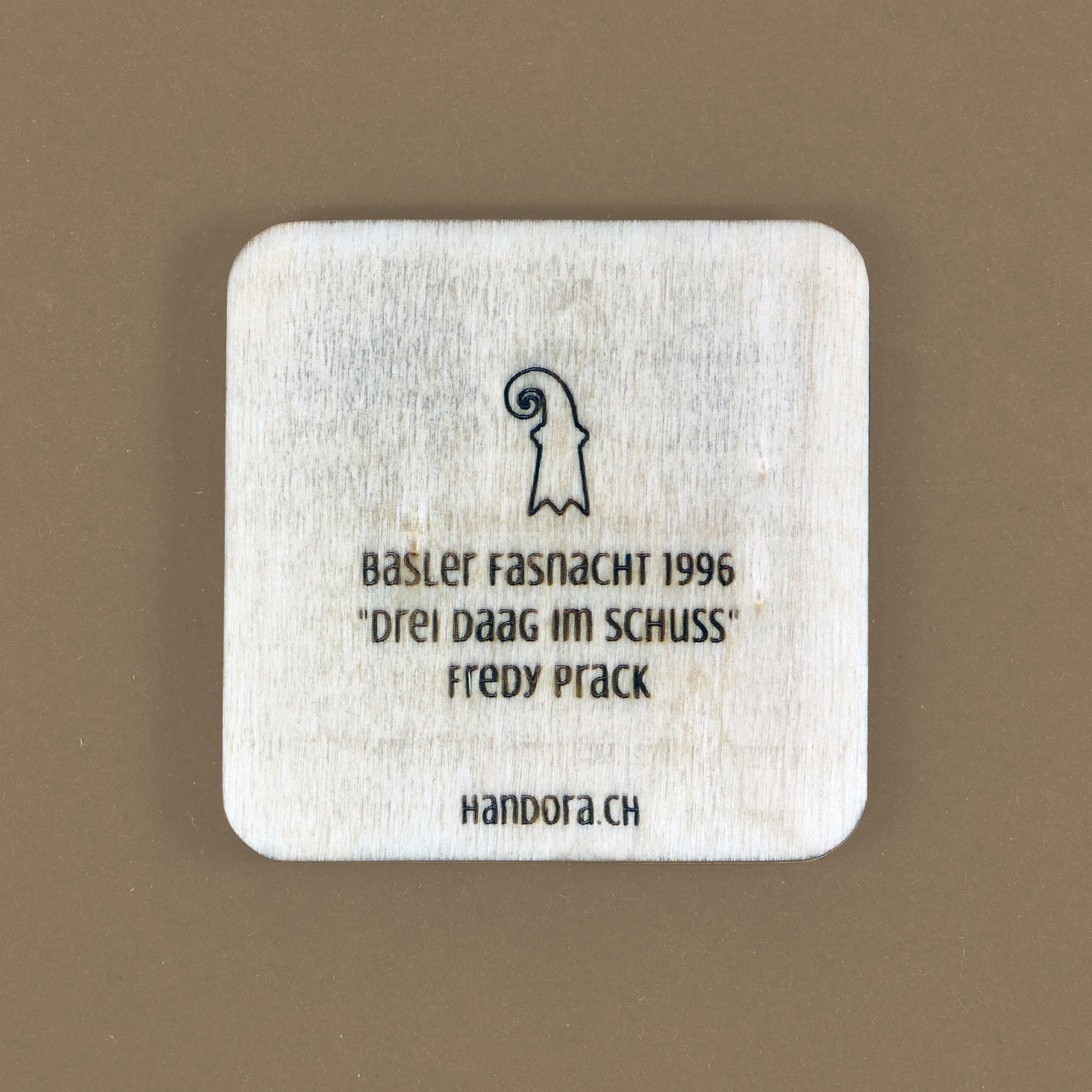 A handcrafted piece featuring a Blaggedde (Basel Fasnacht badge) from 1996. The theme of the year was "Drei Daag im Schuss" and the Blaggedde was designed by Fredy Prack.