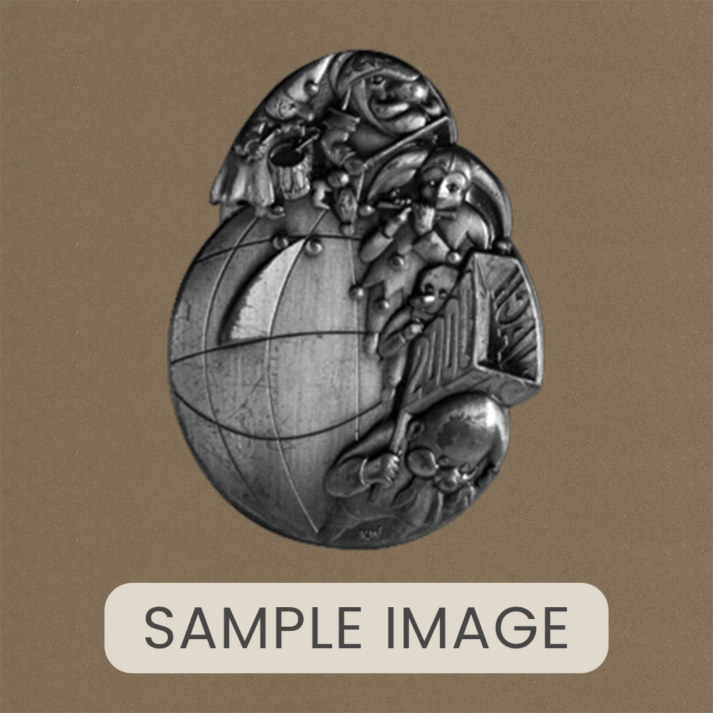 A handcrafted piece featuring a Blaggedde (Basel Fasnacht badge) from 2000. The theme of the year was "Mer kemme uff d Wält" and the Blaggedde was designed by Kurt Walter.