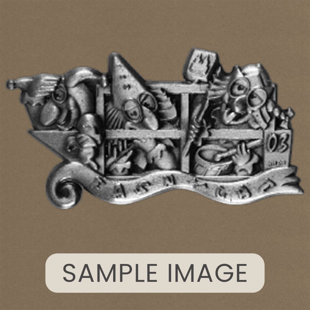 A handcrafted piece featuring a Blaggedde (Basel Fasnacht badge) from 2003. The theme of the year was "Willi Hochuli und Daniel Ryser" and the Blaggedde was designed by Mir gseen duure!.