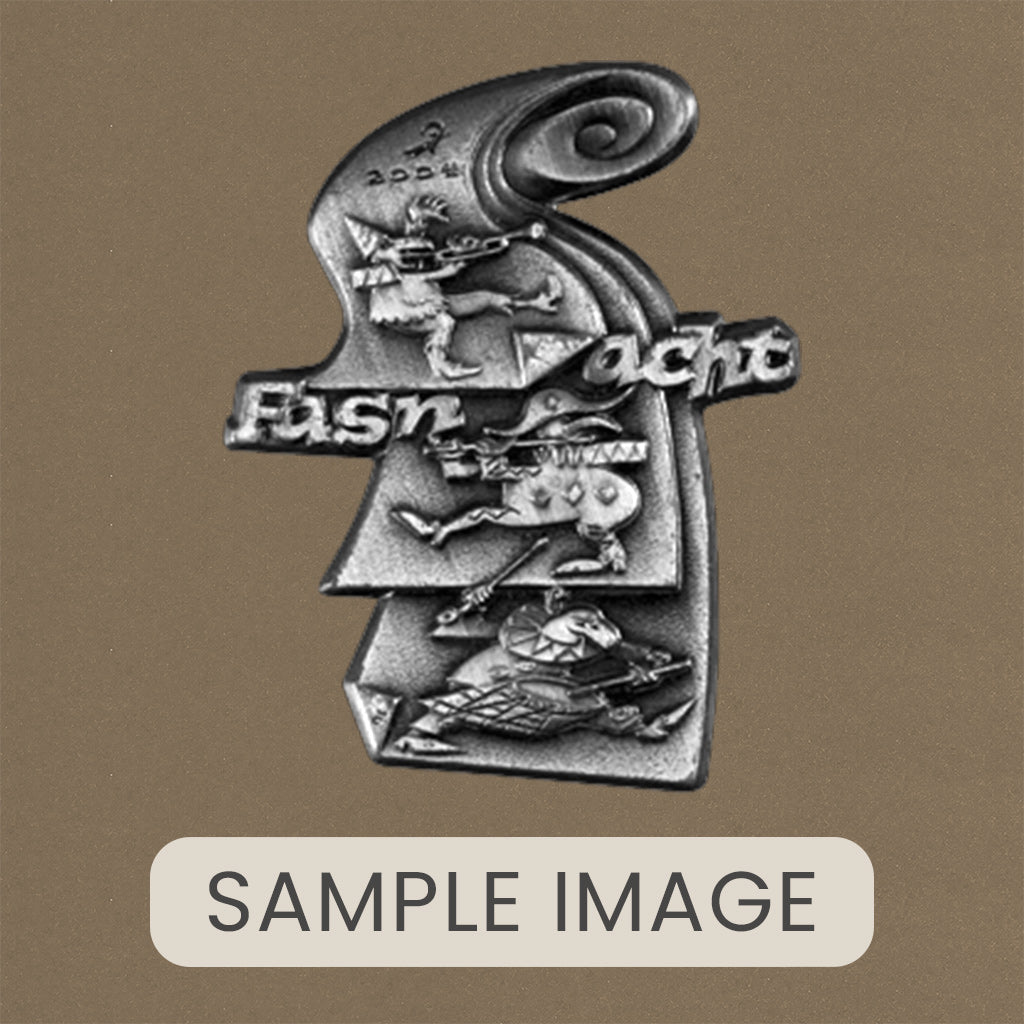 A handcrafted piece featuring a Blaggedde (Basel Fasnacht badge) from 2004. The theme of the year was "Kai Blatt vors Muul" and the Blaggedde was designed by Daniel Laufer.