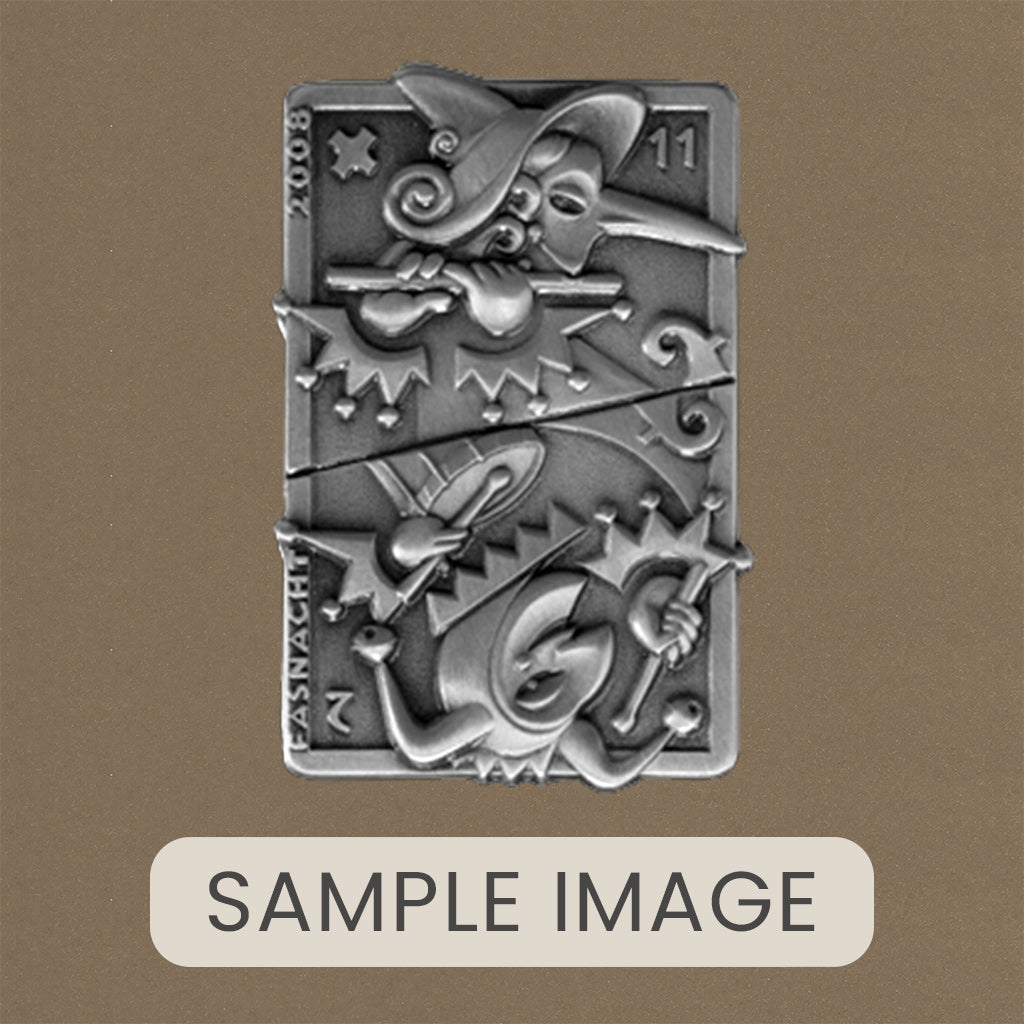 A handcrafted piece featuring a Blaggedde (Basel Fasnacht badge) from 2008. The theme of the year was "Mir spile us" and the Blaggedde was designed by Pascal Kottmann.