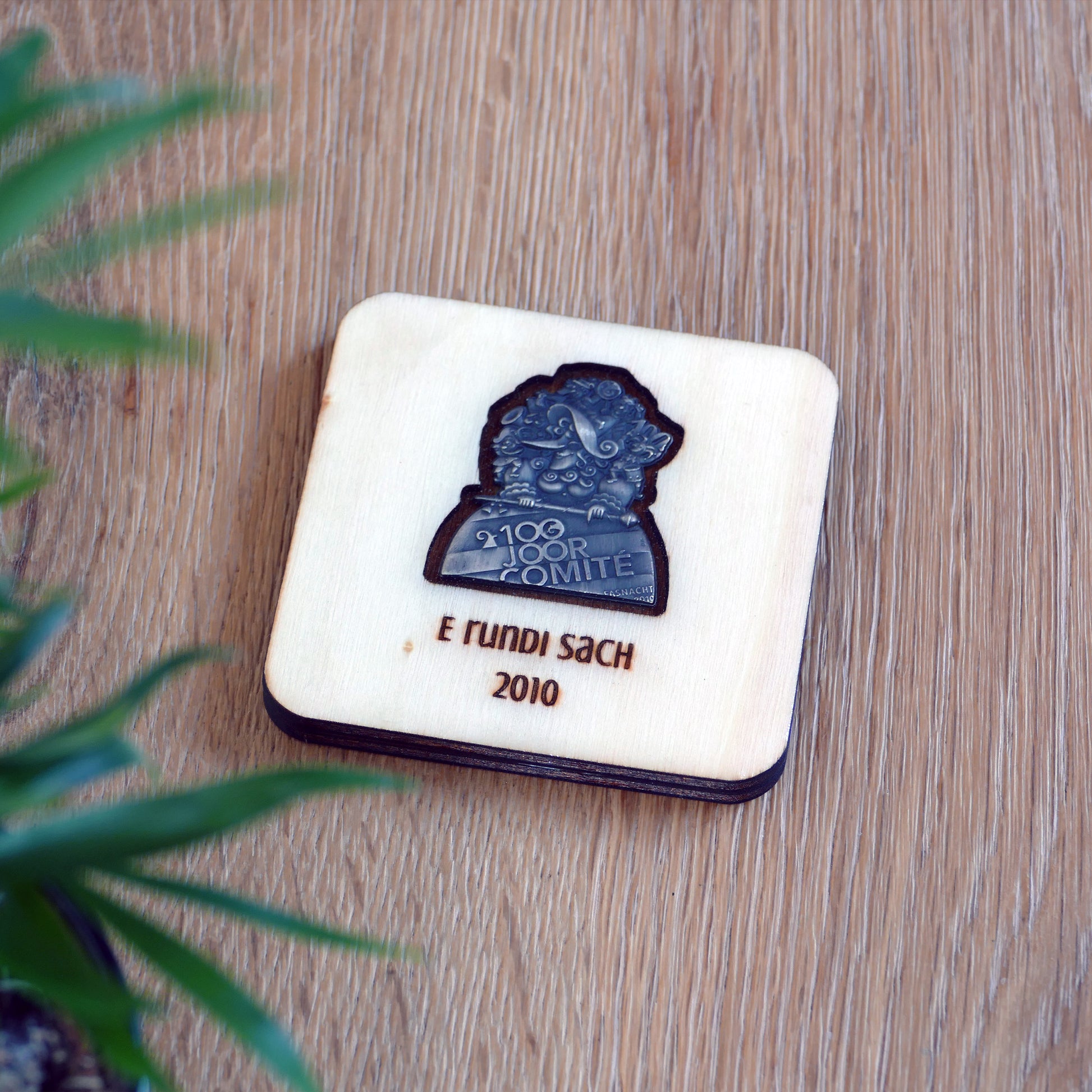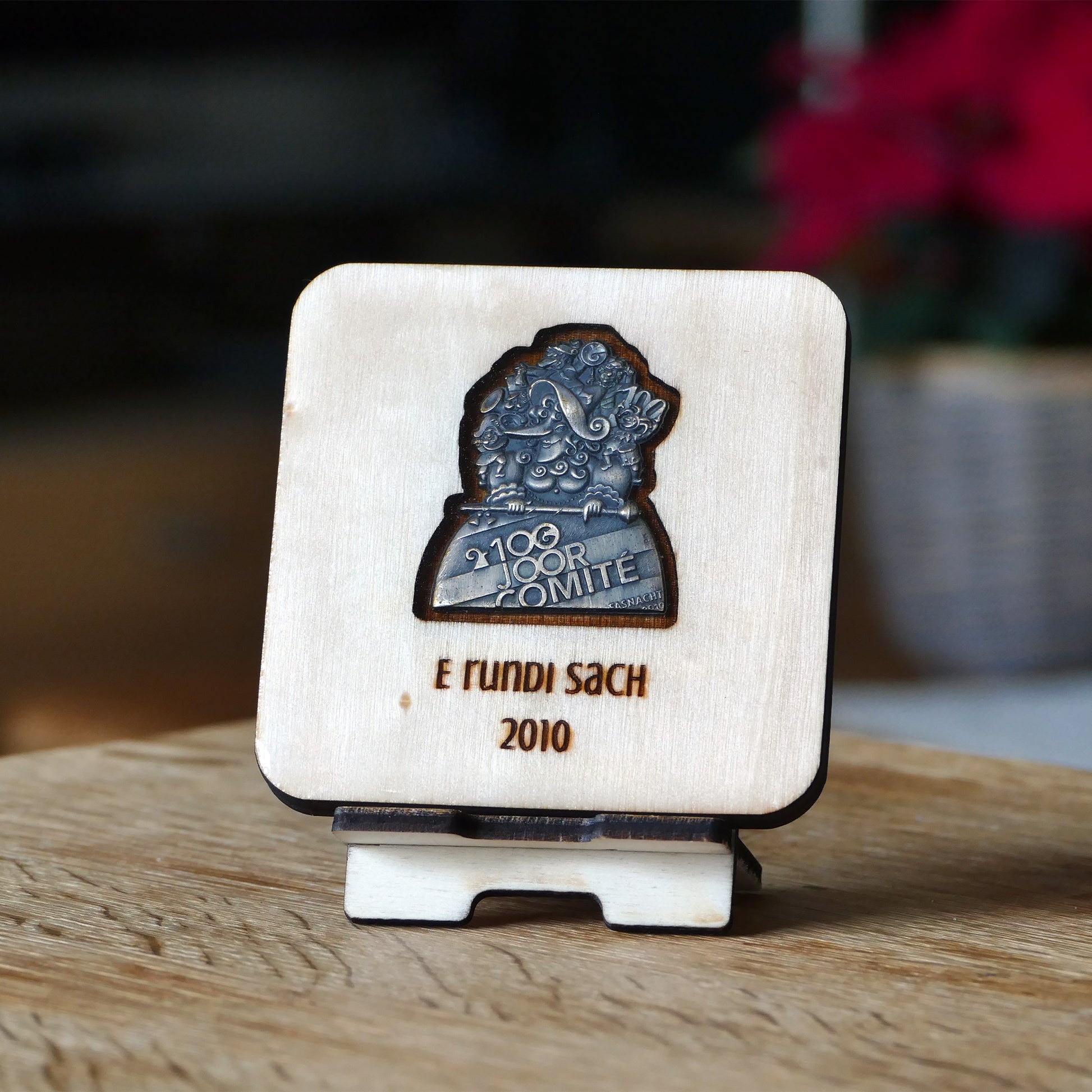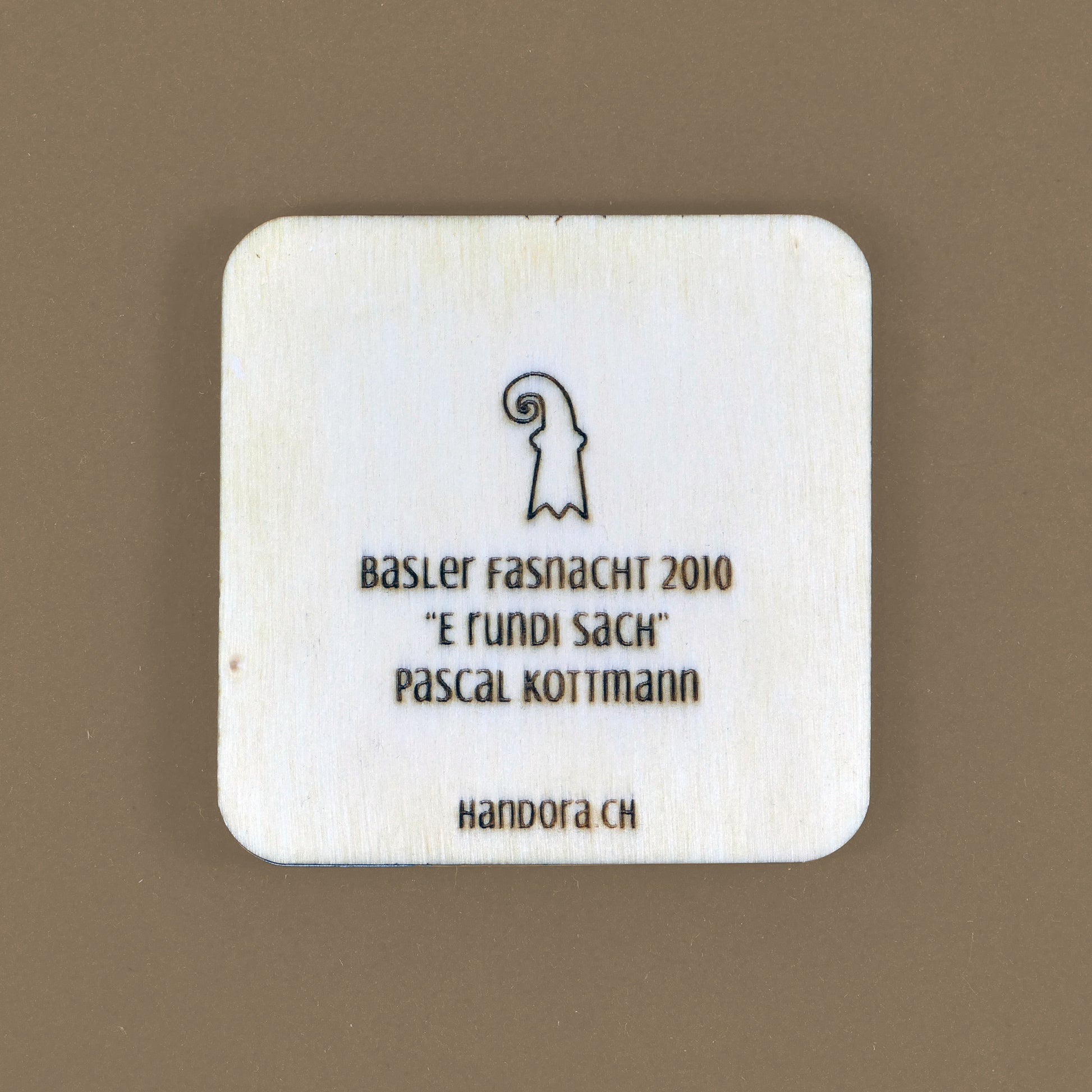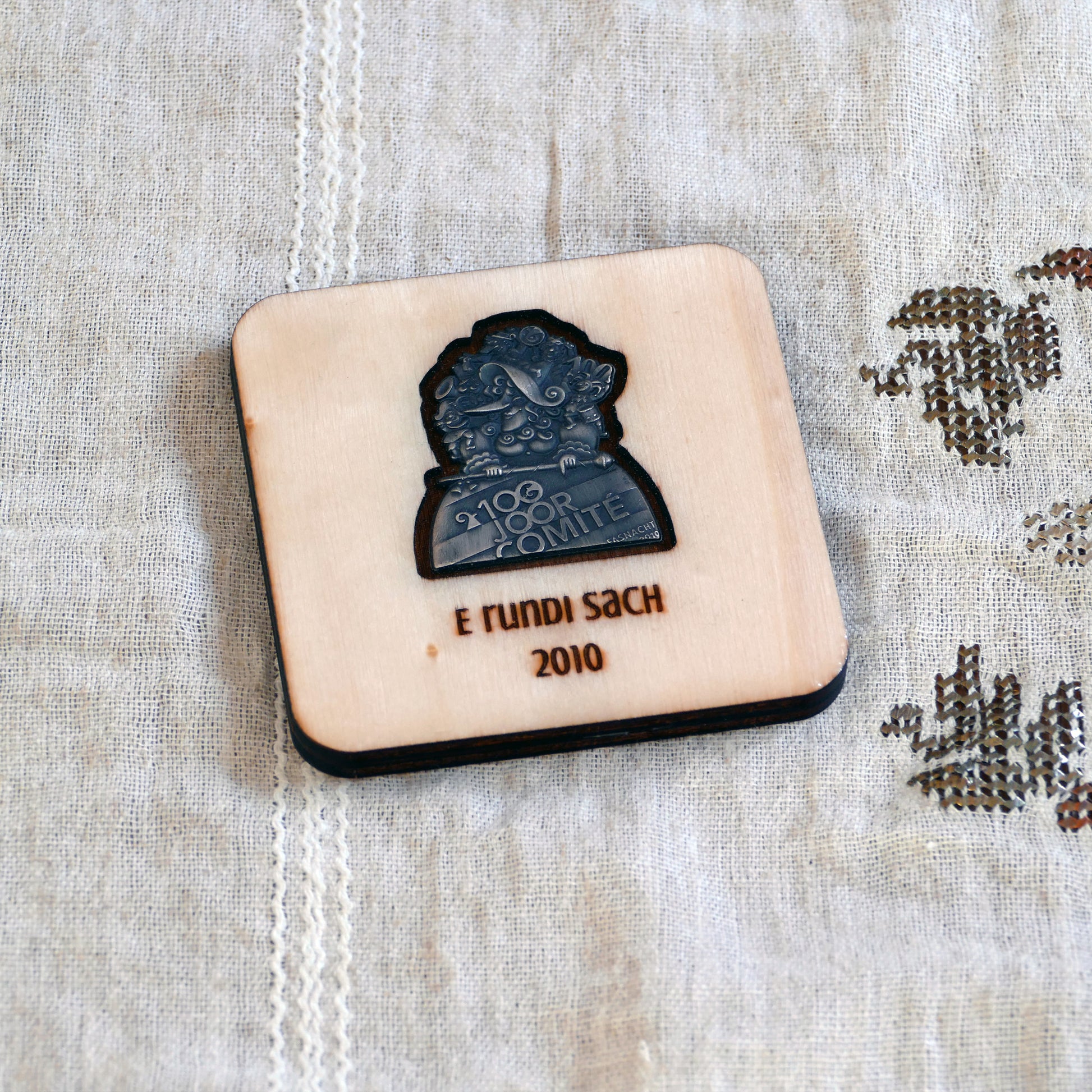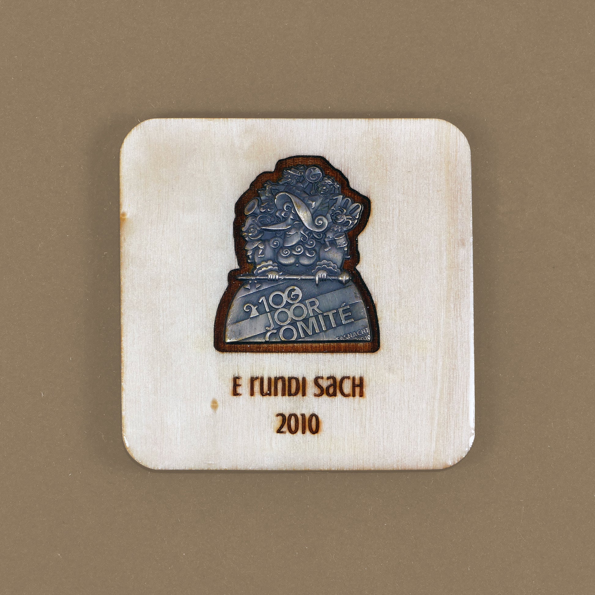 A handcrafted piece featuring a Blaggedde (Basel Fasnacht badge) from 2010. The theme of the year was "E rundi Sach" and the Blaggedde was designed by Pascal Kottmann.