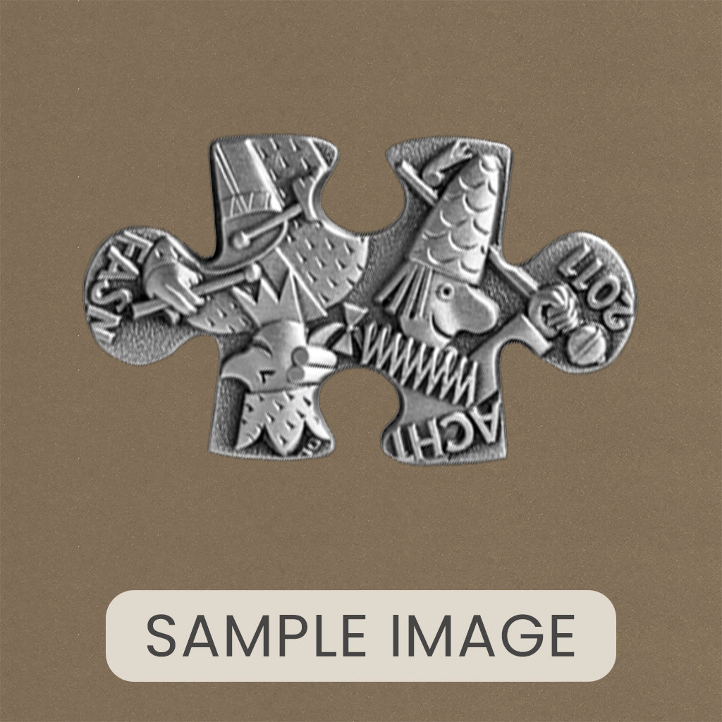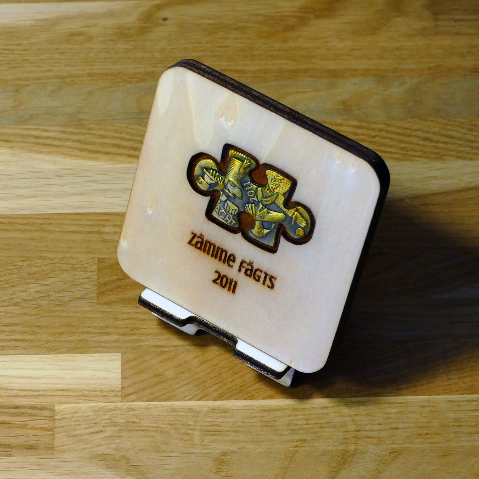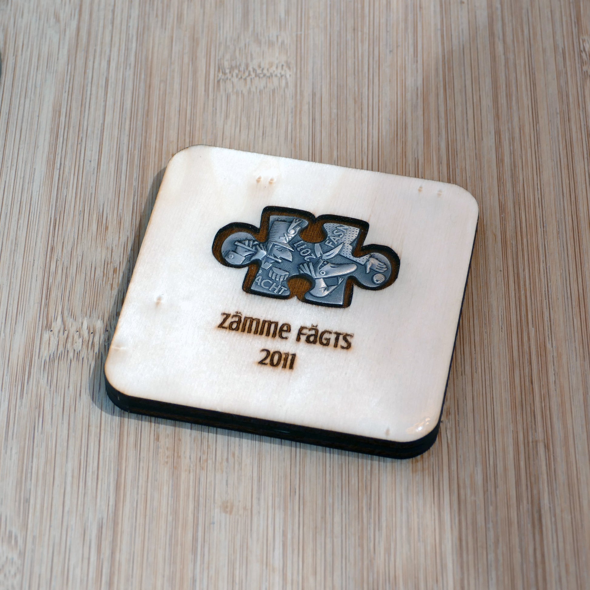 Dieses handgefertigte Stück besteht aus zwei Lagen 4 mm starkem Sperrholz. Die obere Lage ist präzise lasergeschnitten und passt perfekt zum Abzeichen, das auf der unteren Lage befestigt ist. Die Oberfläche ist mit Epoxidharz versiegelt, wodurch sie glatt und wasserabweisend ist und die Details des Abzeichens hervorhebt. Seiten und Unterseite sind mit Hartwachsöl behandelt, um das Holz zu schützen und seine natürliche Maserung zu bewahren.