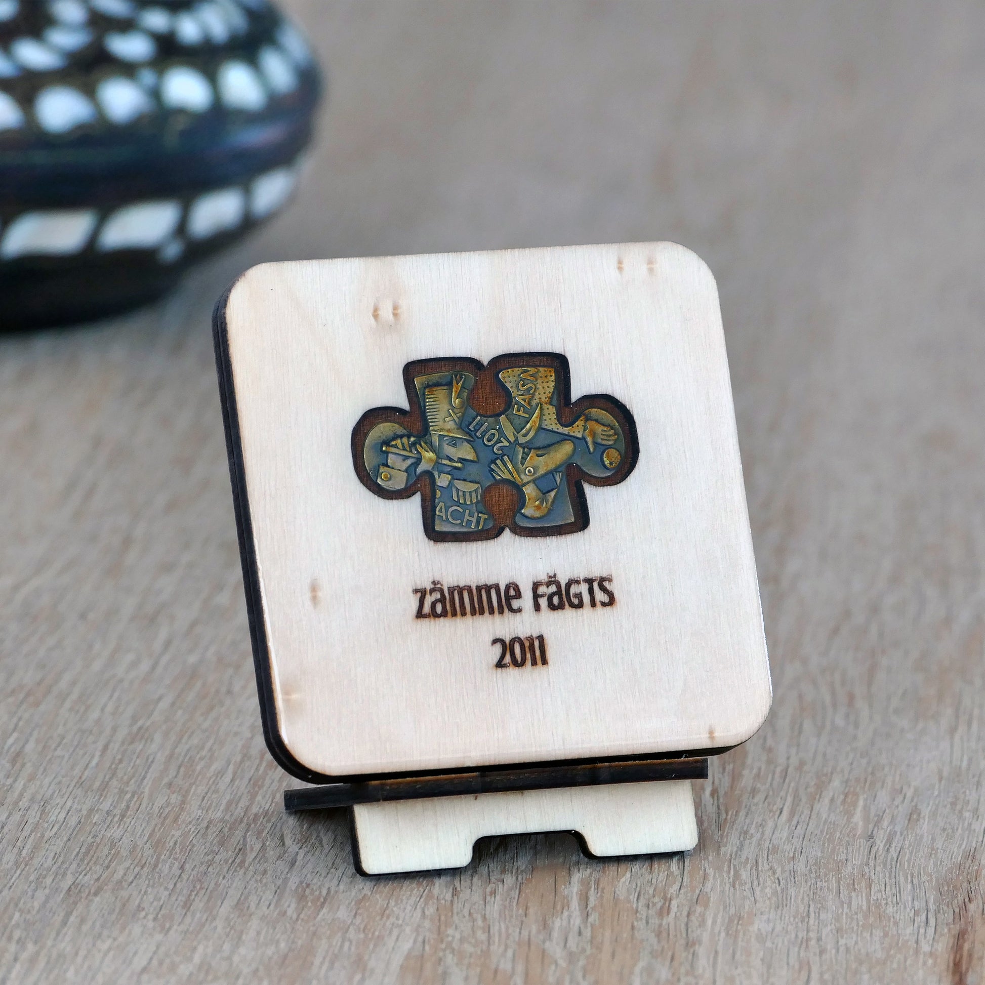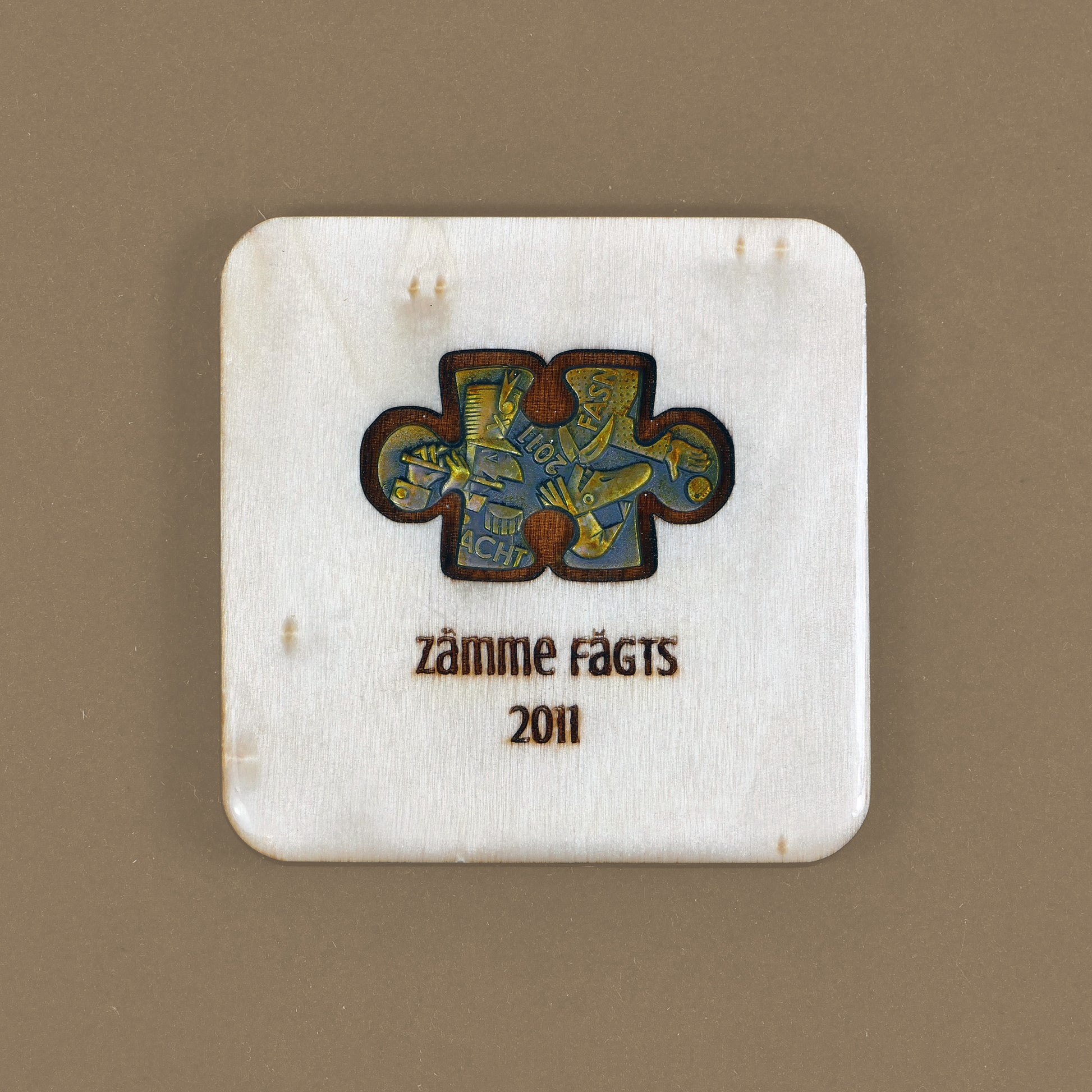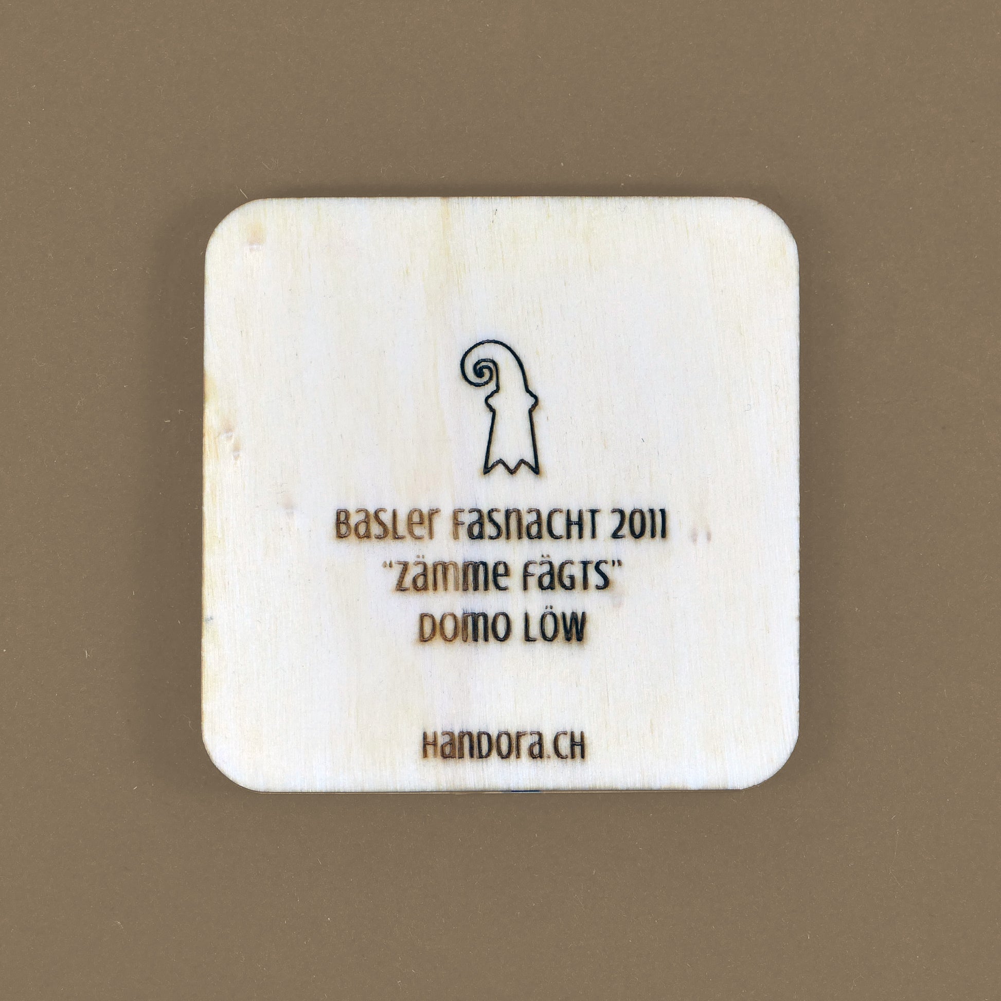 A handcrafted piece featuring a Blaggedde (Basel Fasnacht badge) from 2011. The theme of the year was "Zämme fägts" and the Blaggedde was designed by Domo Löw.