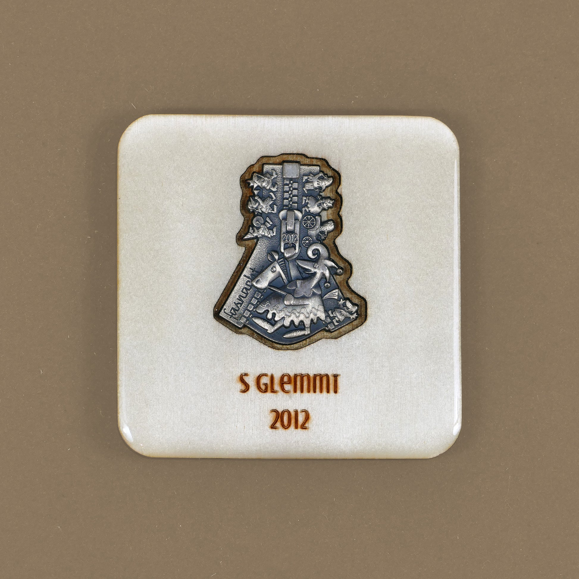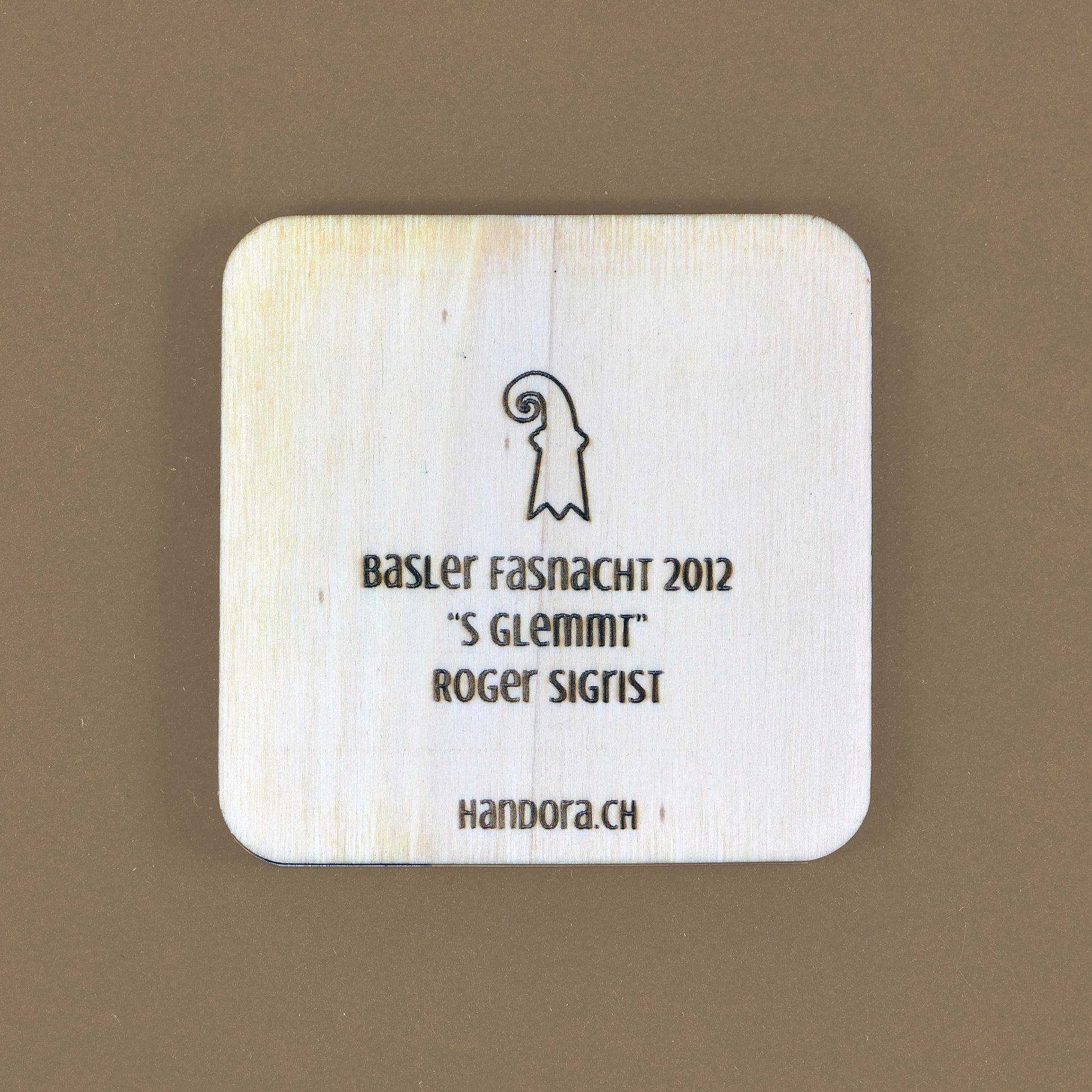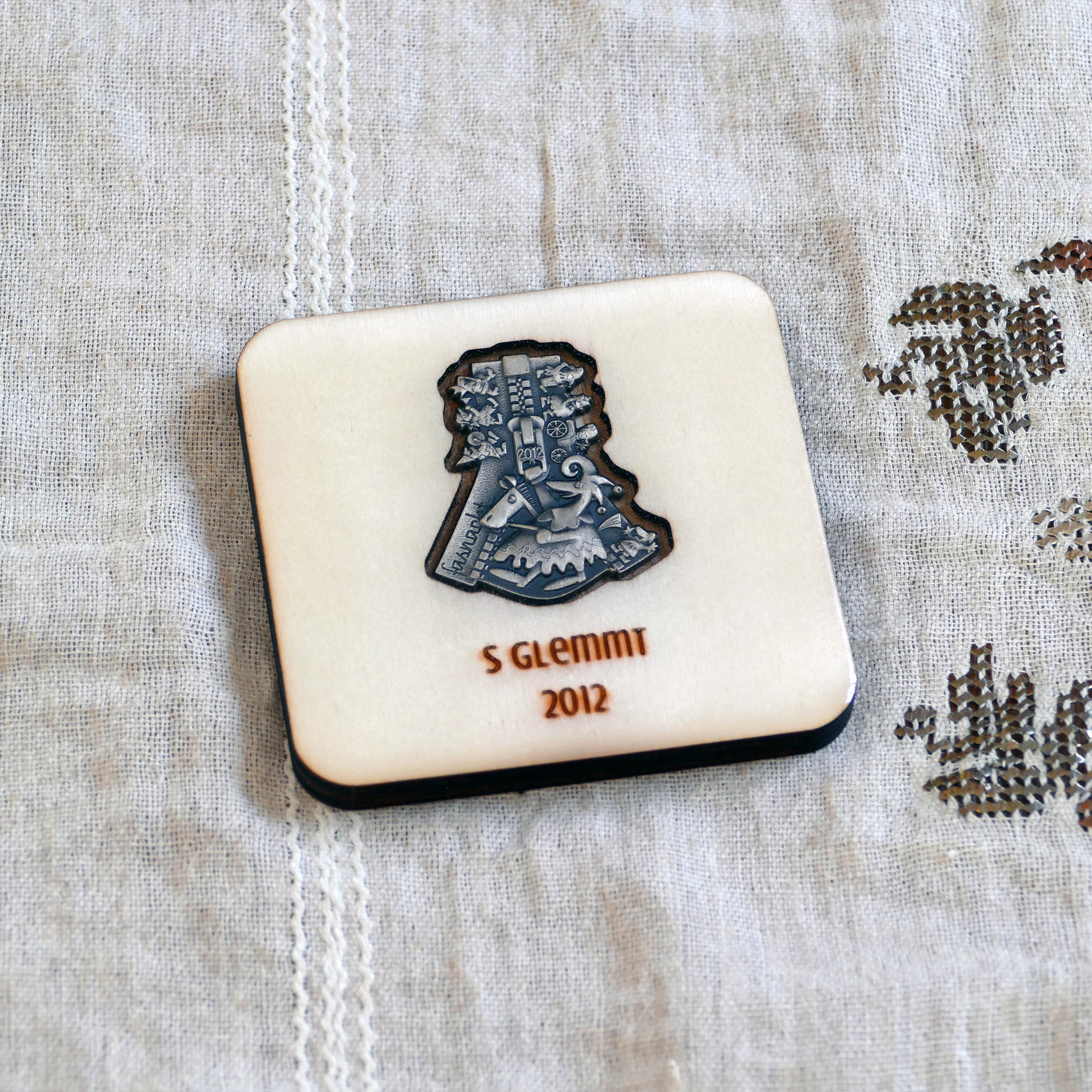 A handcrafted piece featuring a Blaggedde (Basel Fasnacht badge) from 2012. The theme of the year was "S glemmt" and the Blaggedde was designed by Roger Sigrist.