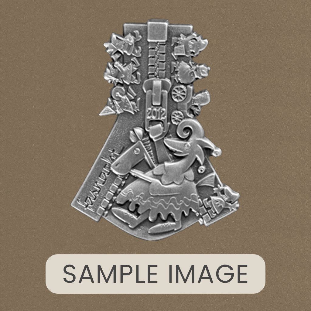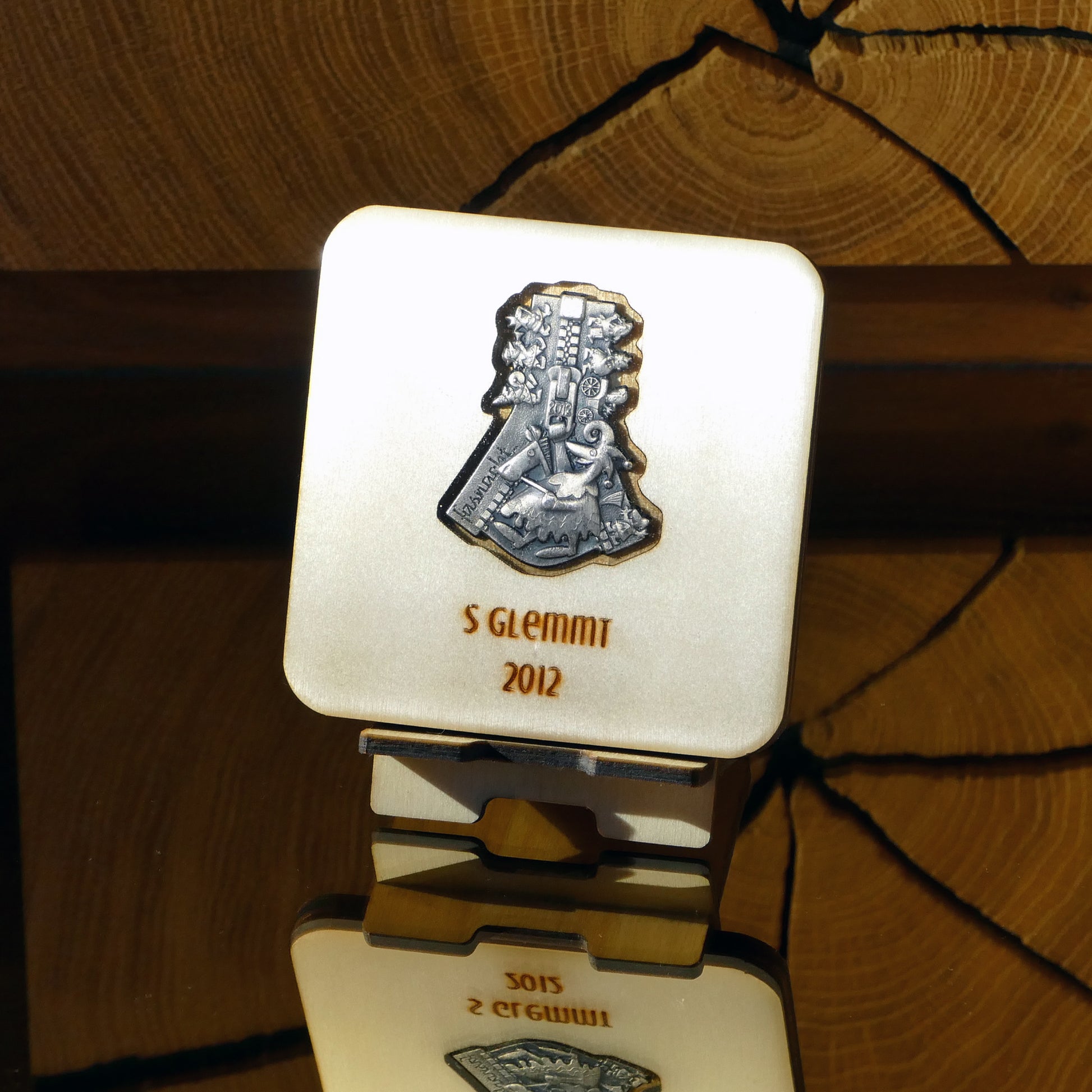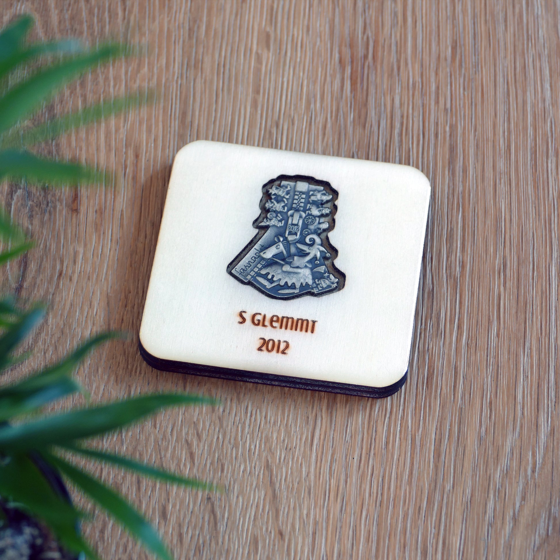 A handcrafted piece featuring a Blaggedde (Basel Fasnacht badge) from 2012. The theme of the year was "S glemmt" and the Blaggedde was designed by Roger Sigrist.