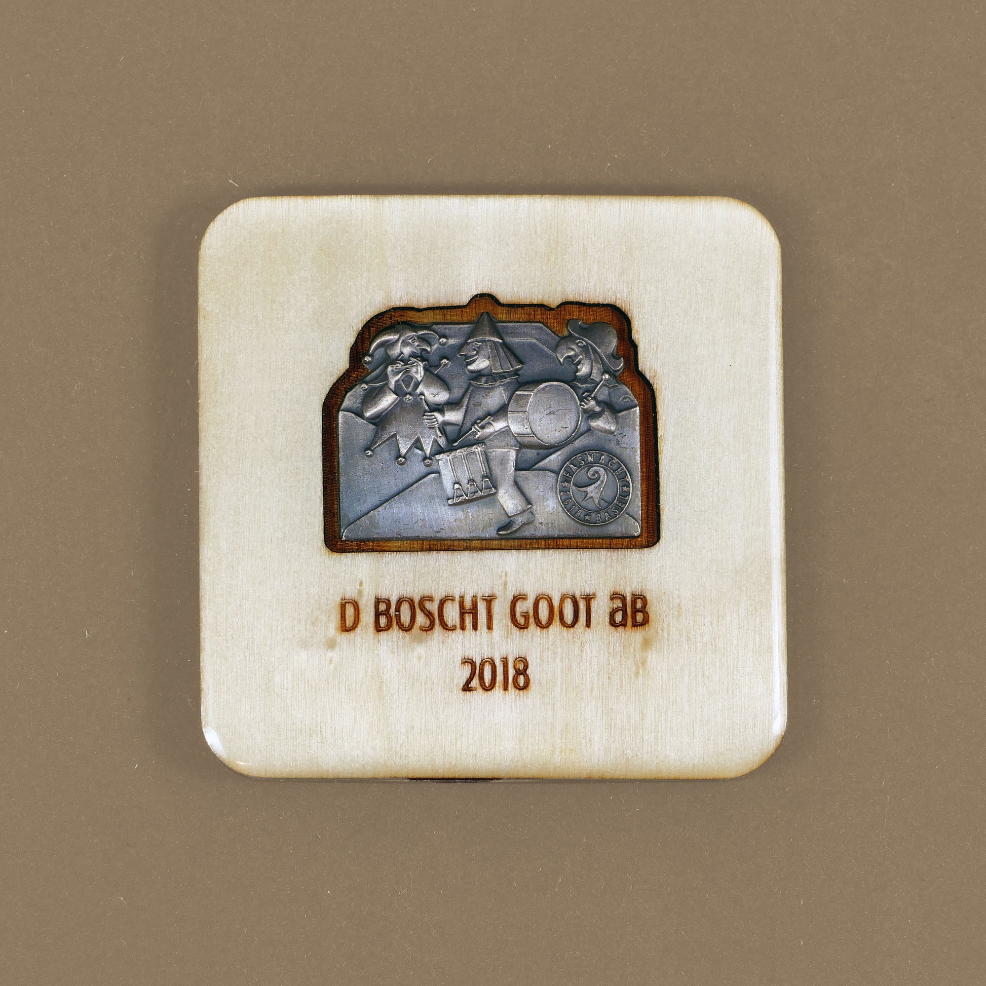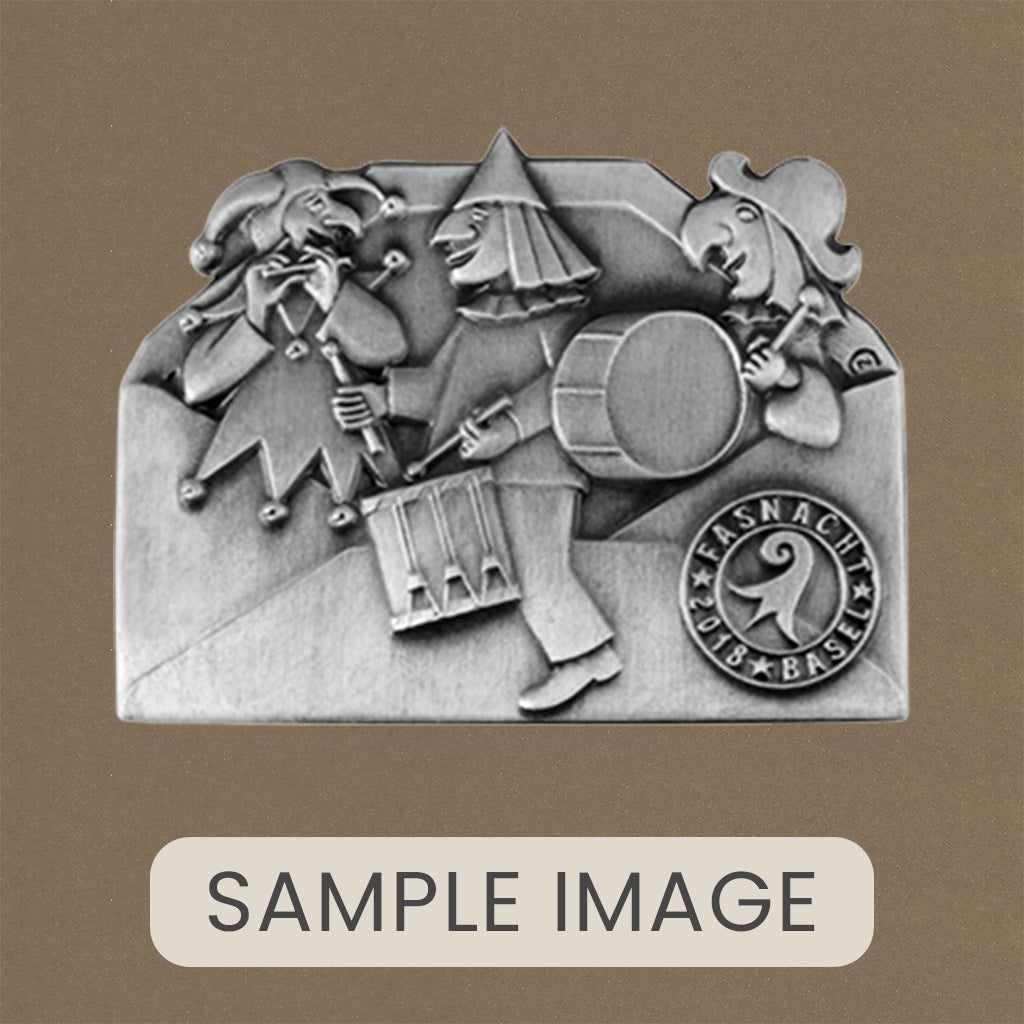 A handcrafted piece featuring a Blaggedde (Basel Fasnacht badge) from 2018. The theme of the year was "D Boscht goot ab" and the Blaggedde was designed by Clelia Zoller.