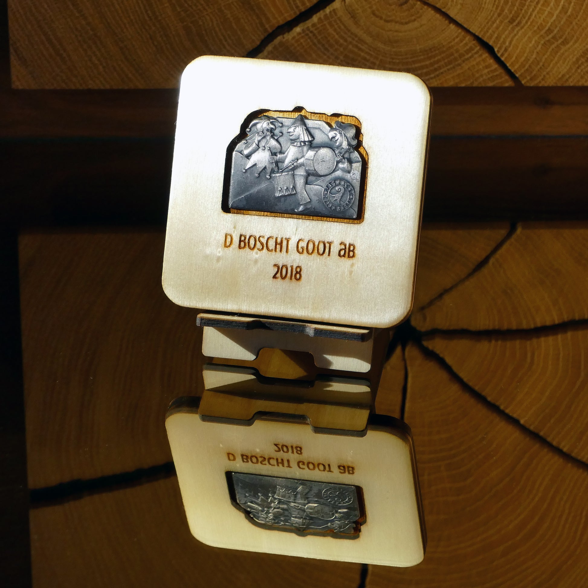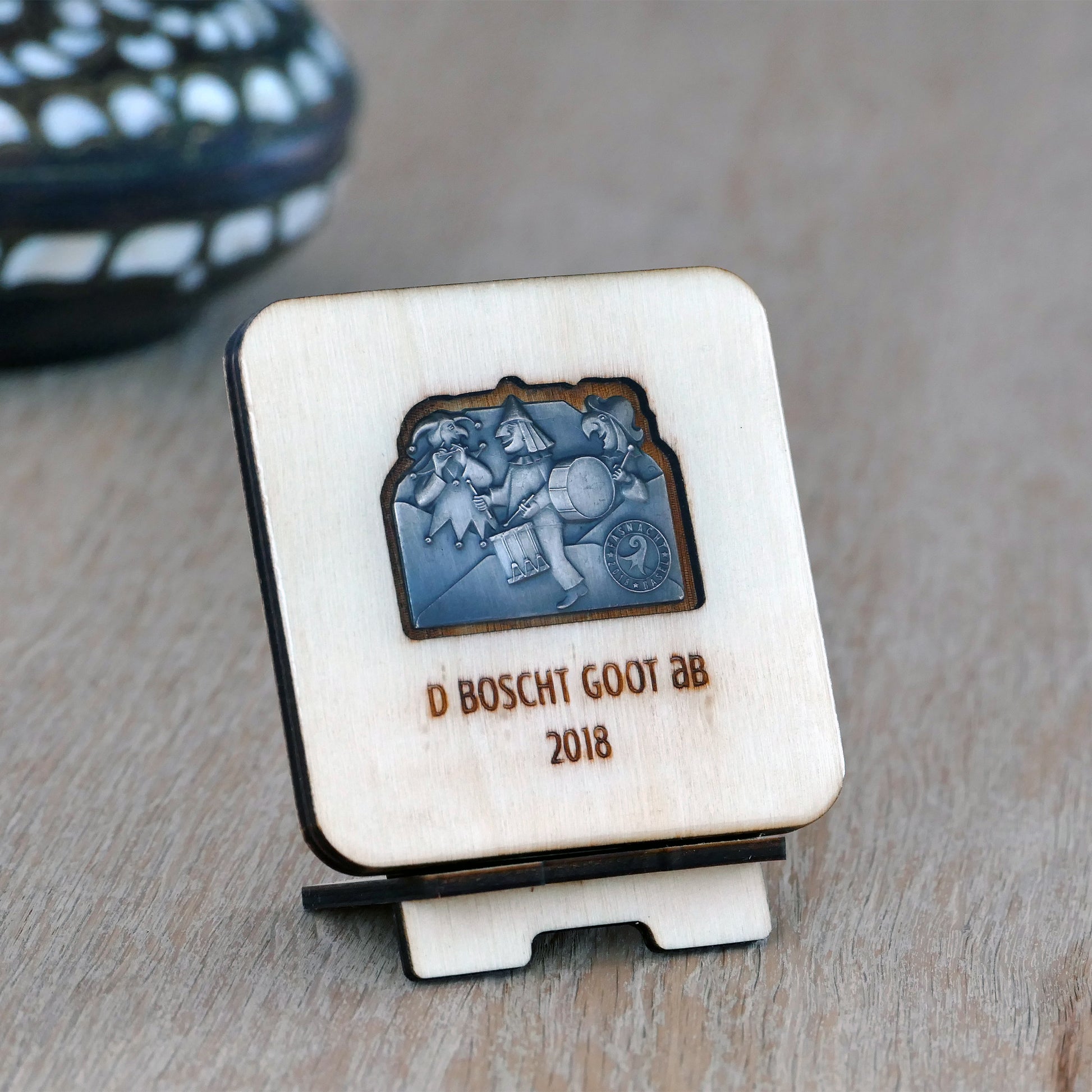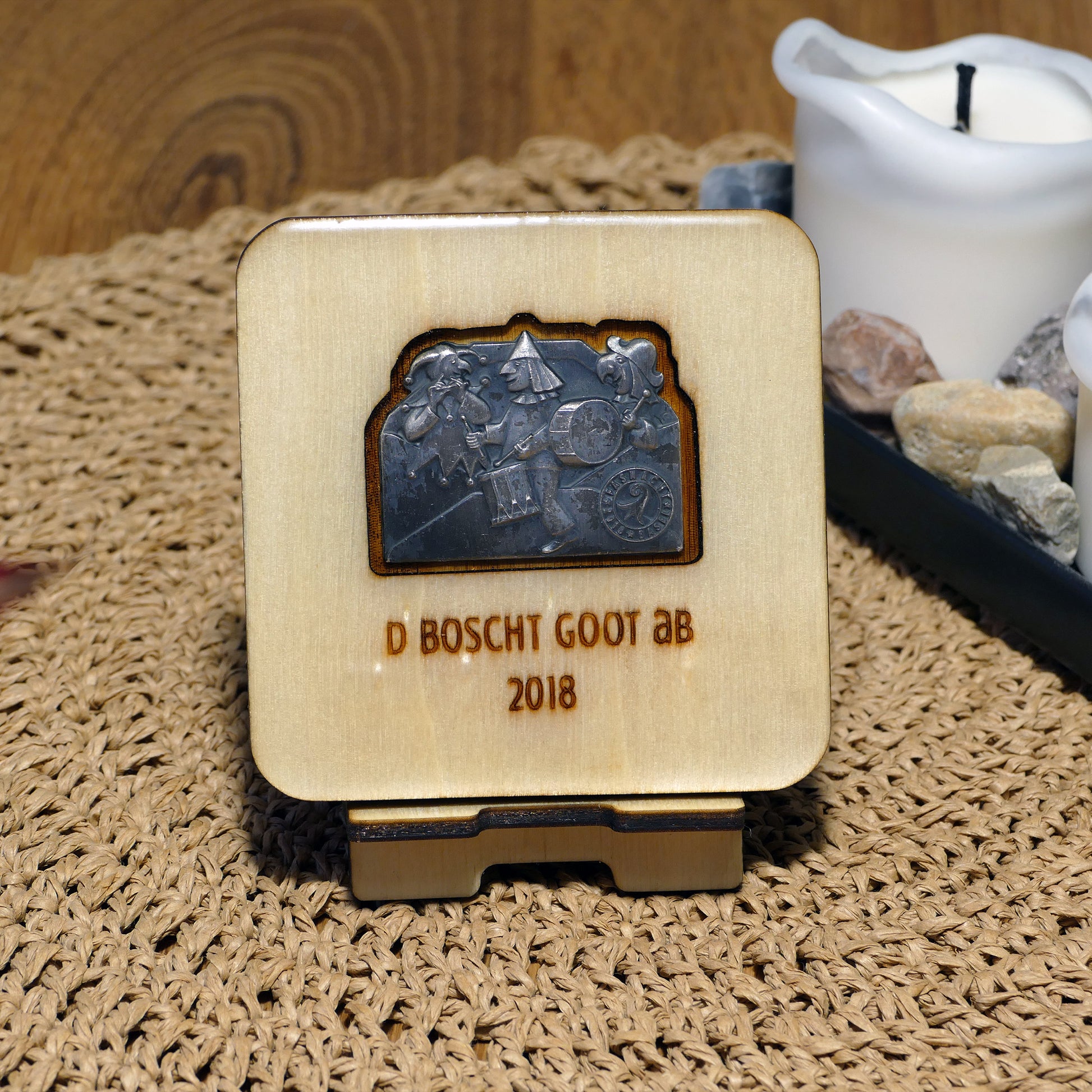 Dieses handgefertigte Stück besteht aus zwei Lagen 4 mm starkem Sperrholz. Die obere Lage ist präzise lasergeschnitten und passt perfekt zum Abzeichen, das auf der unteren Lage befestigt ist. Die Oberfläche ist mit Epoxidharz versiegelt, wodurch sie glatt und wasserabweisend ist und die Details des Abzeichens hervorhebt. Seiten und Unterseite sind mit Hartwachsöl behandelt, um das Holz zu schützen und seine natürliche Maserung zu bewahren.