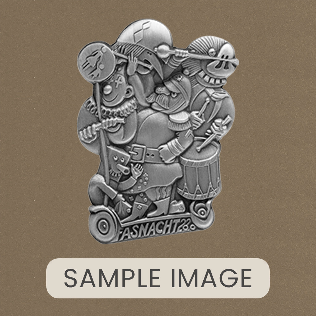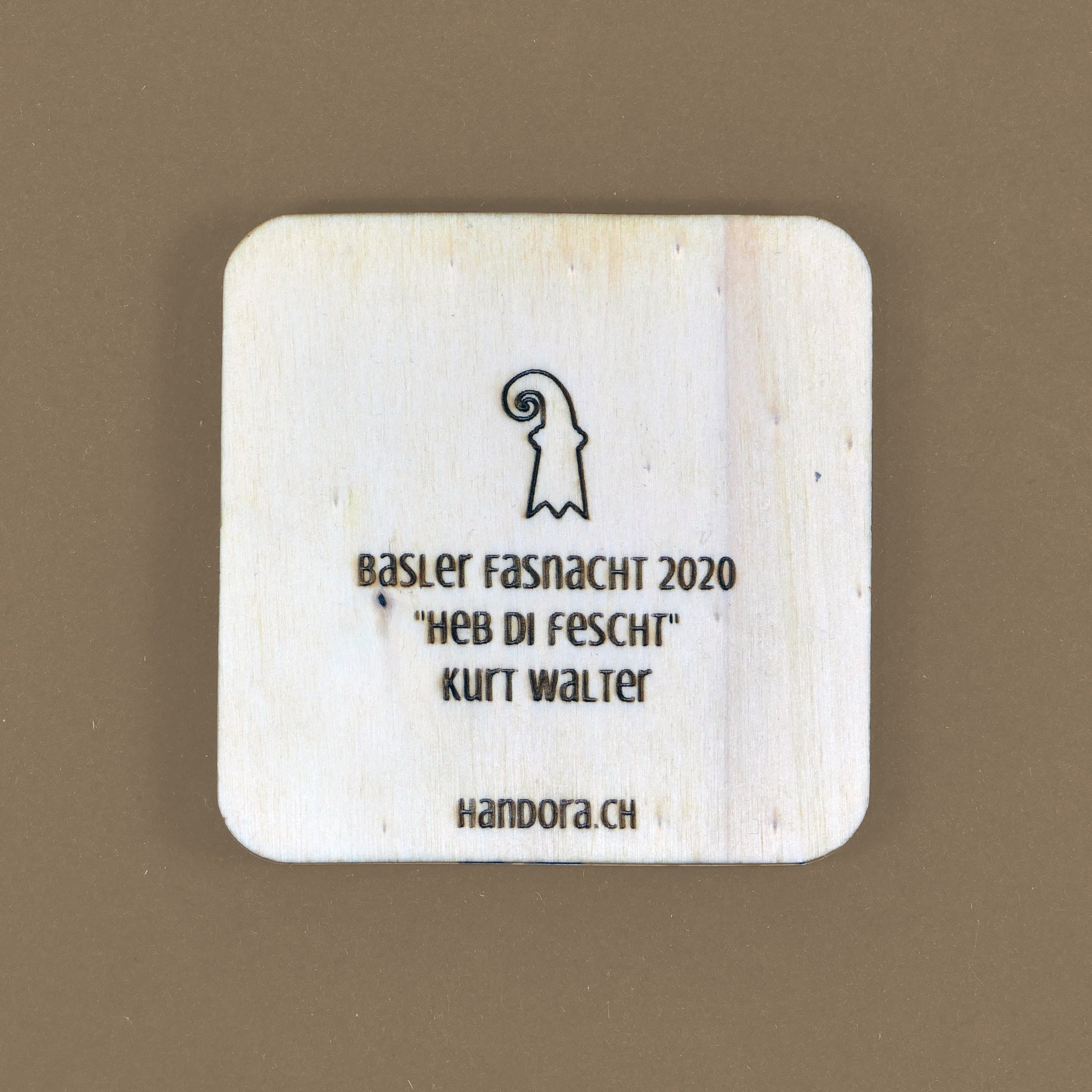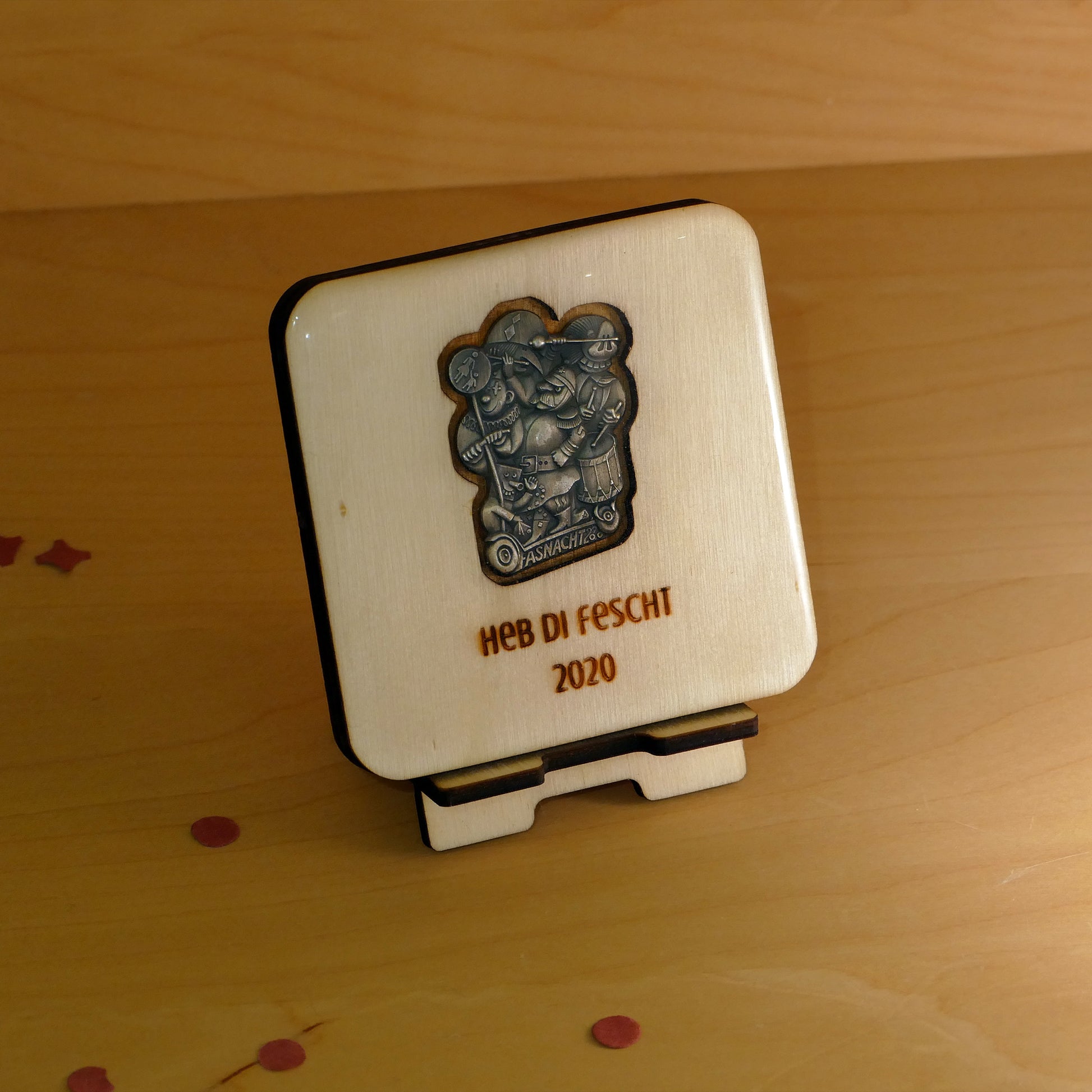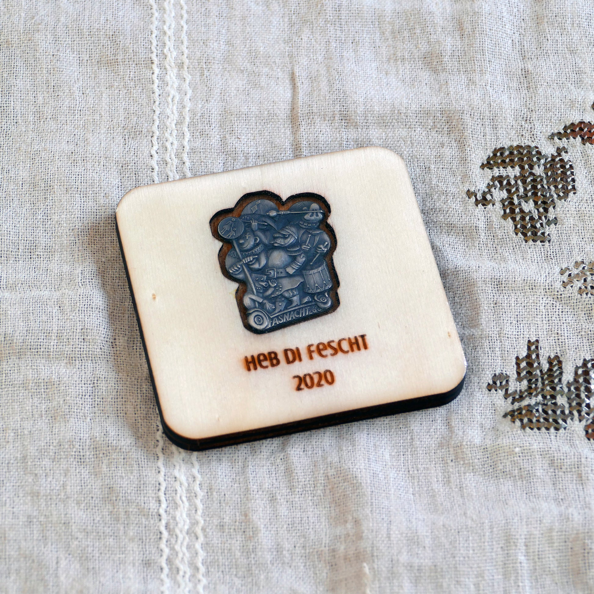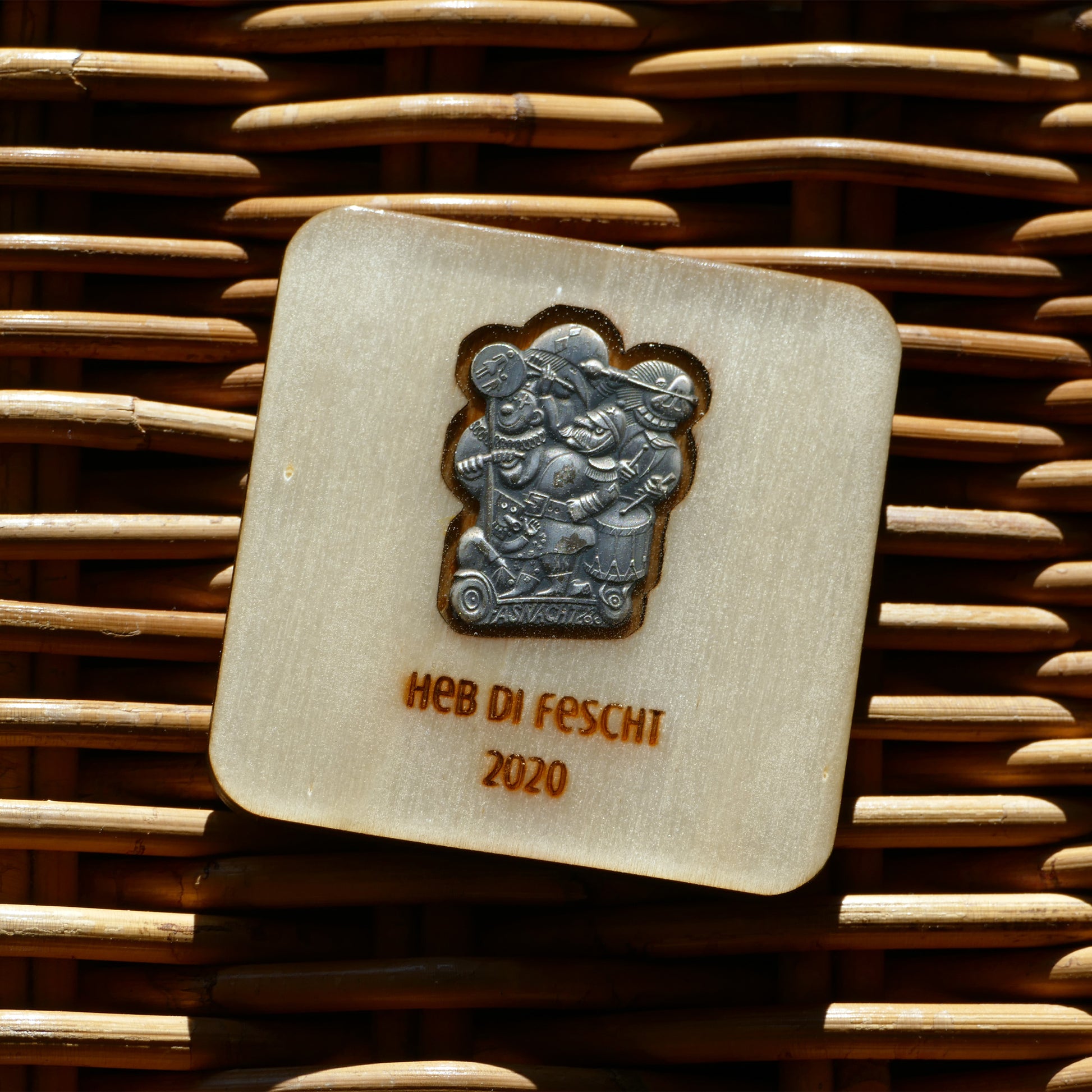 A handcrafted piece featuring a Blaggedde (Basel Fasnacht badge) from 2020. The theme of the year was "Heb di fescht" and the Blaggedde was designed by Kurt Walter.