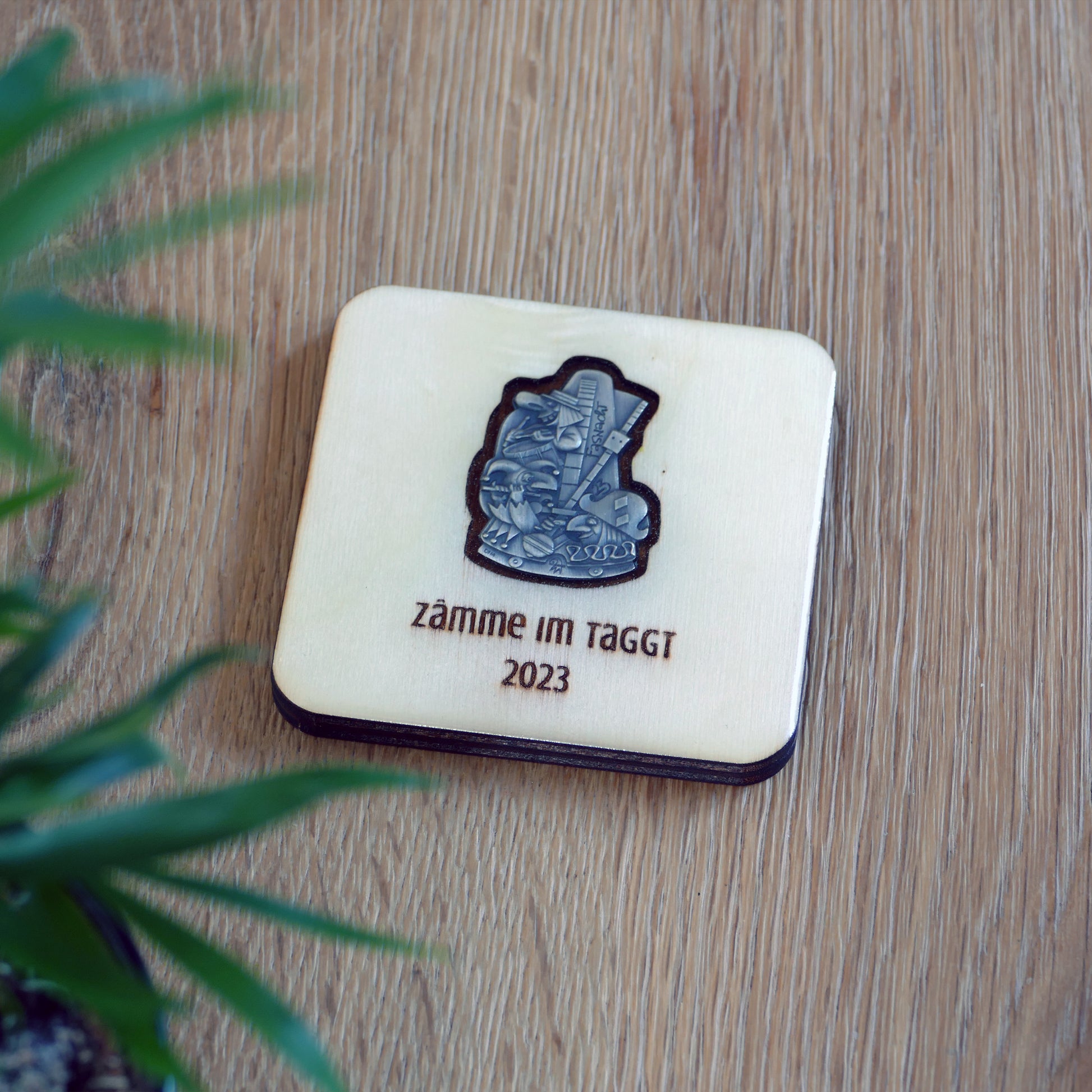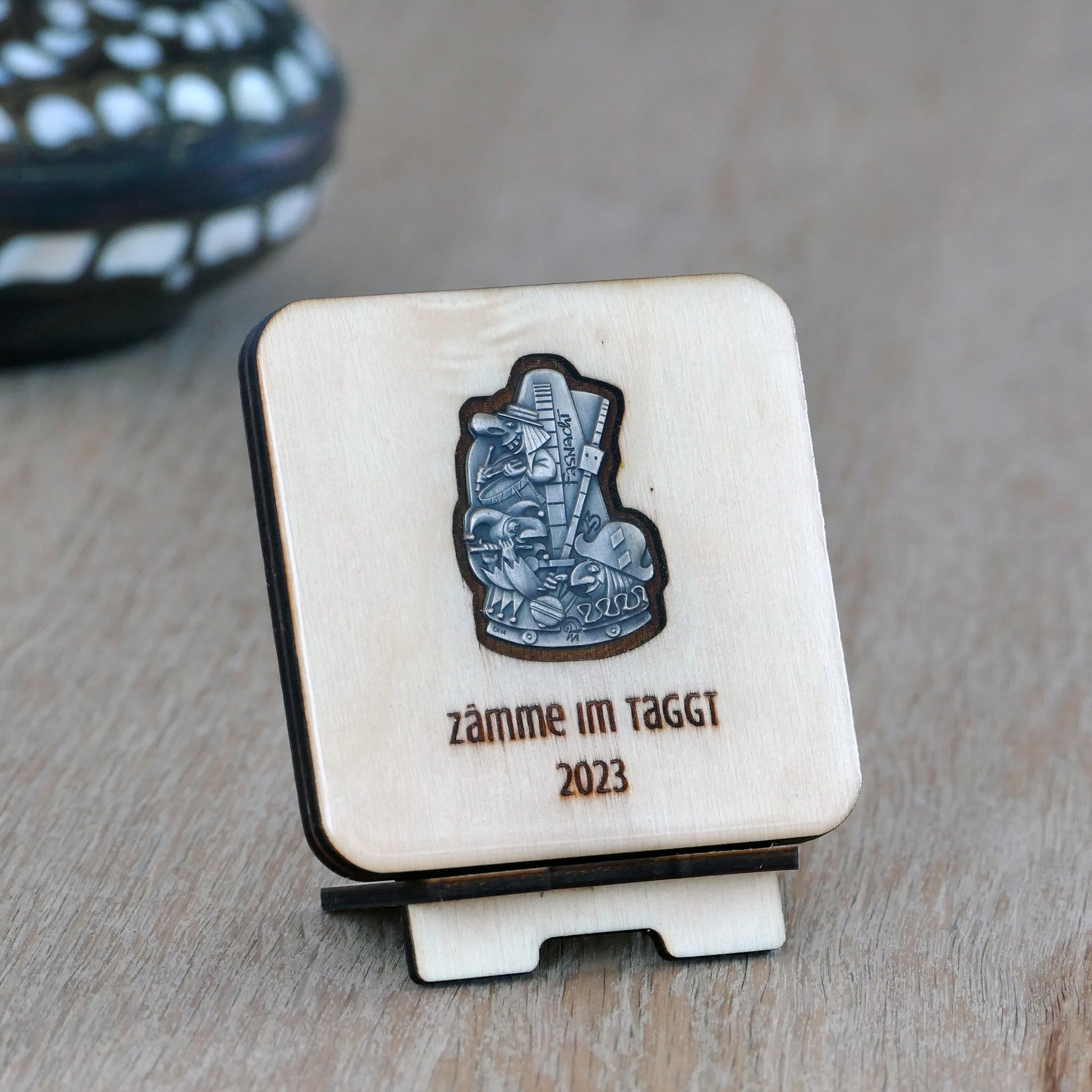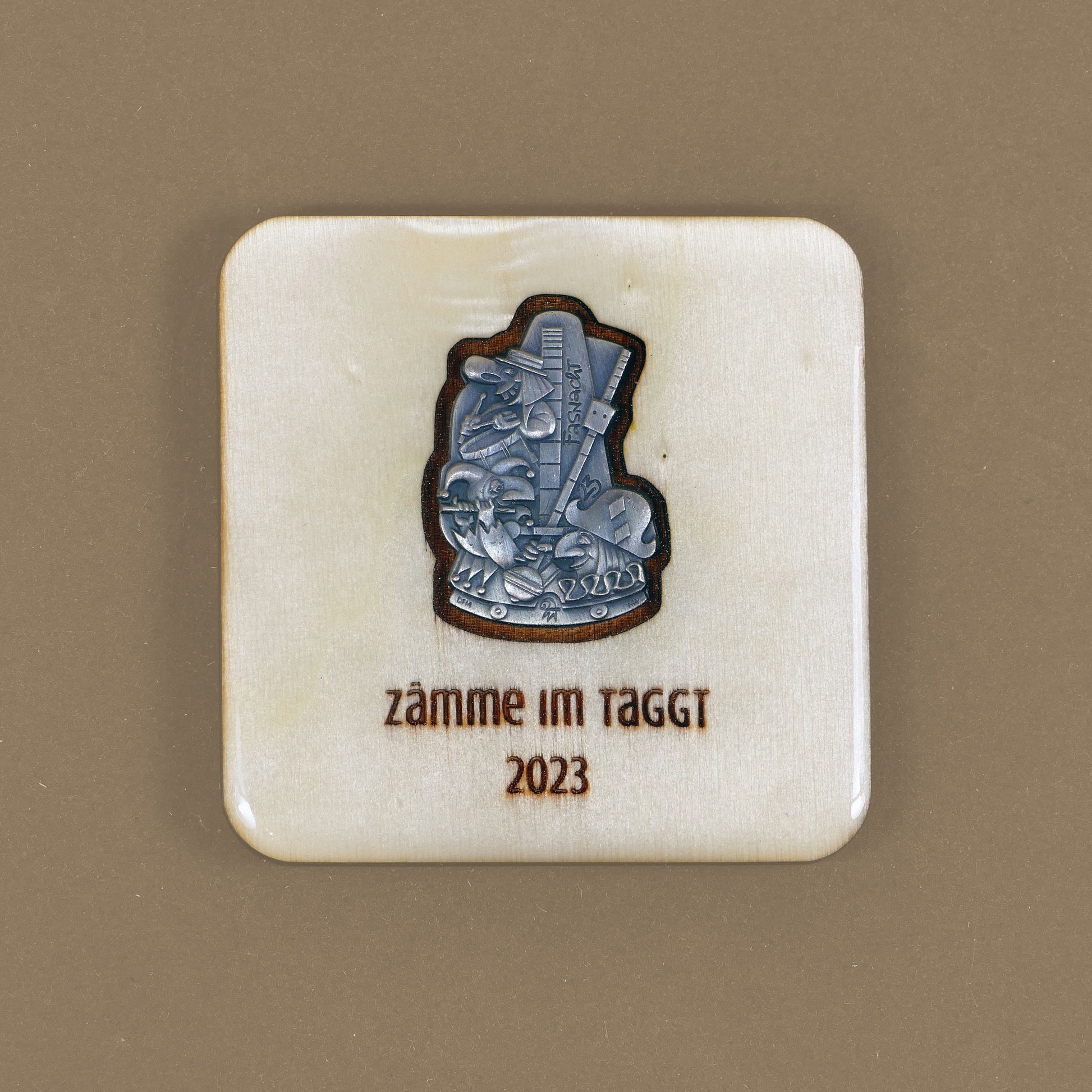 A handcrafted piece featuring a Blaggedde (Basel Fasnacht badge) from 2023. The theme of the year was "Zämme im Taggt" and the Blaggedde was designed by Désiré Felix.