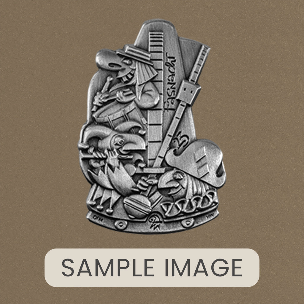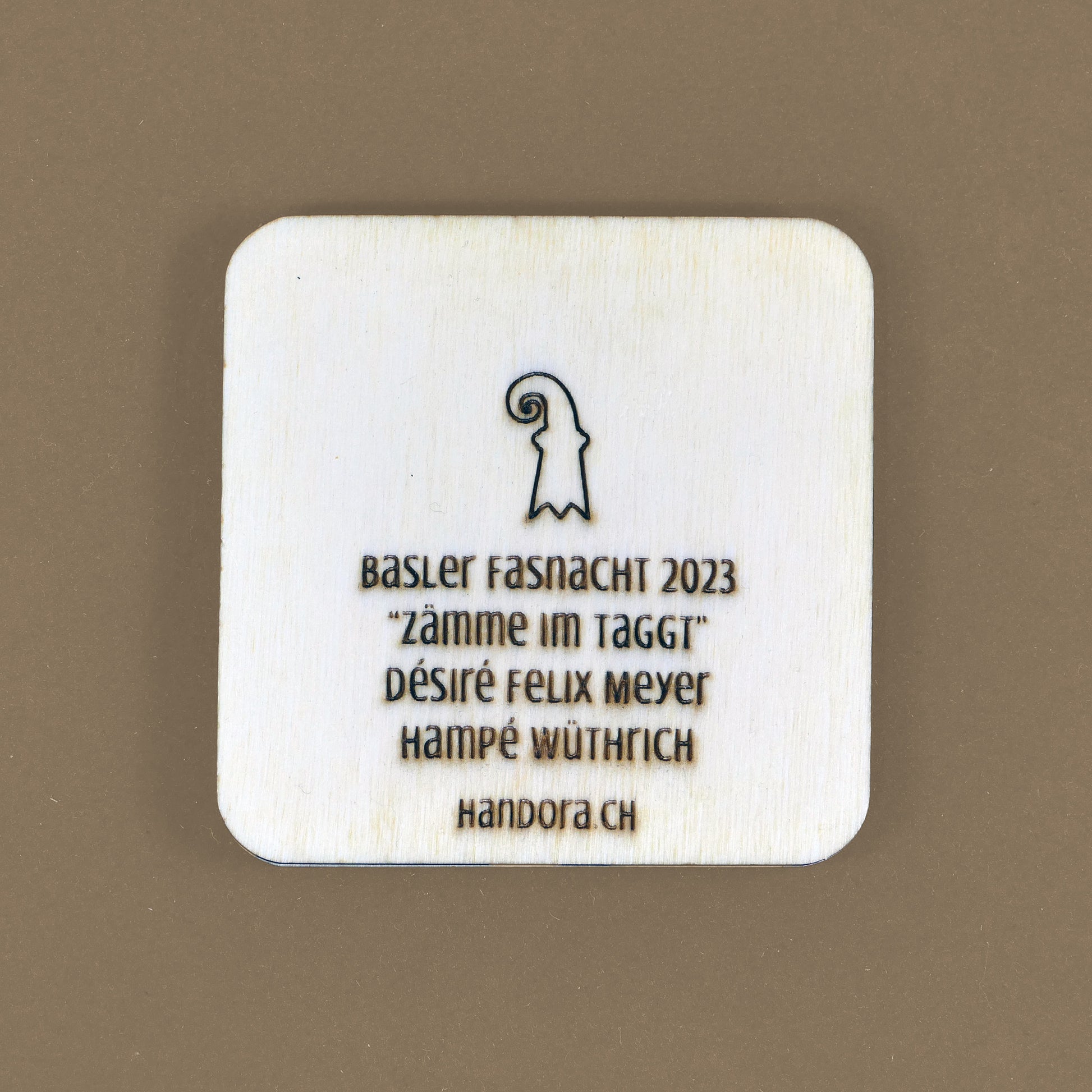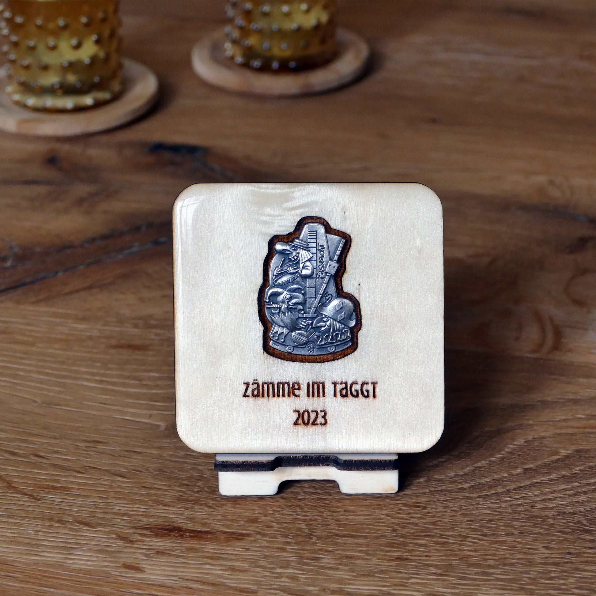 A handcrafted piece featuring a Blaggedde (Basel Fasnacht badge) from 2023. The theme of the year was "Zämme im Taggt" and the Blaggedde was designed by Désiré Felix.